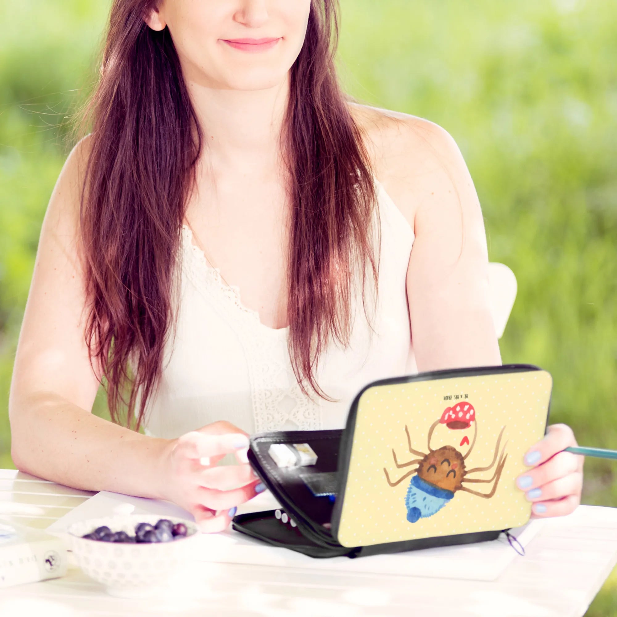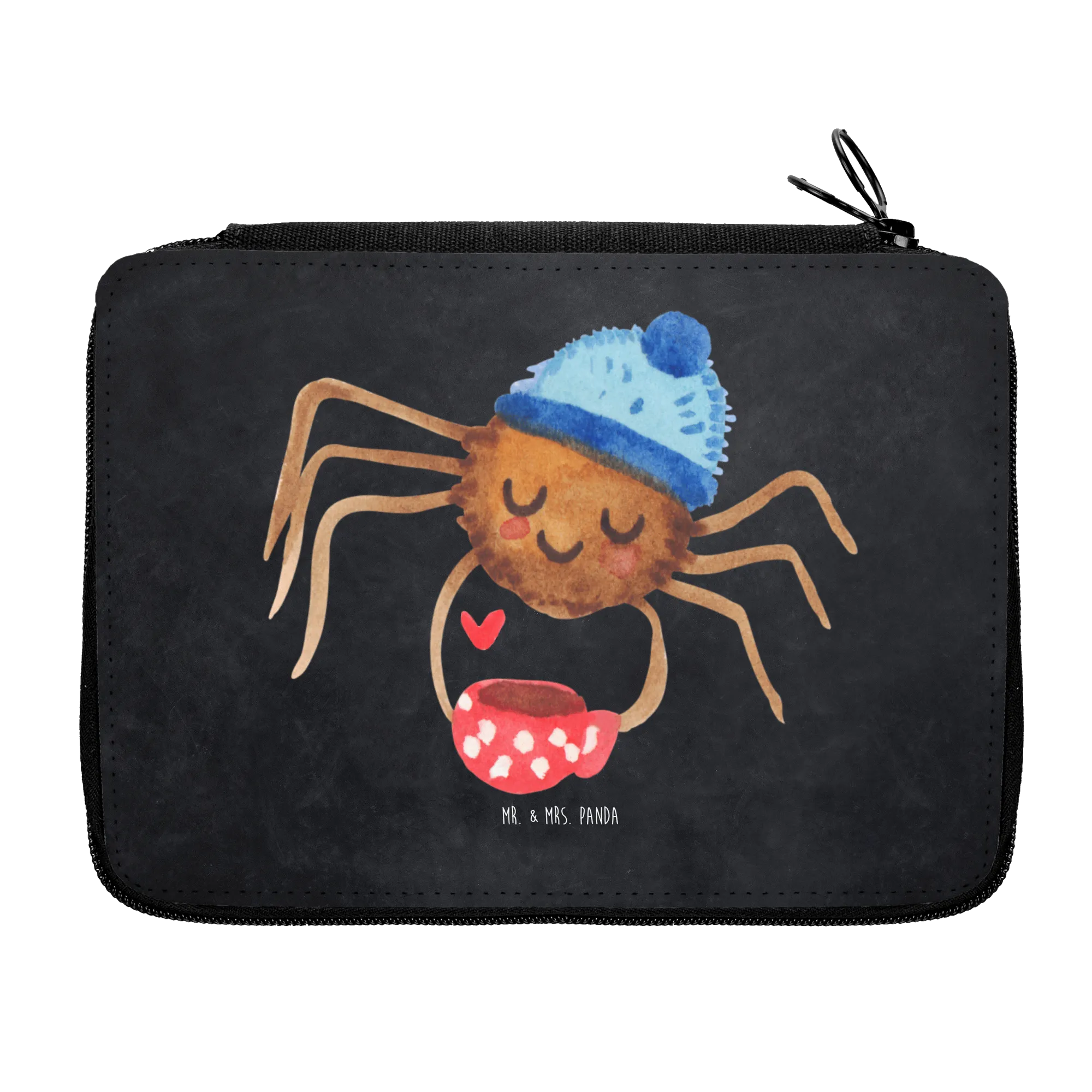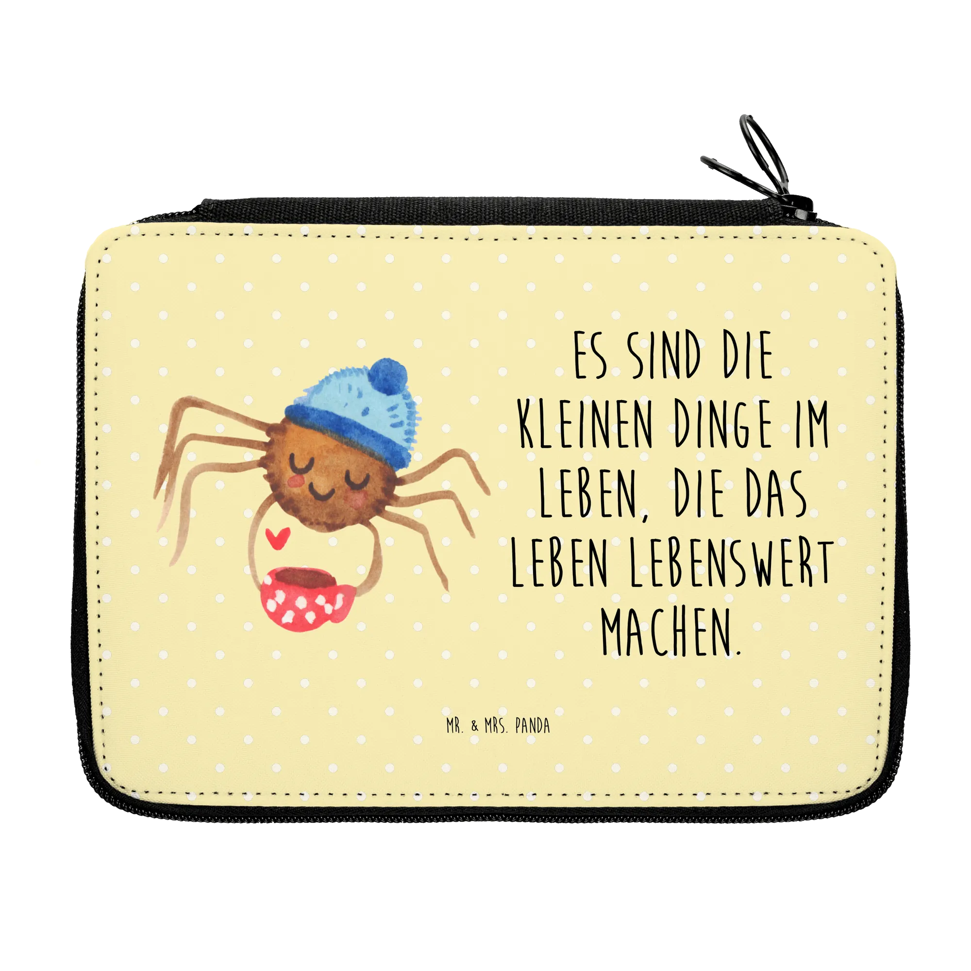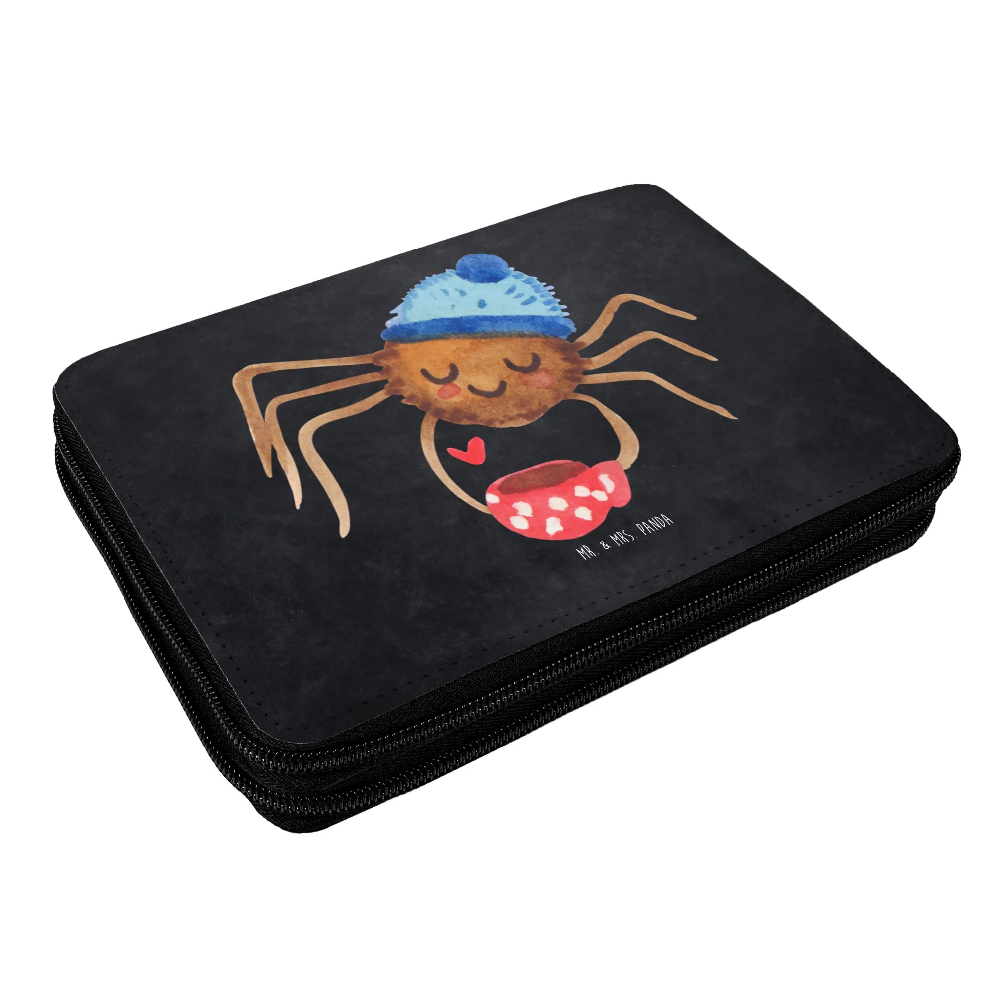 Mit einem liebevoll gestalteten Motiv, das die süße Spinne Agathe zeigt, wie sie genüsslich ihren Kaffee genießt, zieht diese Federmappe alle Blicke auf sich. Sie hat eine fröhliche Wollmütze auf und ein Herz, das die Liebe zu kleinen Dingen im Leben symbolisiert.