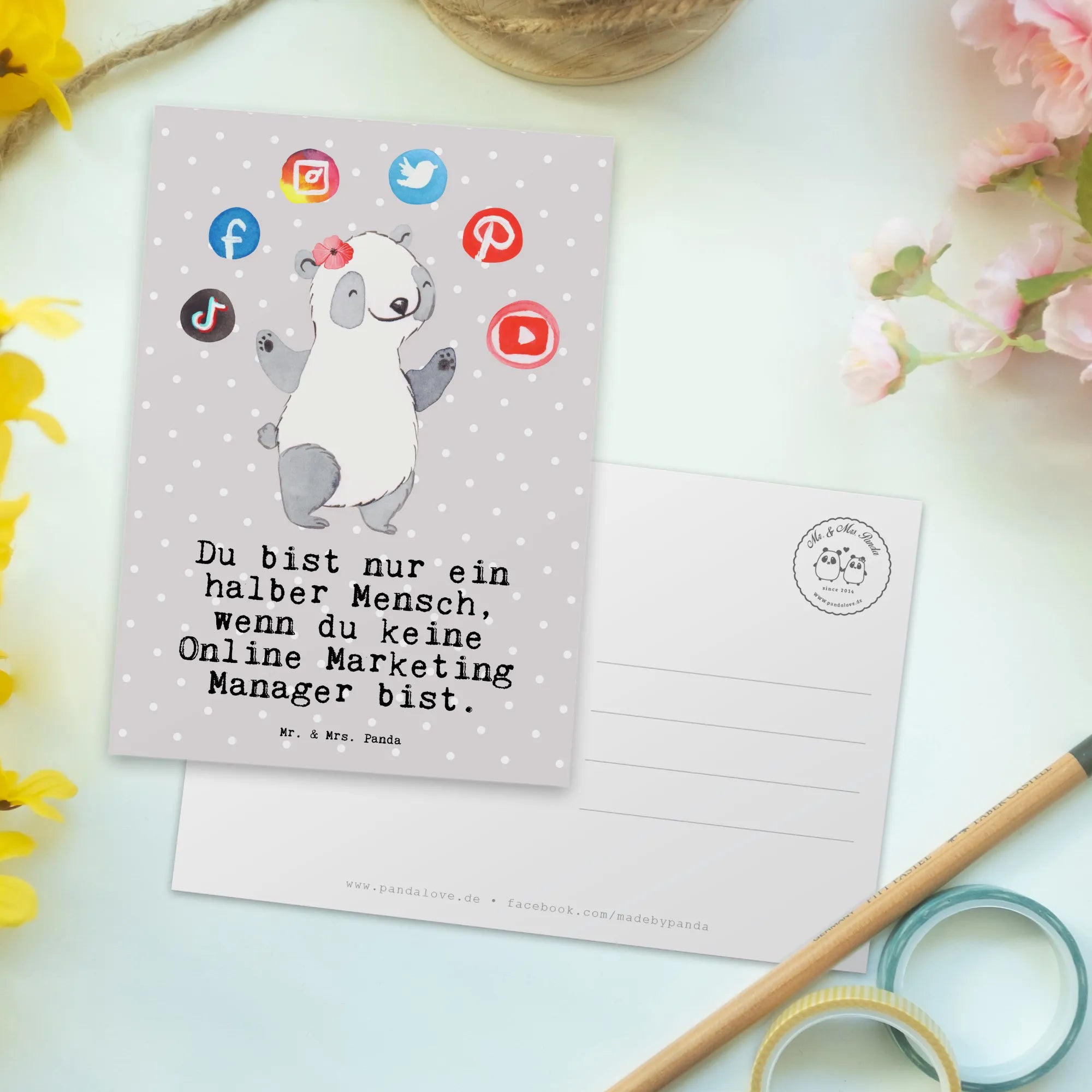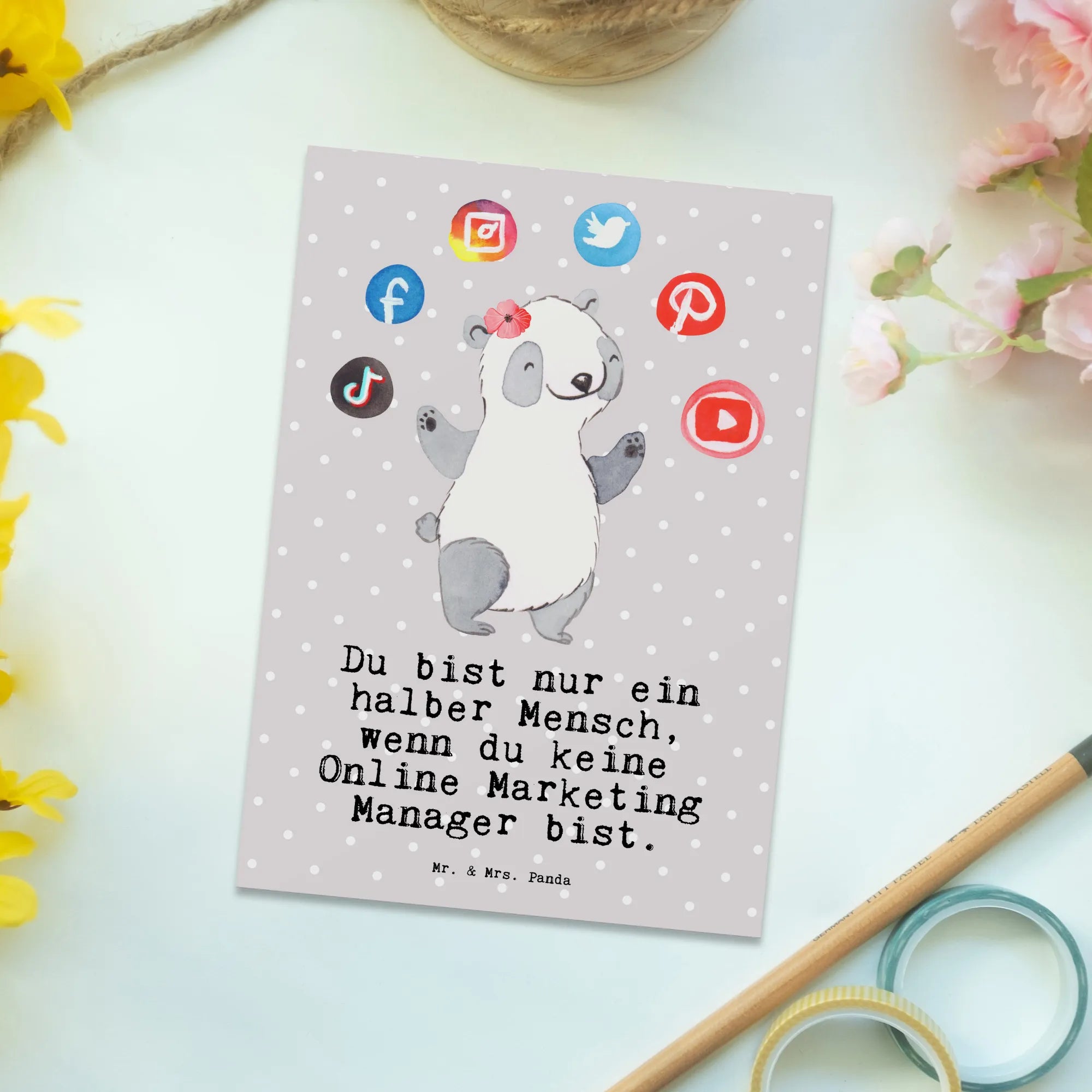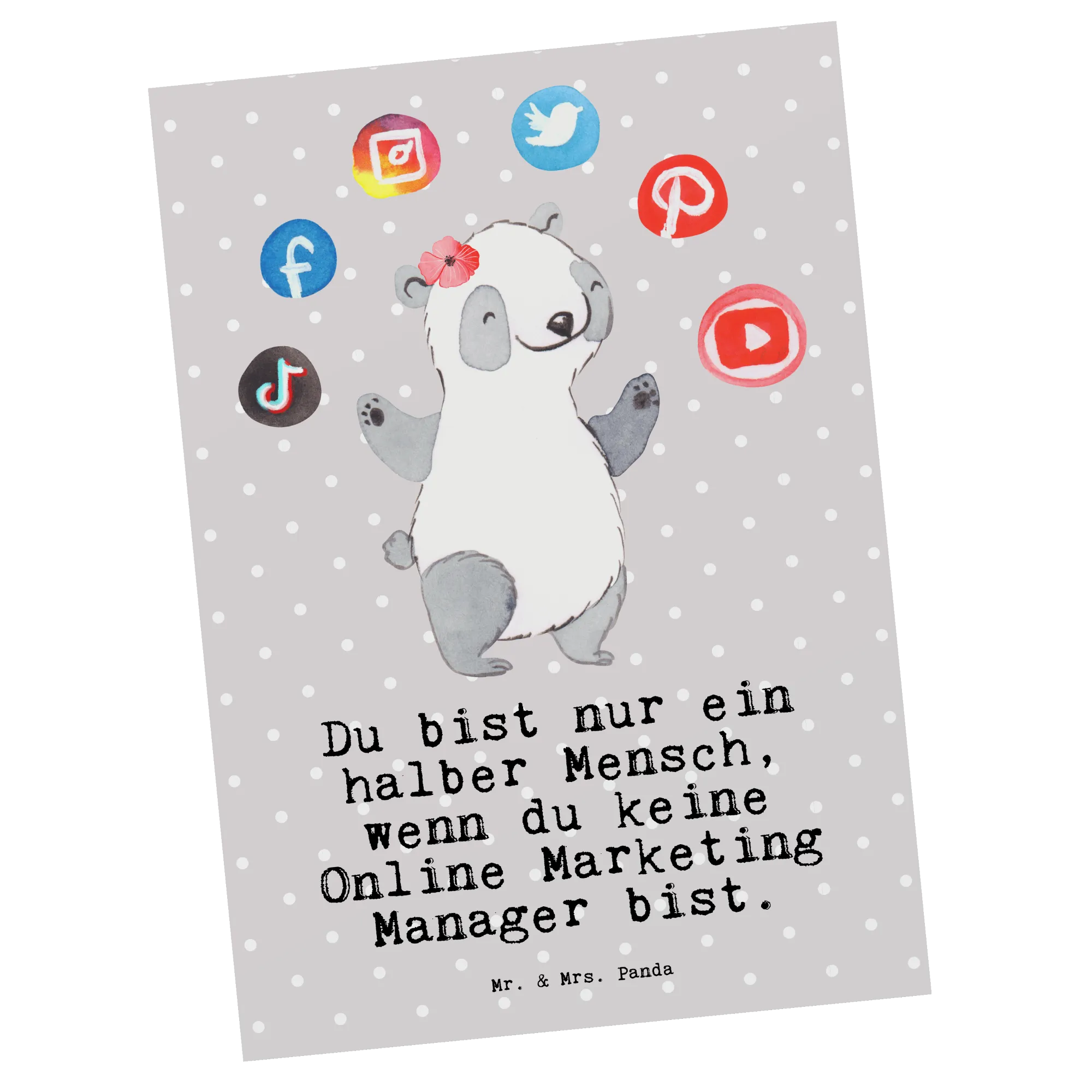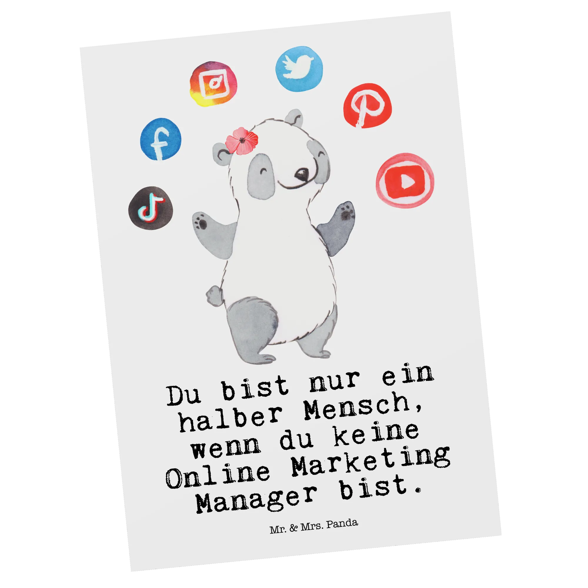 Suchst Du ein Geschenk, das genau ins Schwarze trifft? Unsere Postkarte „Online Marketing Manager mit Herz" von Mr. & Mrs. Panda verbindet liebevolle Illustration mit einem frechen Spruch: „Du bist nur ein halber Mensch, wenn du keine Online Marketing Manager bist." Der süße Panda jongliert mit Social-Media-Icons und bringt so auf den Punkt, was Digital Marketing ausmacht – Kreativität, Einsatz und ein bisschen Chaos mit Herz.