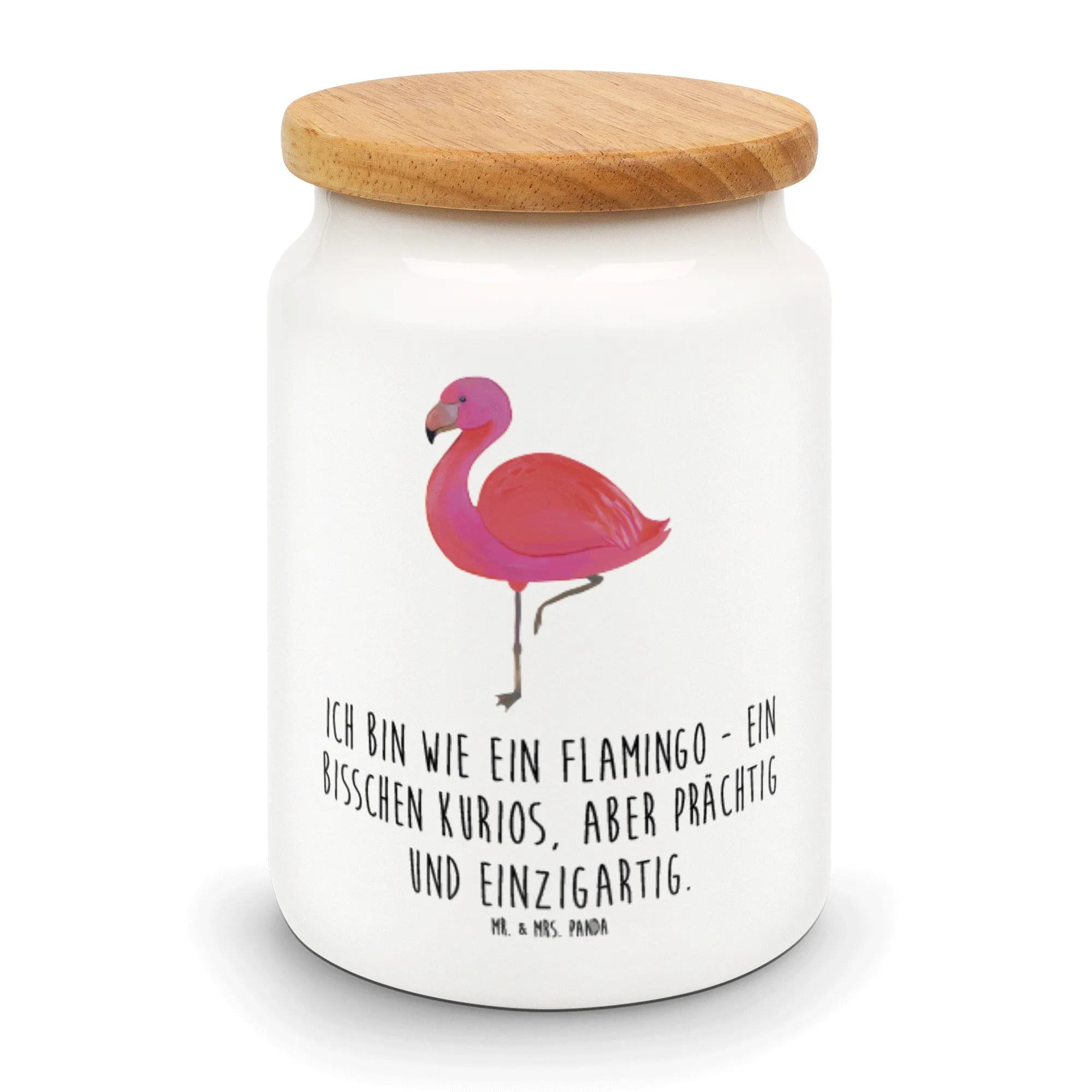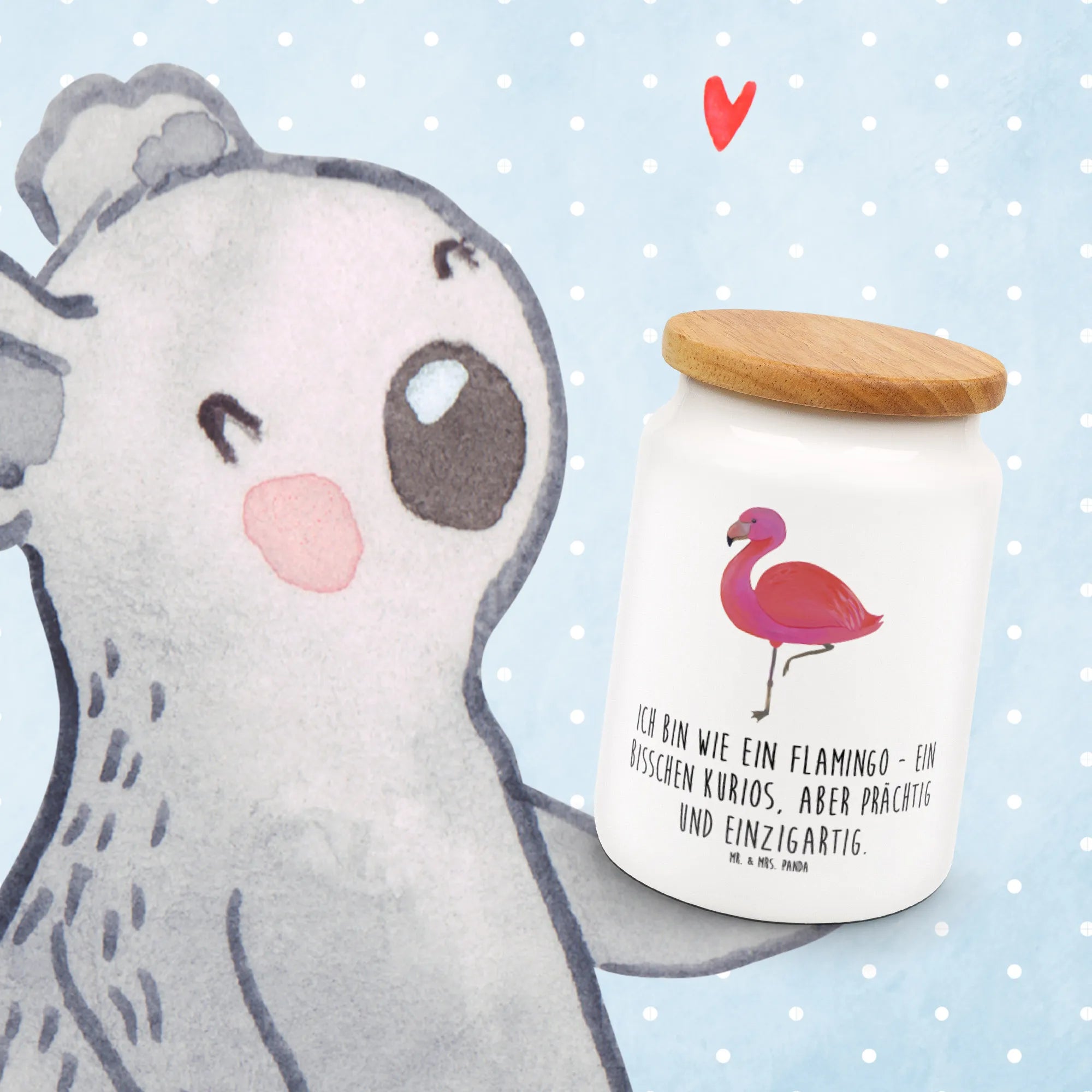 Bring Sommer in Deine Küche! Unsere Vorratsdose Flamingo classic von Mr. & Mrs. Panda ist ein perfektes Zusammenspiel aus Charme und Alltagstauglichkeit. Der liebevoll handgezeichnete Flamingo in Rosa- und Pinktönen strahlt Freundlichkeit und Leichtigkeit aus. Der fröhliche Spruch „Ich bin wie ein Flamingo - ein bisschen kurios, aber prächtig und einzigartig.“ macht die Dose zum idealen Geschenk für alle, die Selbstliebe und Individualität lieben. 🌸