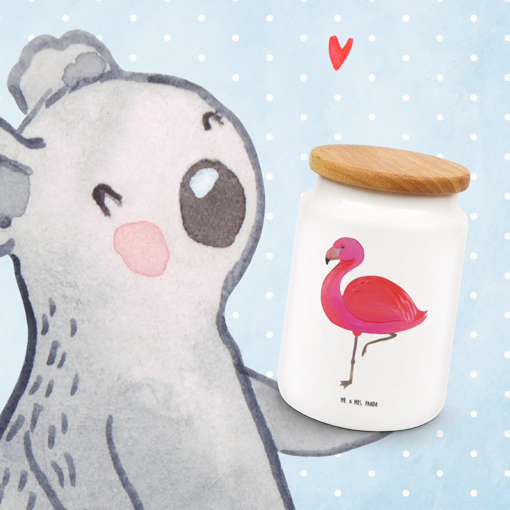 Warum Flamingo classic? Die Flamingo-Kollektion von Mr. & Mrs. Panda wurde von Mrs. Panda handgezeichnet und verbreitet pure Sommerlaune. Unsere Produkte sind nicht personalisierbar, dafür aber mit viel Liebe und Sorgfalt gestaltet. Diese Vorratsdose ist sowohl als einzelnes Highlight als auch im Zusammenspiel mit anderen Vorratsdosen oder Küchendekorationen ein echter Hingucker.