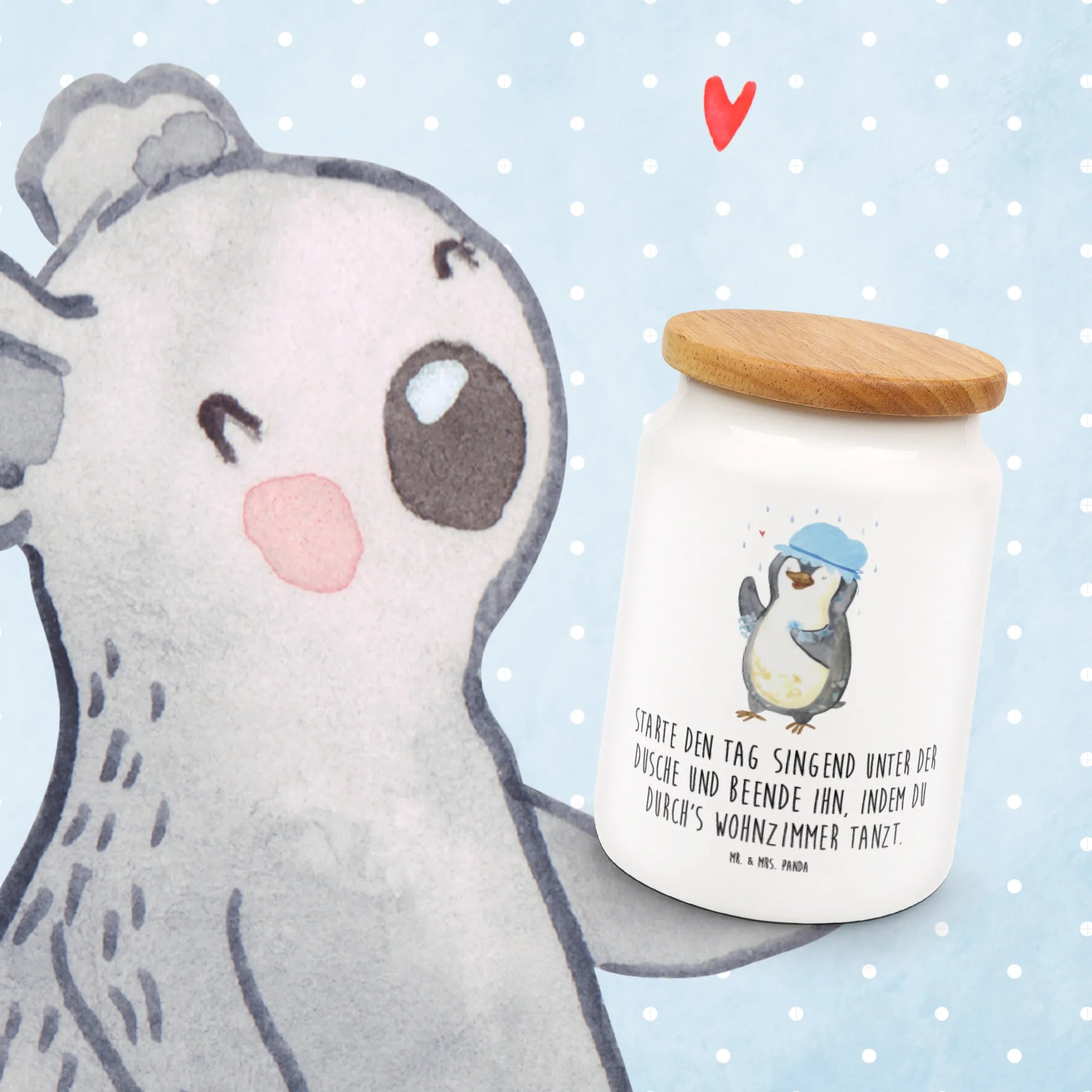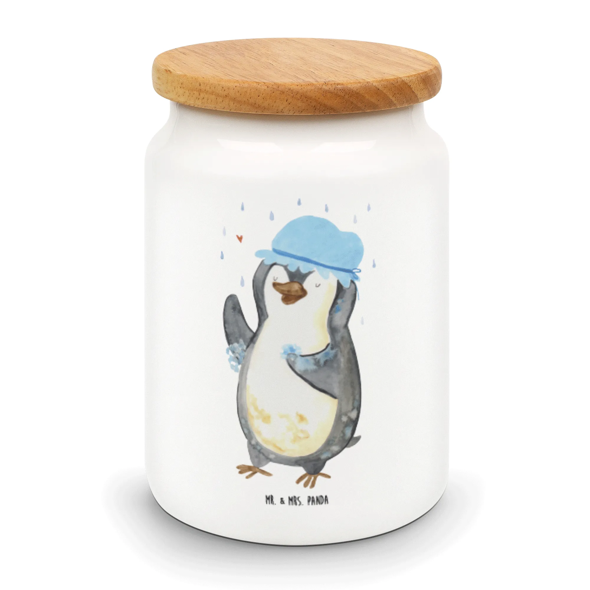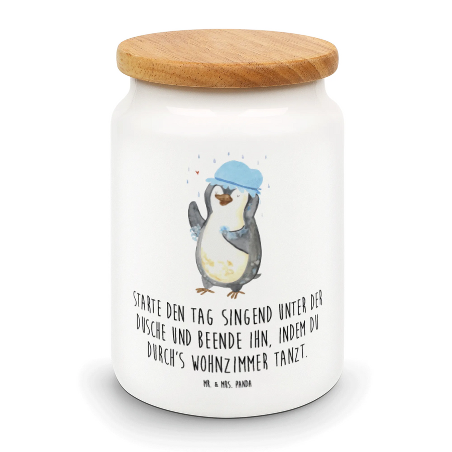 Die liebevoll bedruckte Vorratsdose "Pinguin duscht" aus der zauberhaften Pinguin-Kollektion von Mr. & Mrs. Panda ist das perfekte Geschenk für alle, die Lebensfreude und ein Lächeln lieben! Diese faszinierende Keramikdose überzeugt nicht nur durch ihr humorvolles Design, sondern auch durch ihre Funktionalität. Der fröhliche Pinguin, der unter einem Regenschauer mit Duschhaube steht, wird Klein und Groß gleichermaßen zum Schmunzeln bringen.