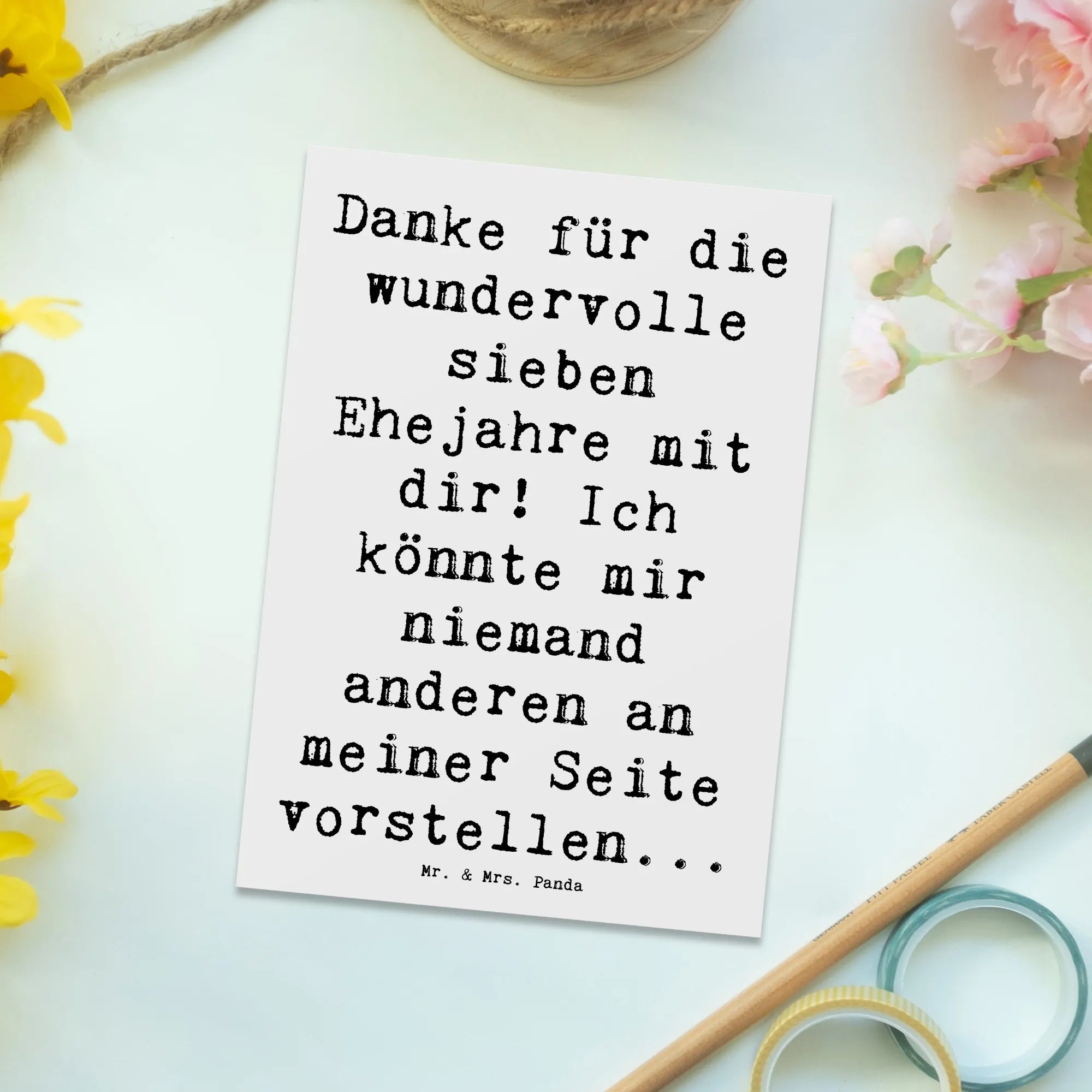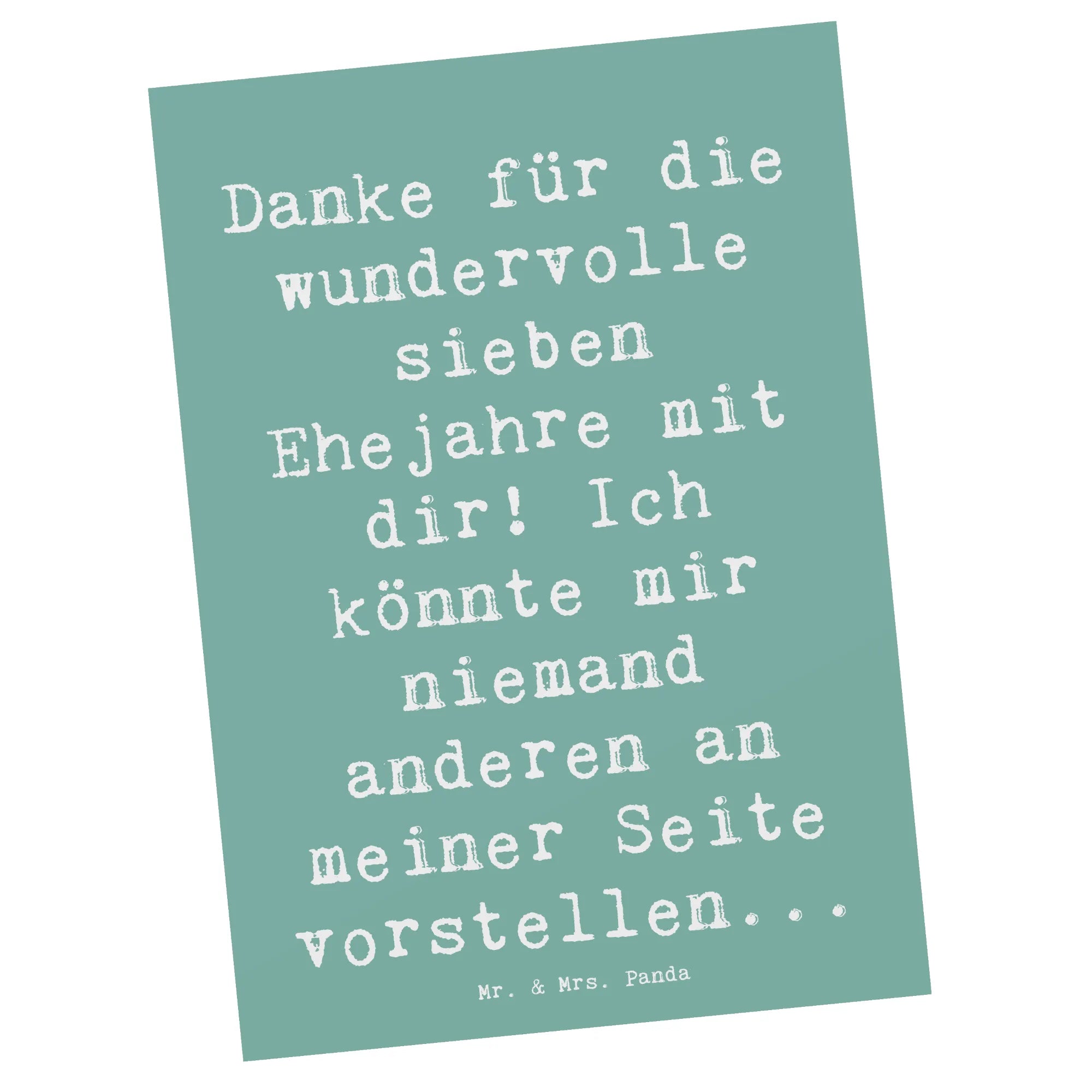 Feiere einen besonderen Meilenstein mit unserer besonderen Postkarte von Mr. & Mrs. Panda zur 7. Hochzeitstag oder Kupferhochzeit. Diese Karte ist mit einem liebevollen Spruch bedruckt und ideal, um jemandem eine Freude zu machen. Auf der Vorderseite glänzt die Karte schön und die matte Rückseite erleichtert das Beschriften. Perfekt für besondere Anlässe wie Hochzeiten, Taufen oder Geburtstage.