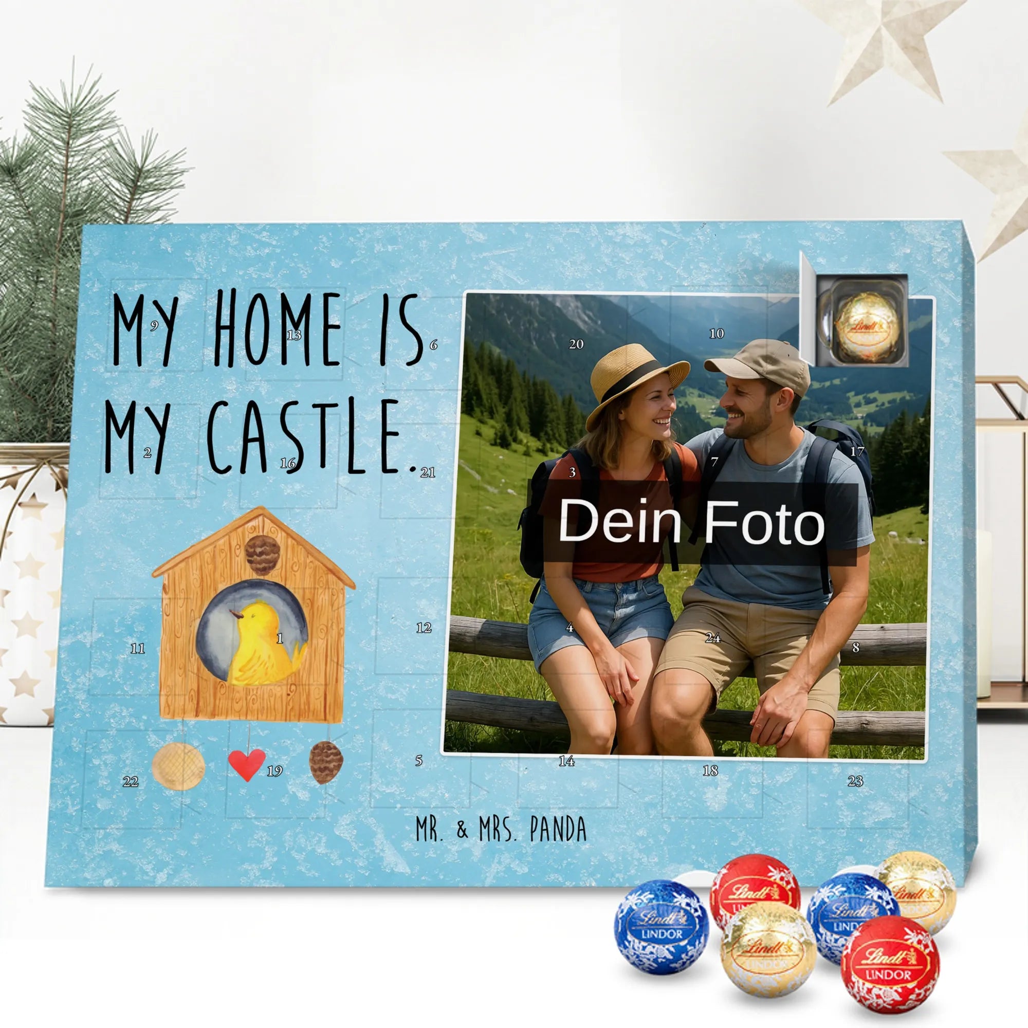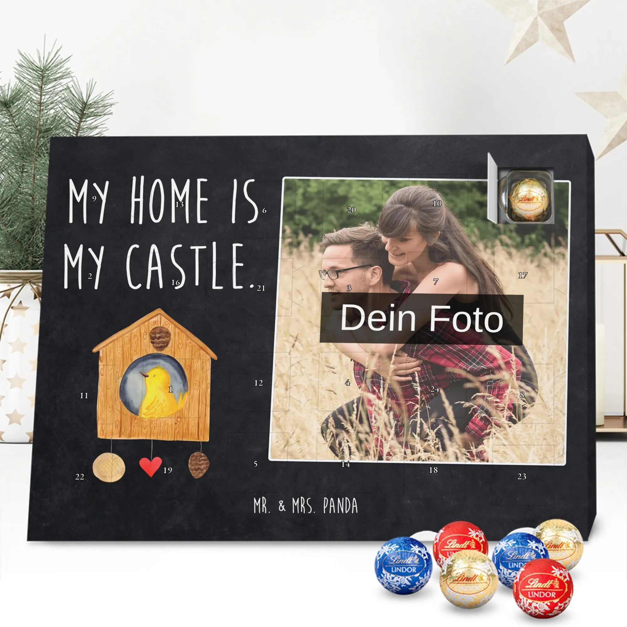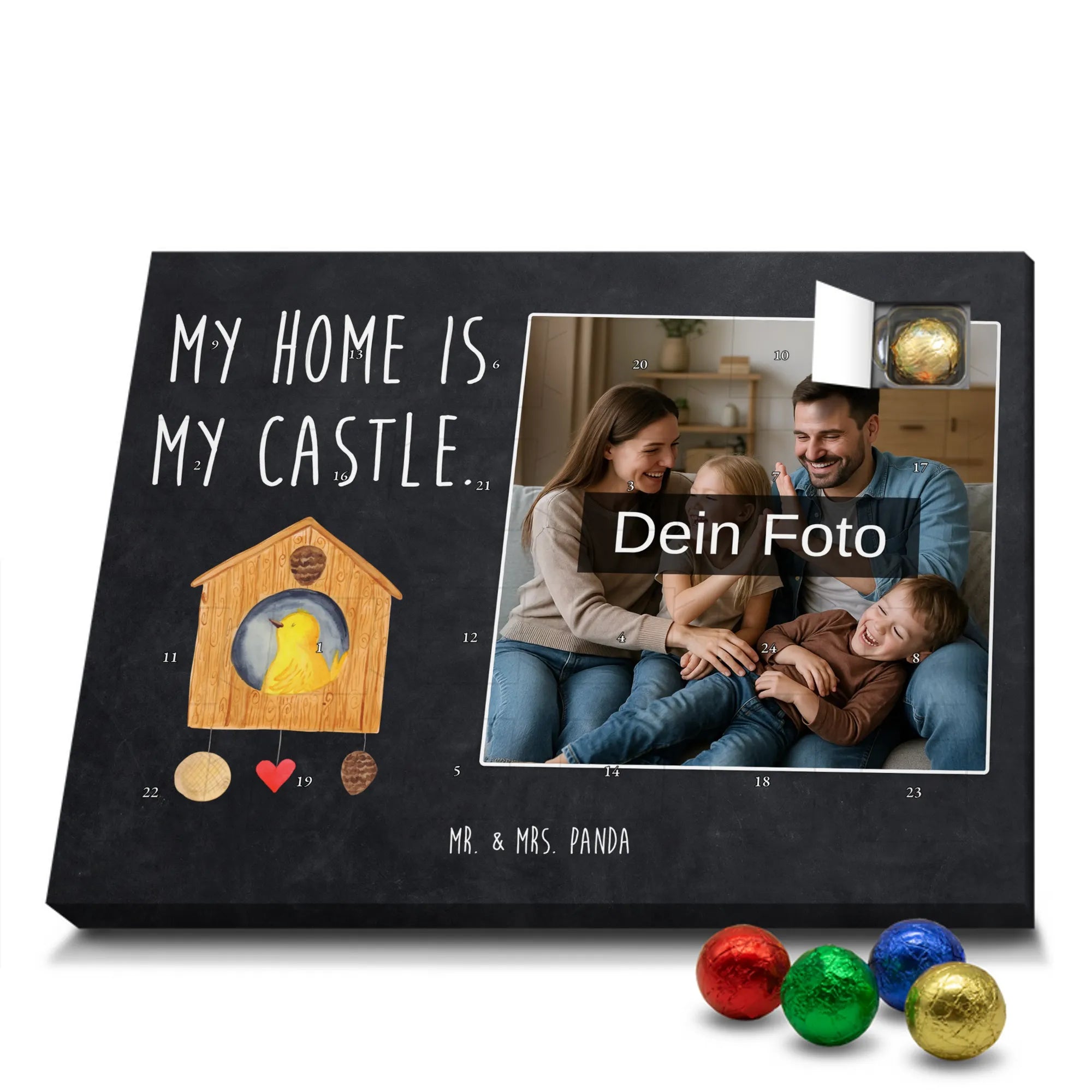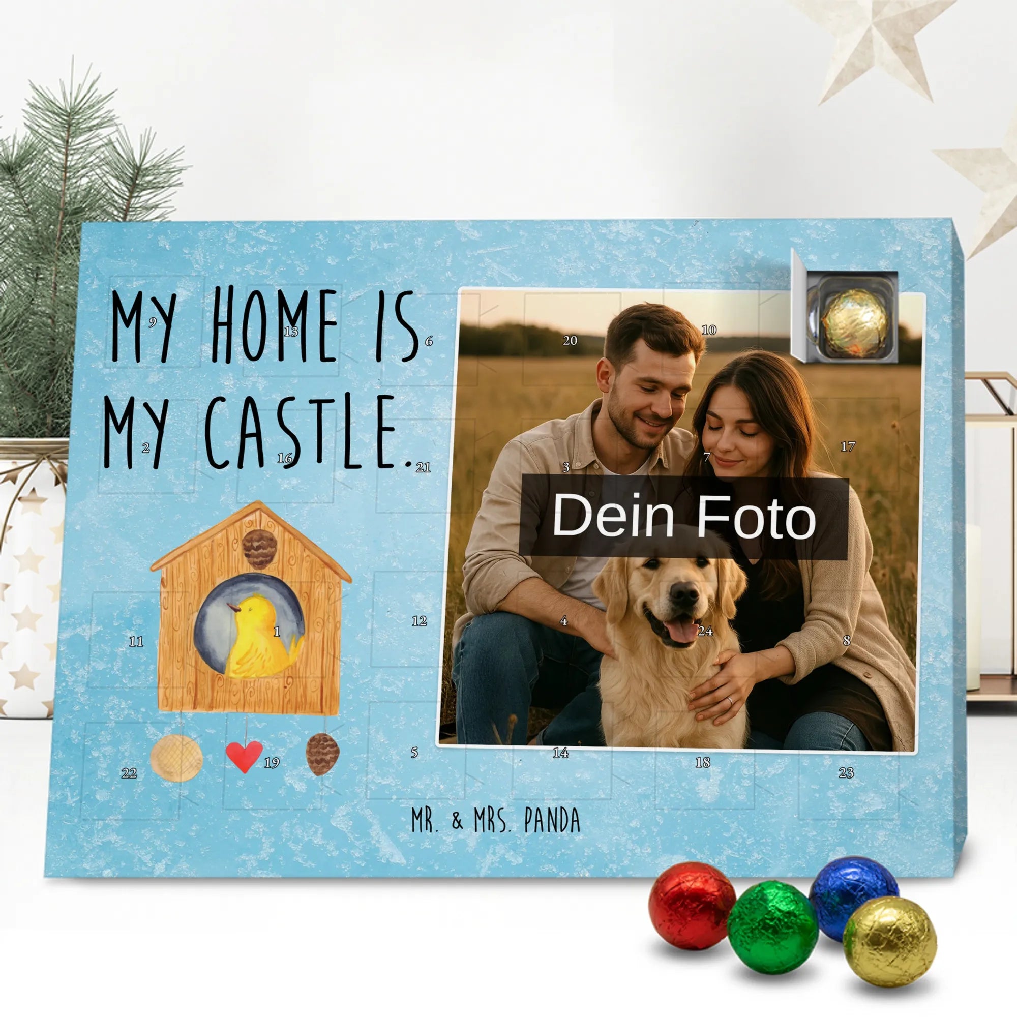 Personalisierter Schoko Foto Adventskalender Vogelhaus aus der liebevollen Small World Kollektion von Mr. & Mrs. Panda – perfekt für alle, die Weihnachten mit Herz und einem Hauch Natur feiern möchten. Auf dem Motiv sitzt ein fröhlicher gelber Vogel in einem gemütlichen Vogelhäuschen. Der dazugehörige Spruch „My home is my castle.“ macht den Kalender zum charmanten Zeichen für Geborgenheit und Lieblingsorte. 🎄