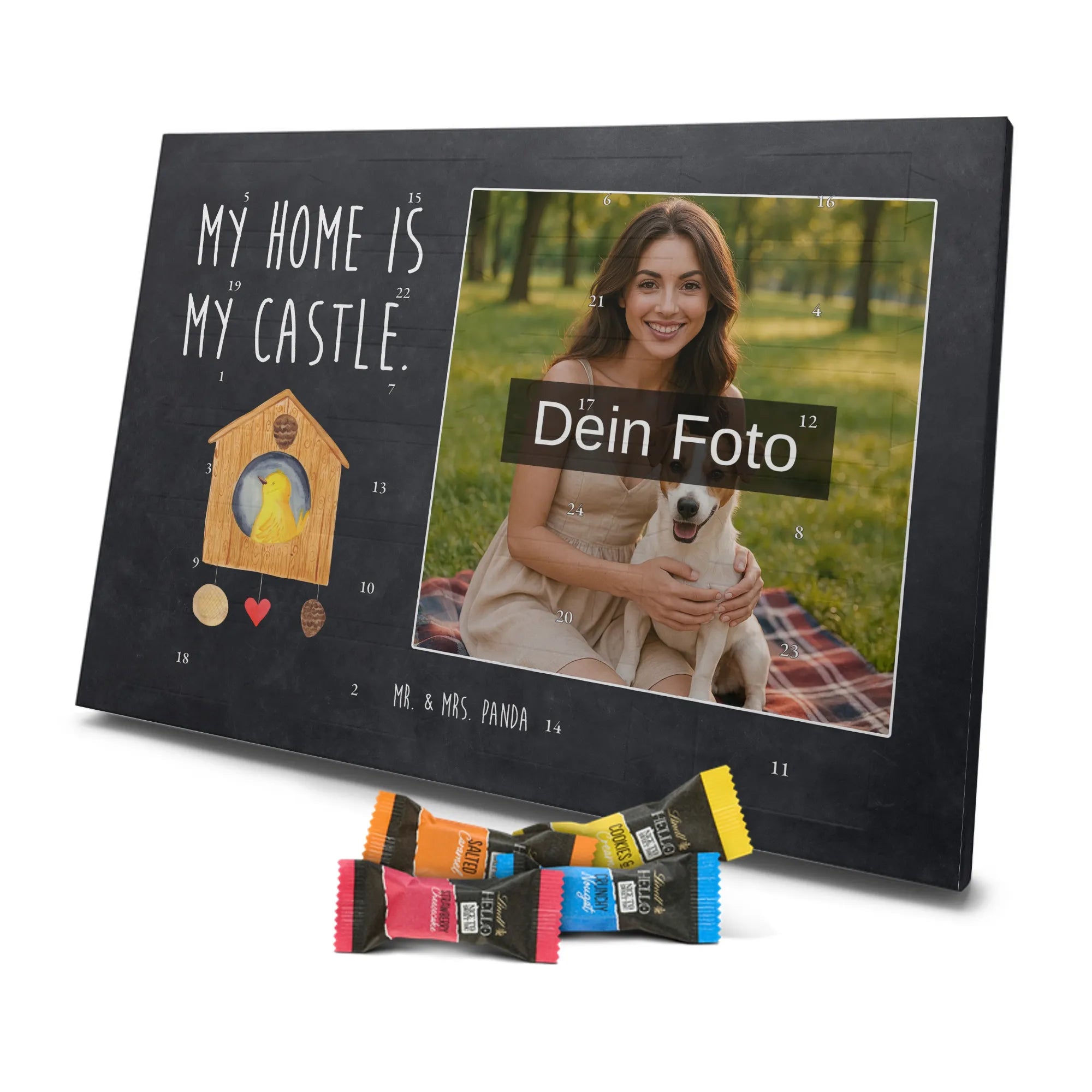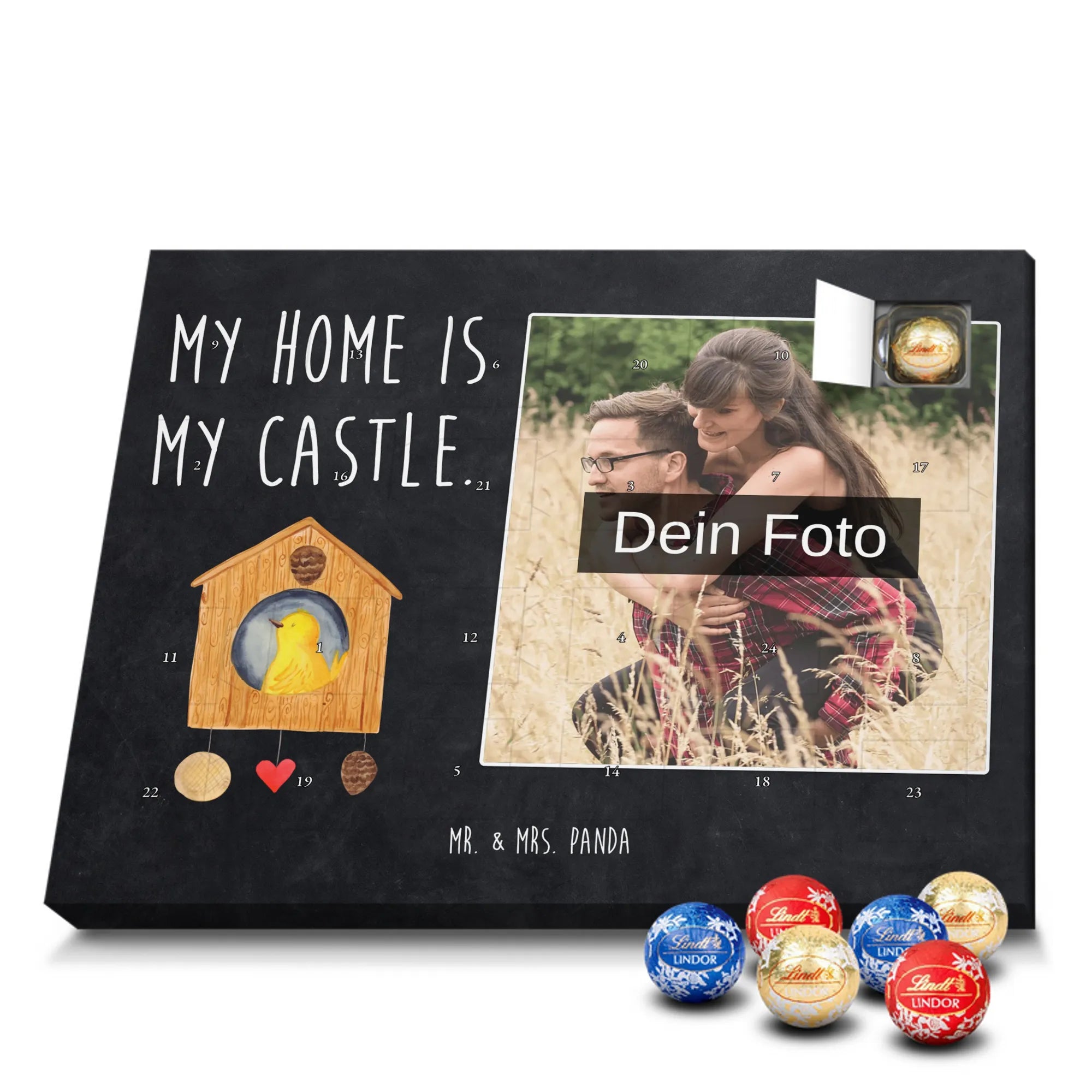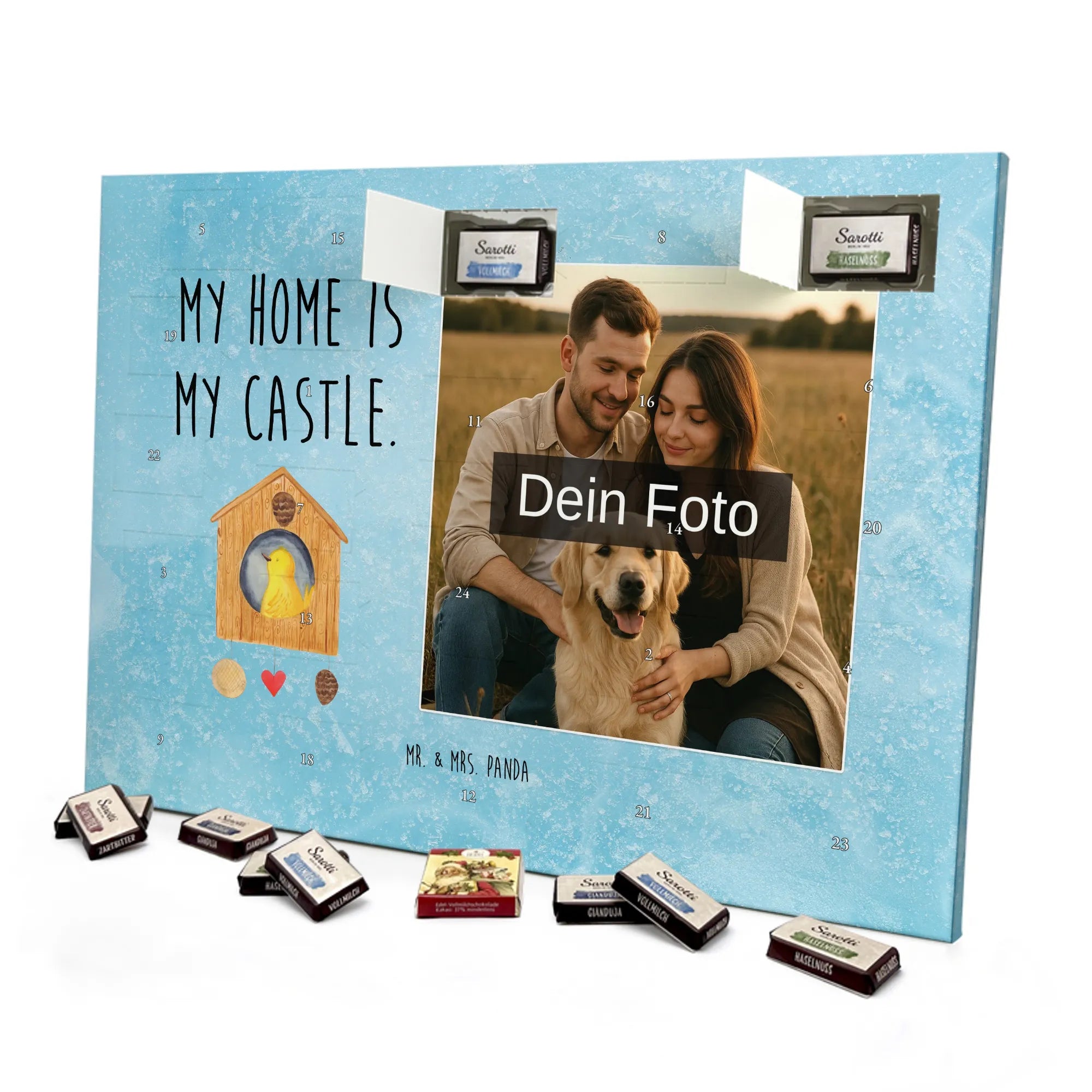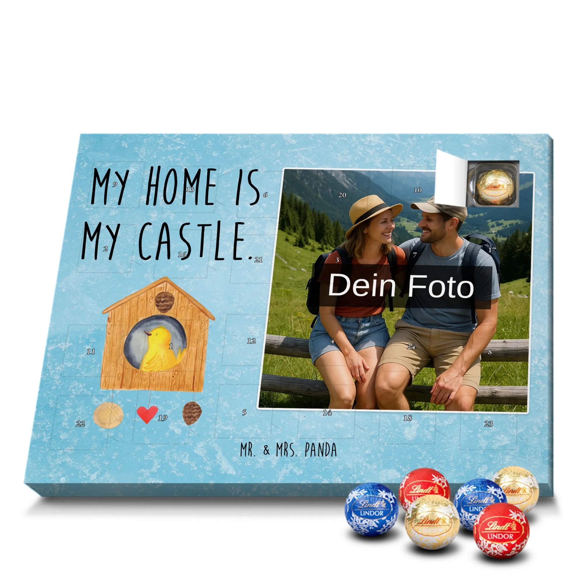 Personalisierter Schoko Foto Adventskalender Vogelhaus aus der liebevollen Small World Kollektion von Mr. & Mrs. Panda – perfekt für alle, die Weihnachten mit Herz und einem Hauch Natur feiern möchten. Auf dem Motiv sitzt ein fröhlicher gelber Vogel in einem gemütlichen Vogelhäuschen. Der dazugehörige Spruch „My home is my castle.“ macht den Kalender zum charmanten Zeichen für Geborgenheit und Lieblingsorte. 🎄
