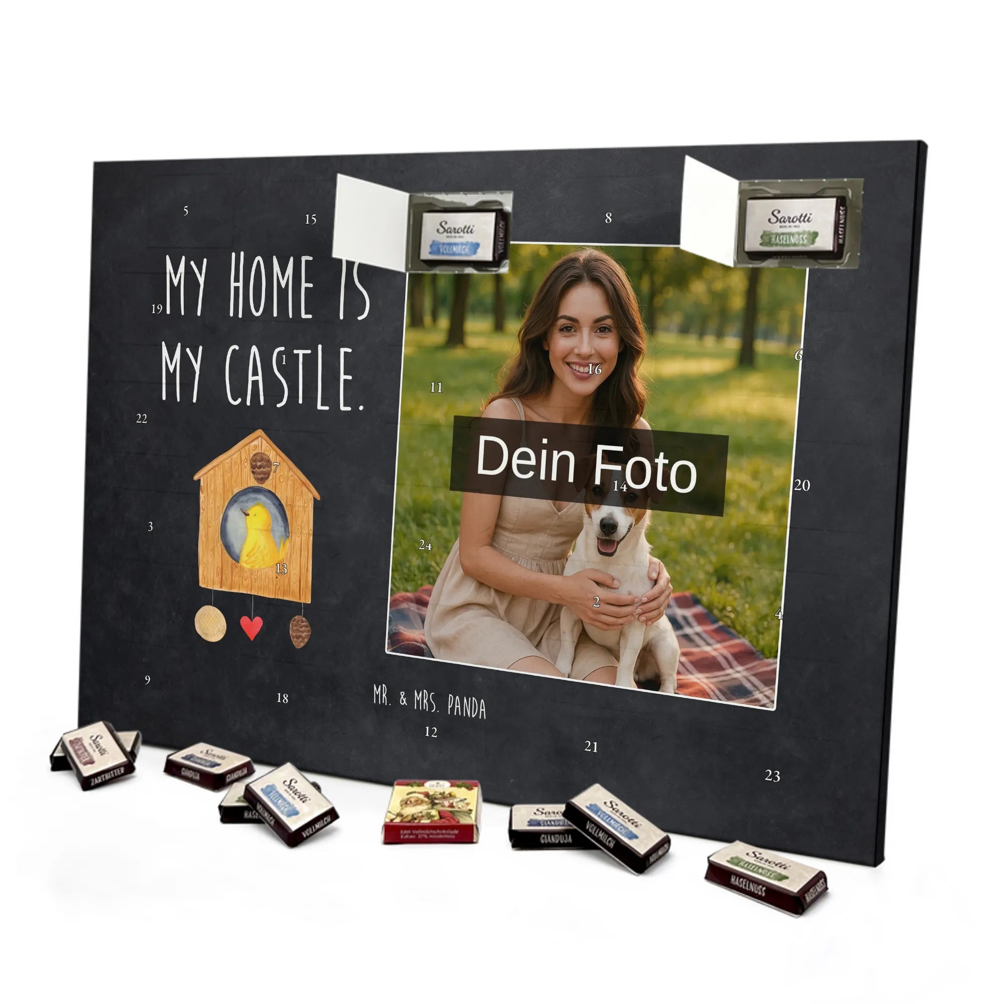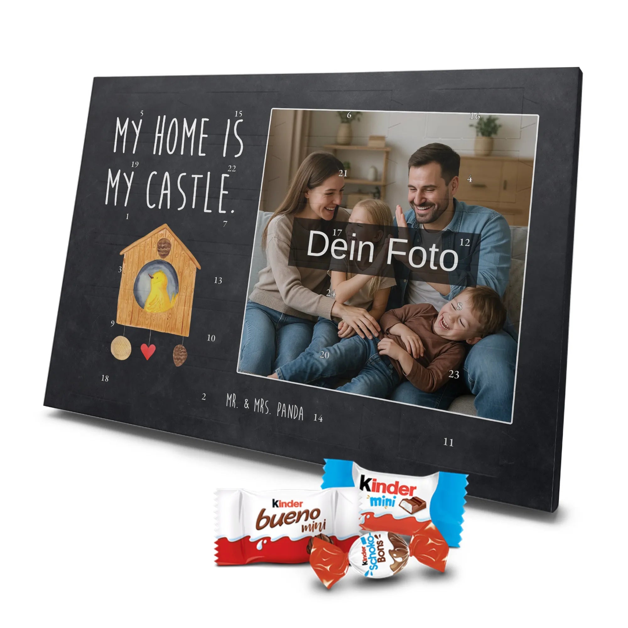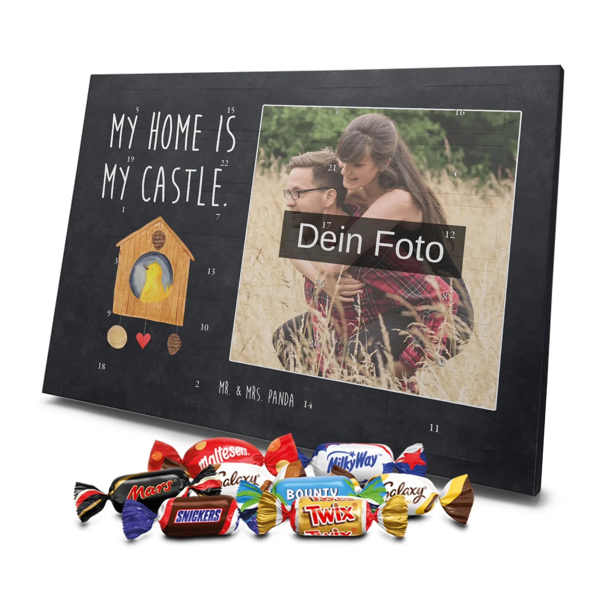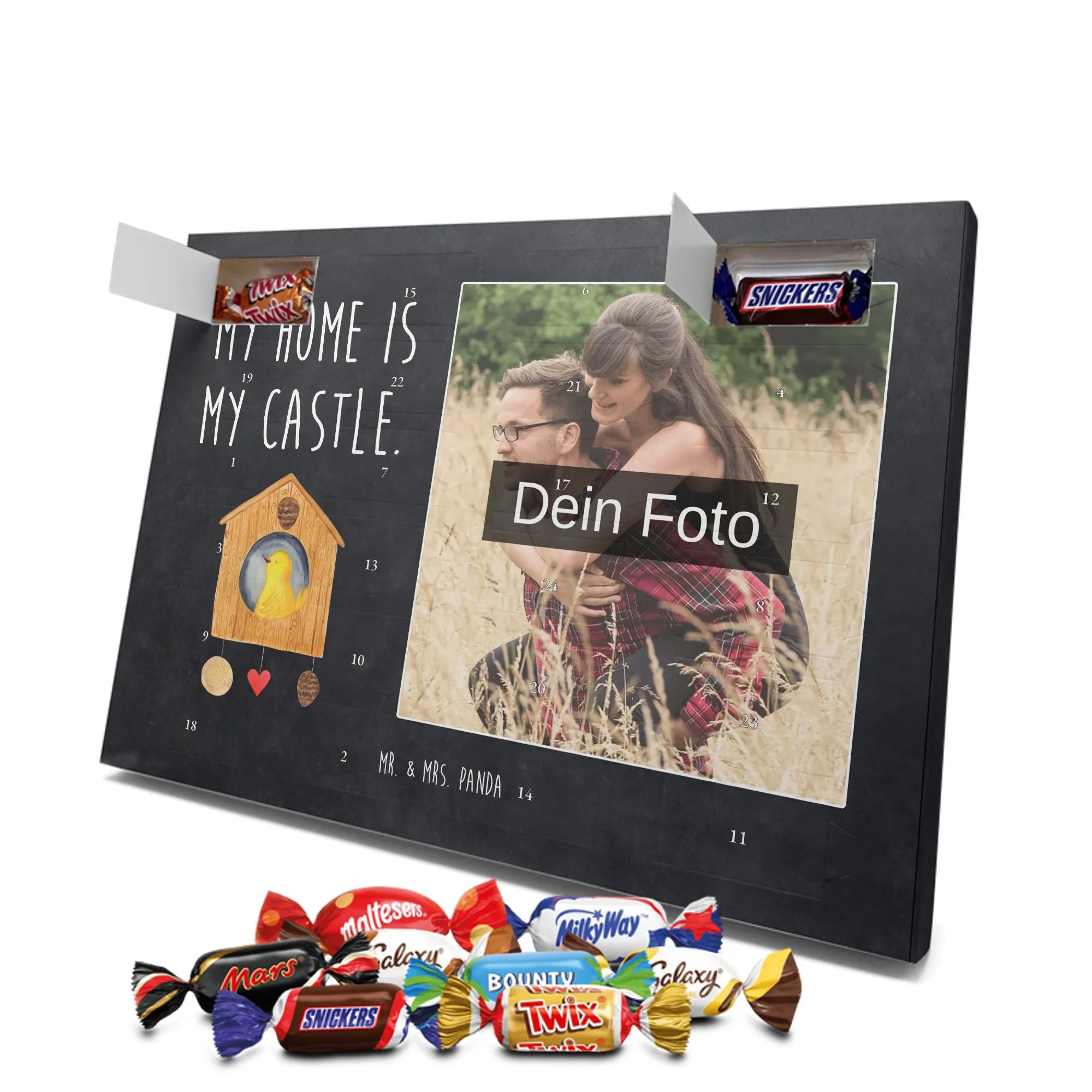 Personalisierter Schoko Foto Adventskalender Vogelhaus aus der liebevollen Small World Kollektion von Mr. & Mrs. Panda – perfekt für alle, die Weihnachten mit Herz und einem Hauch Natur feiern möchten. Auf dem Motiv sitzt ein fröhlicher gelber Vogel in einem gemütlichen Vogelhäuschen. Der dazugehörige Spruch „My home is my castle.“ macht den Kalender zum charmanten Zeichen für Geborgenheit und Lieblingsorte. 🎄