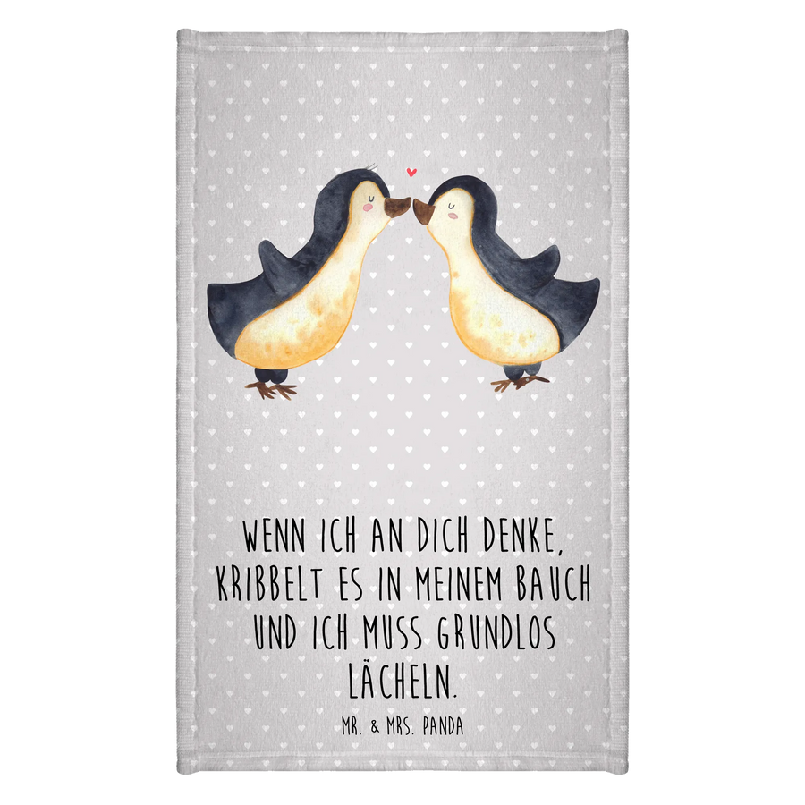 Das perfekte Gäste Handtuch von Mr. & Mrs. Panda! Mit seinem niedlichen Pinguin-Motiv, das zwei Pinguine zeigt, die sich zärtlich küssen, bringt dieses Handtuch nicht nur Farbe, sondern auch viel Liebe in jedes Badezimmer.