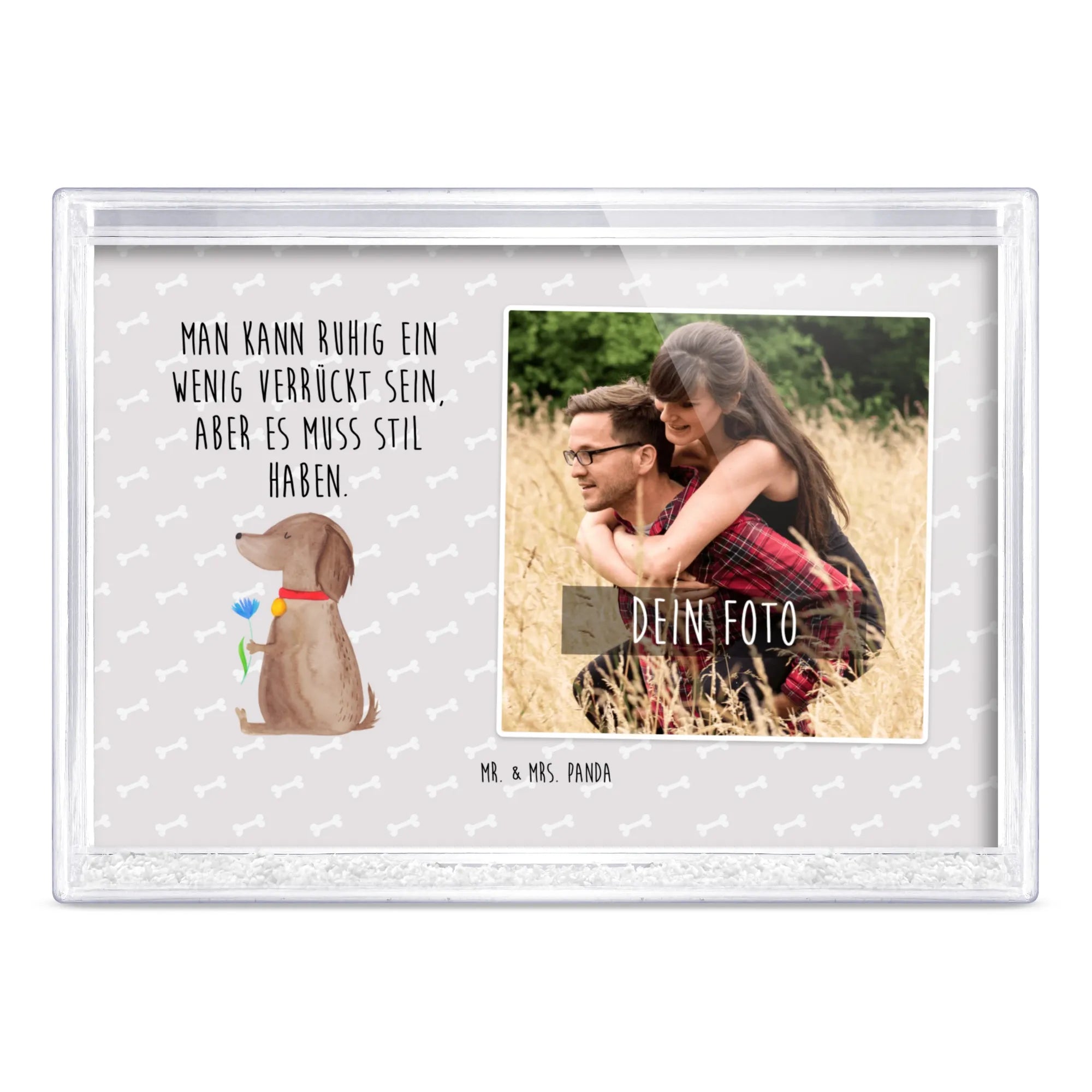 Der Schüttelrahmen mit Foto "Hund Blume" aus der einzigartigen Hunde Kollektion von Mr. & Mrs. Panda ist das perfekte Geschenk für jeden Hundeliebhaber. Wenn Du auf der Suche nach einer besonderen Möglichkeit bist, Deine Liebe zu Deinem treuen Vierbeiner auszudrücken oder einfach nur ein zauberhaftes Stück Deko für Dein Zuhause möchtest, dann ist dieser Bilderrahmen genau das Richtige für Dich!