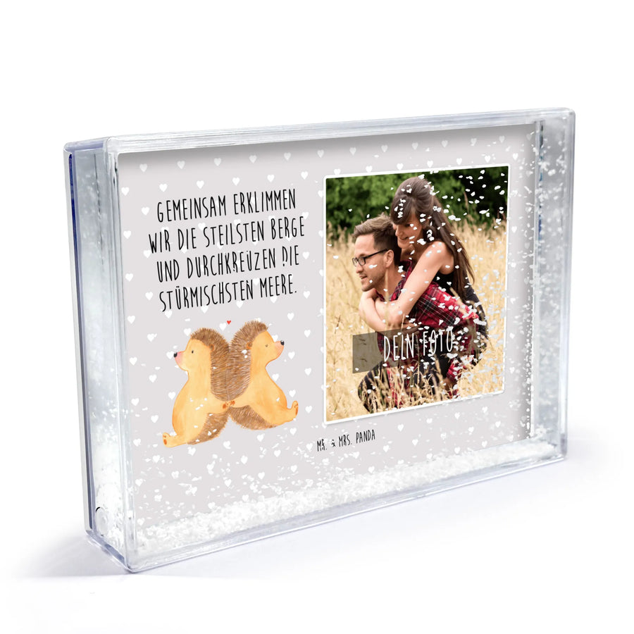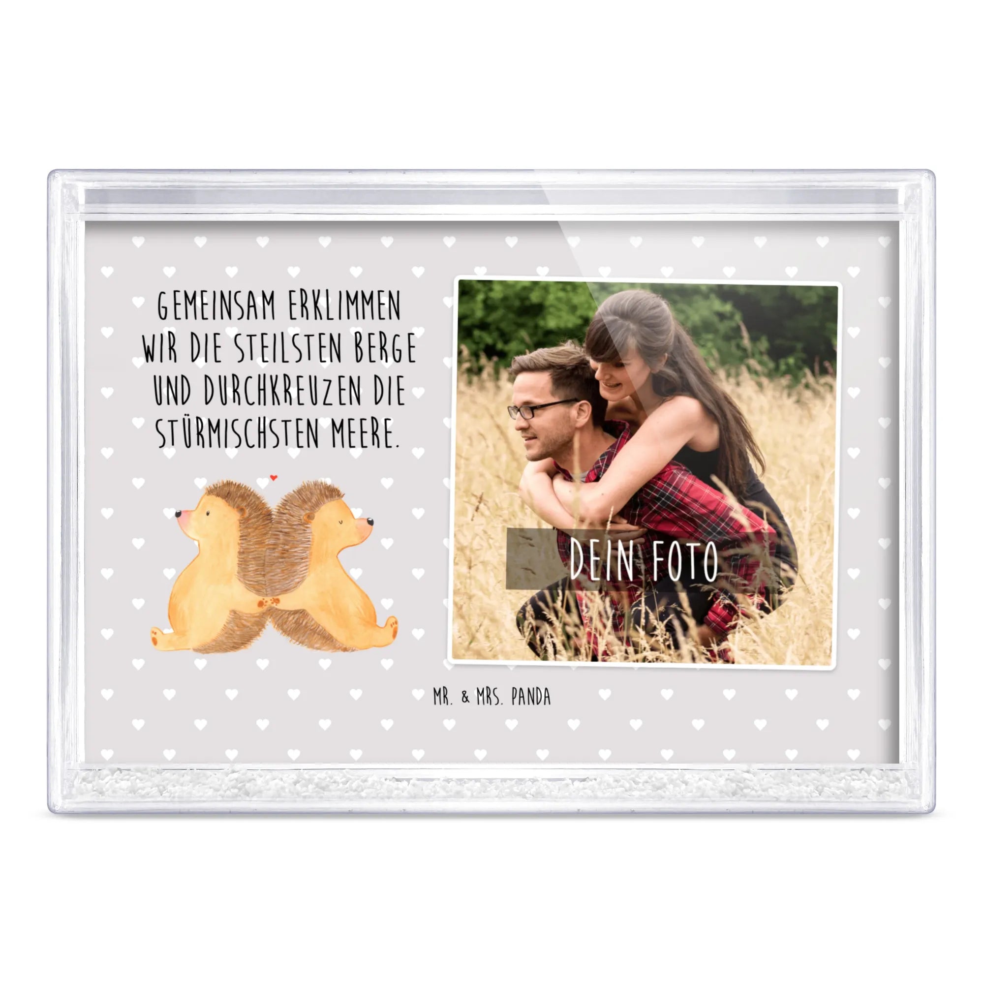 Der Schüttelrahmen mit Foto "Igel händchenhaltend" aus der Kollektion Liebe von Mr. & Mrs. Panda ist das ideale Fotogeschenk für jeden, der seine Liebe zum Ausdruck bringen möchte. Stell dir vor, wie du ein wunderbares Paar an einem besonderen Tag, wie zum Jahrestag oder zur Hochzeit, mit diesem zauberhaften Bilderrahmen beschenkst. Die zwei liebevollen Igel, die sich an den Flossen halten, symbolisieren Verbundenheit und Zuneigung in einer einzigartigen und niedlichen Art und Weise. Mit dem inspirierenden Slogan "Gemeinsam erklimmen wir die steilsten Berge und durchkreuzen die stürmischsten Meere" wird jedes unvergessliche Moment festgehalten.