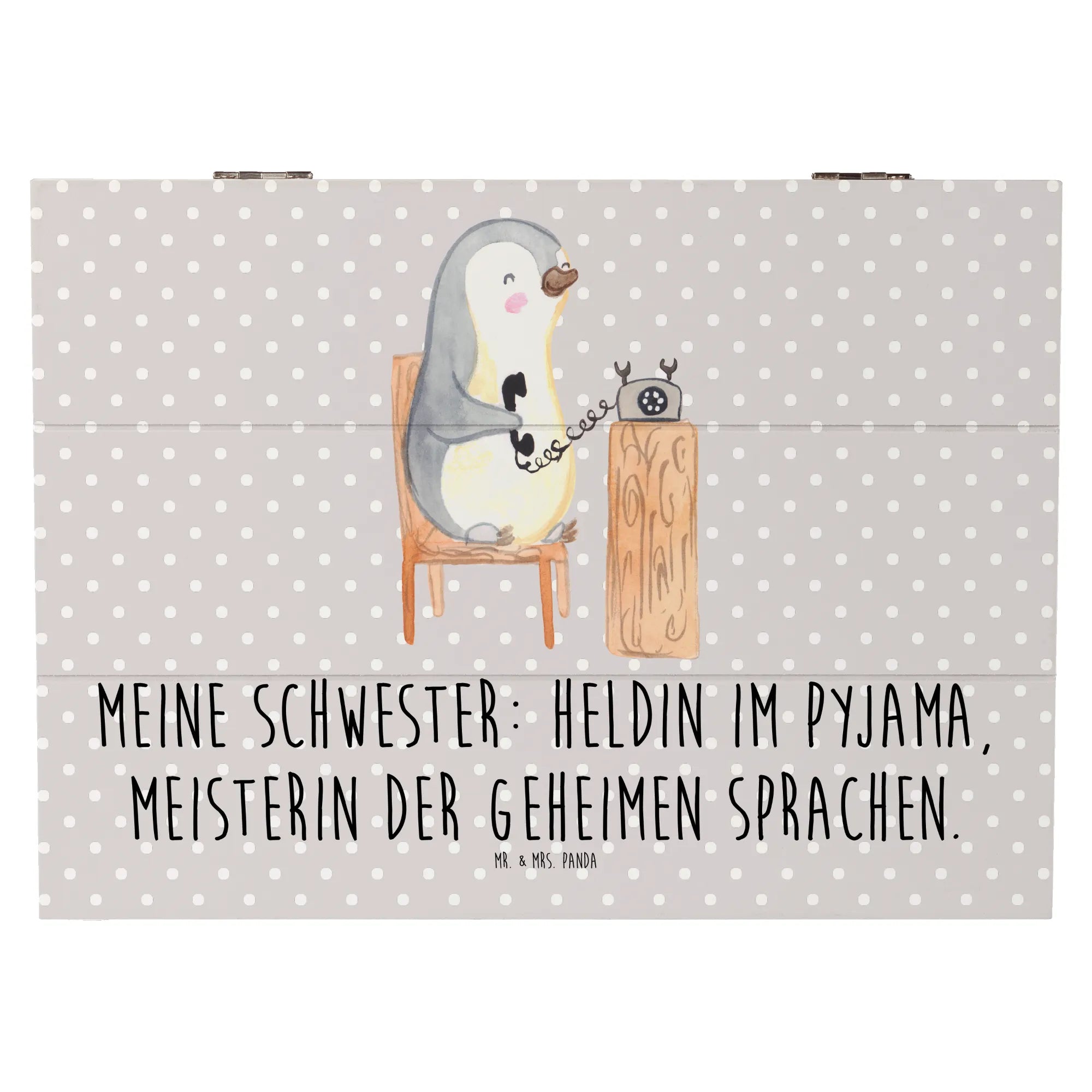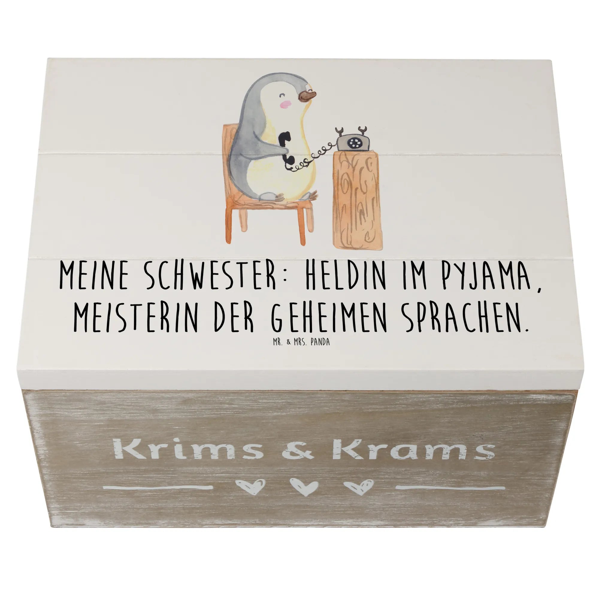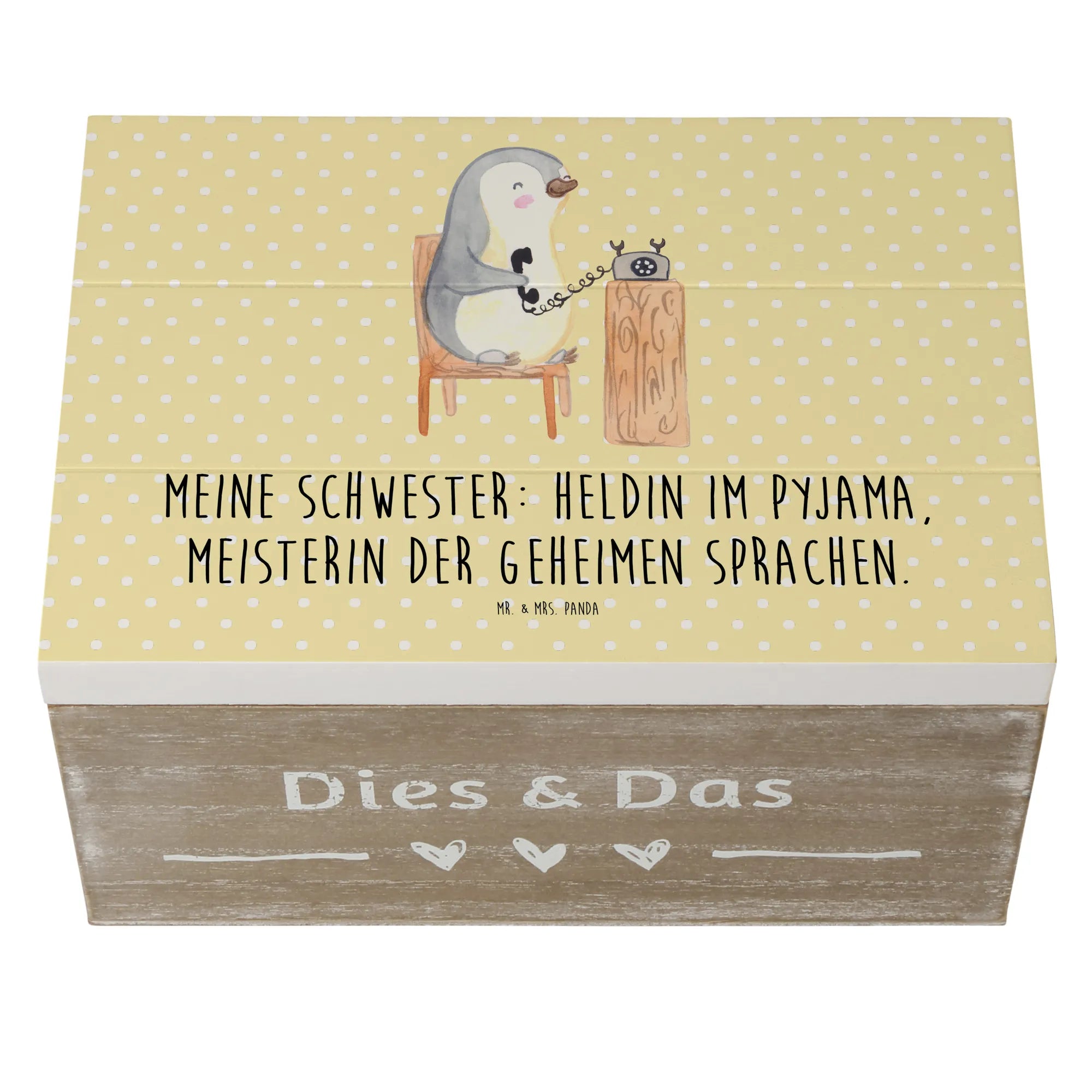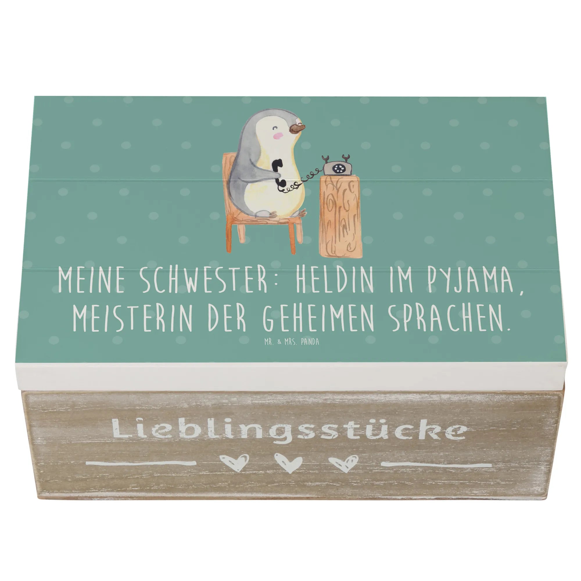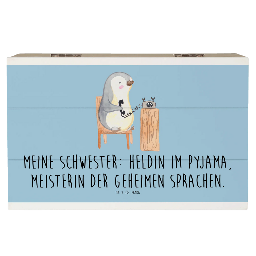 Skrzynia drewniana Meine Schwester: Heldin im Pyjama, Meisterin der geheimen Sprachen. - 19 x 12 cm - Pastelowy niebieski