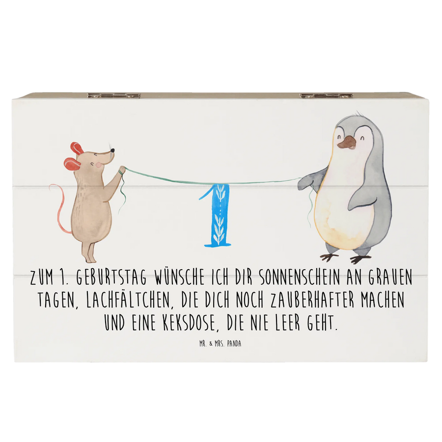 Skrzynia drewniana Pierwsze urodziny Mysz Pingwin - 19 x 12 cm - z napisem