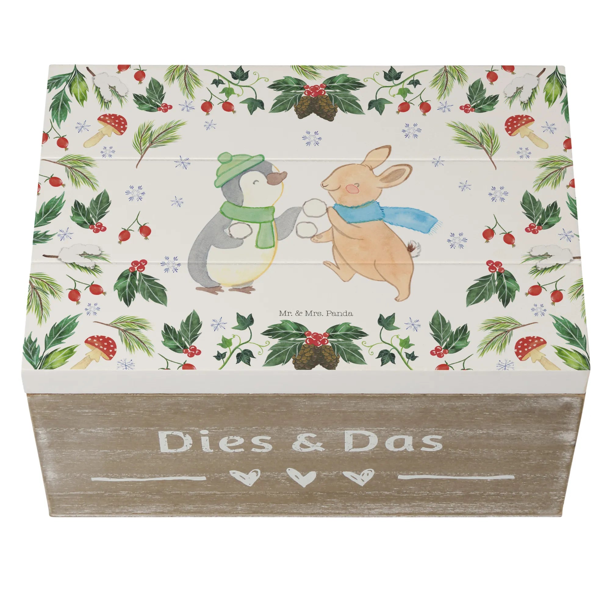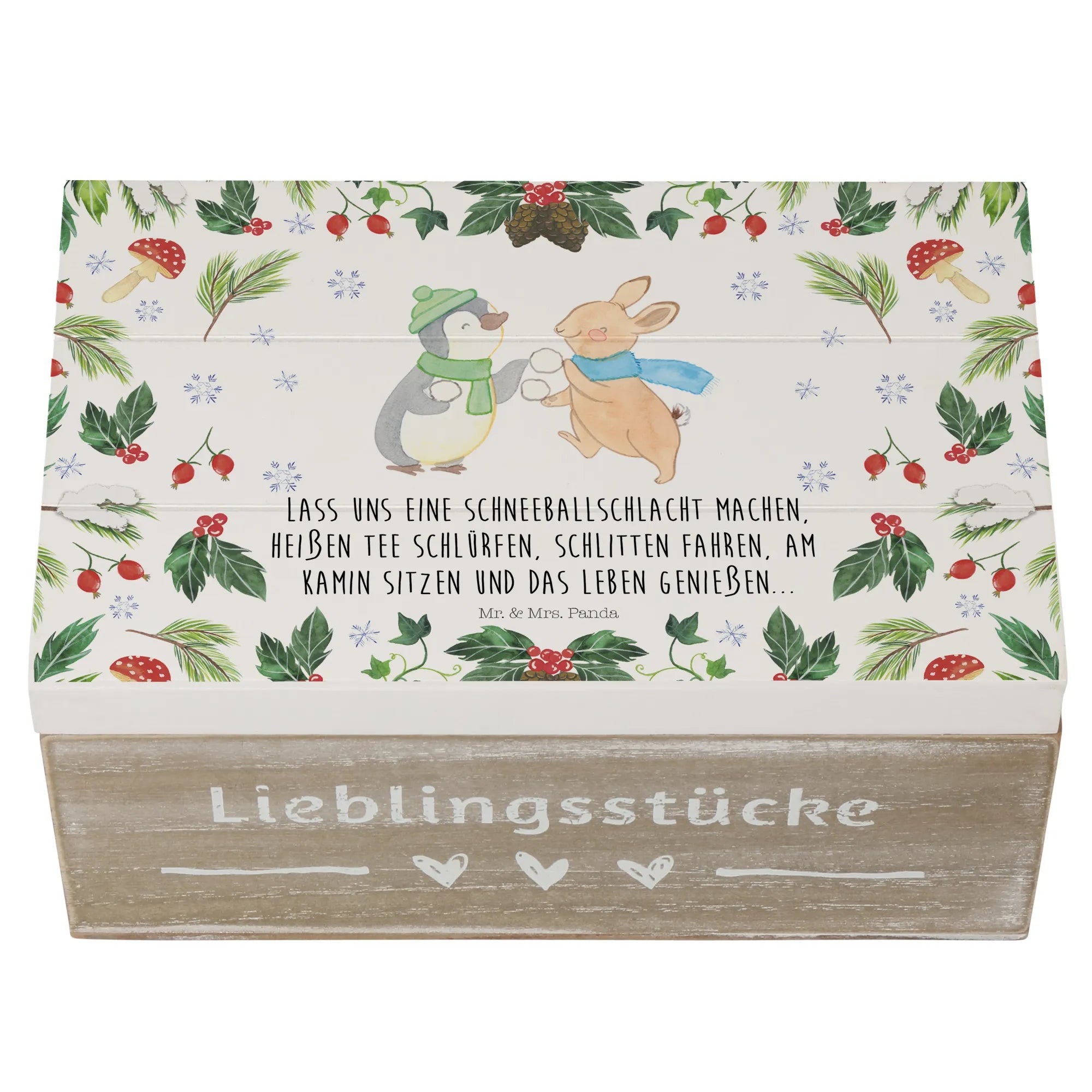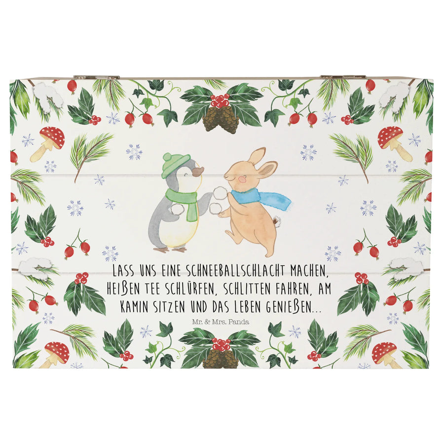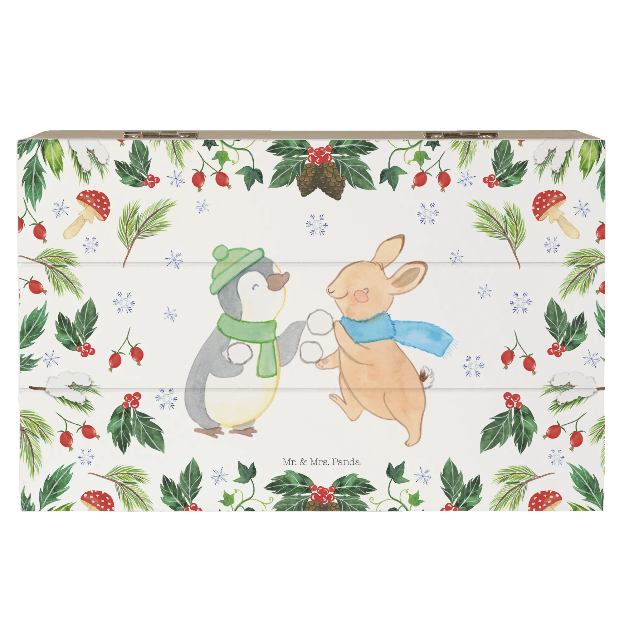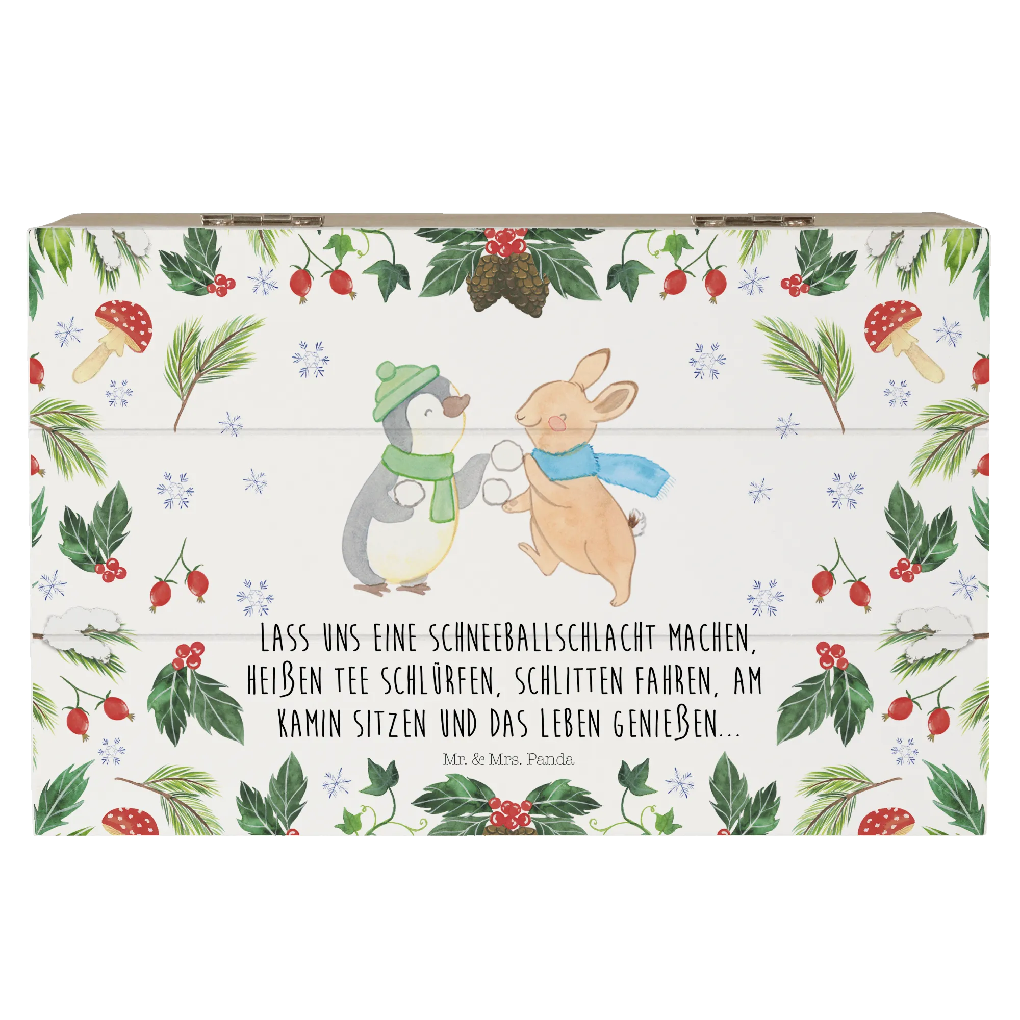Skrzynia drewniana Pingwin królik Bitwa na śnieżki - 22 x 15 cm - z napisem - biały