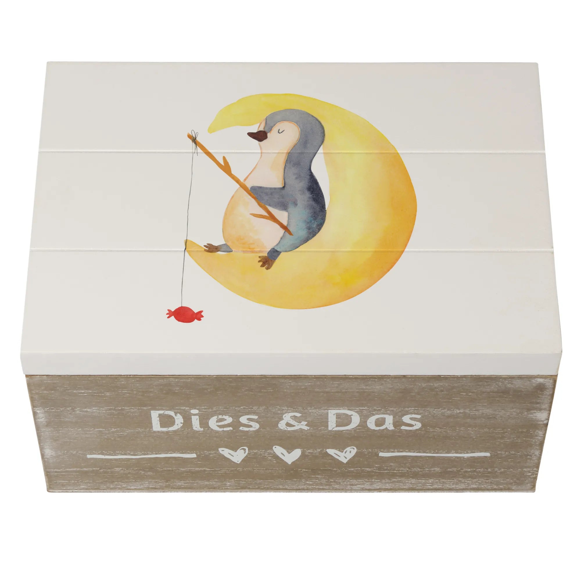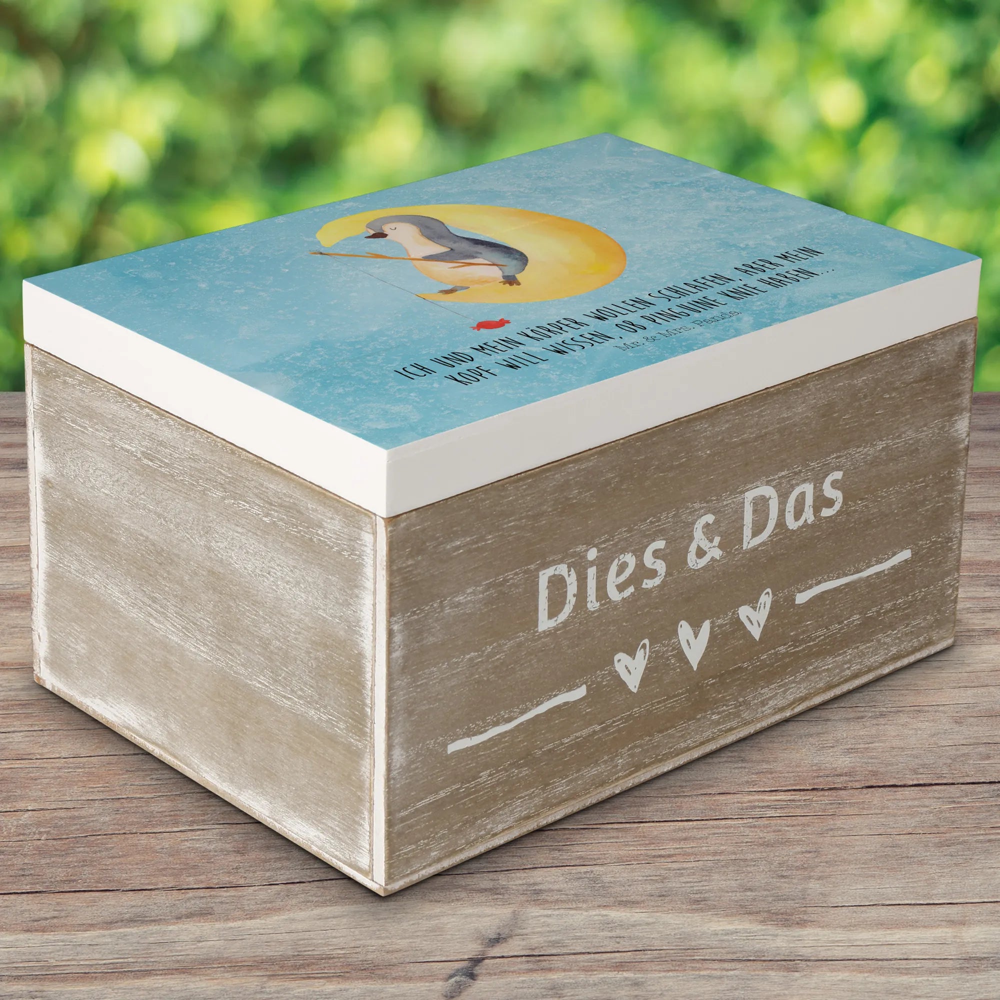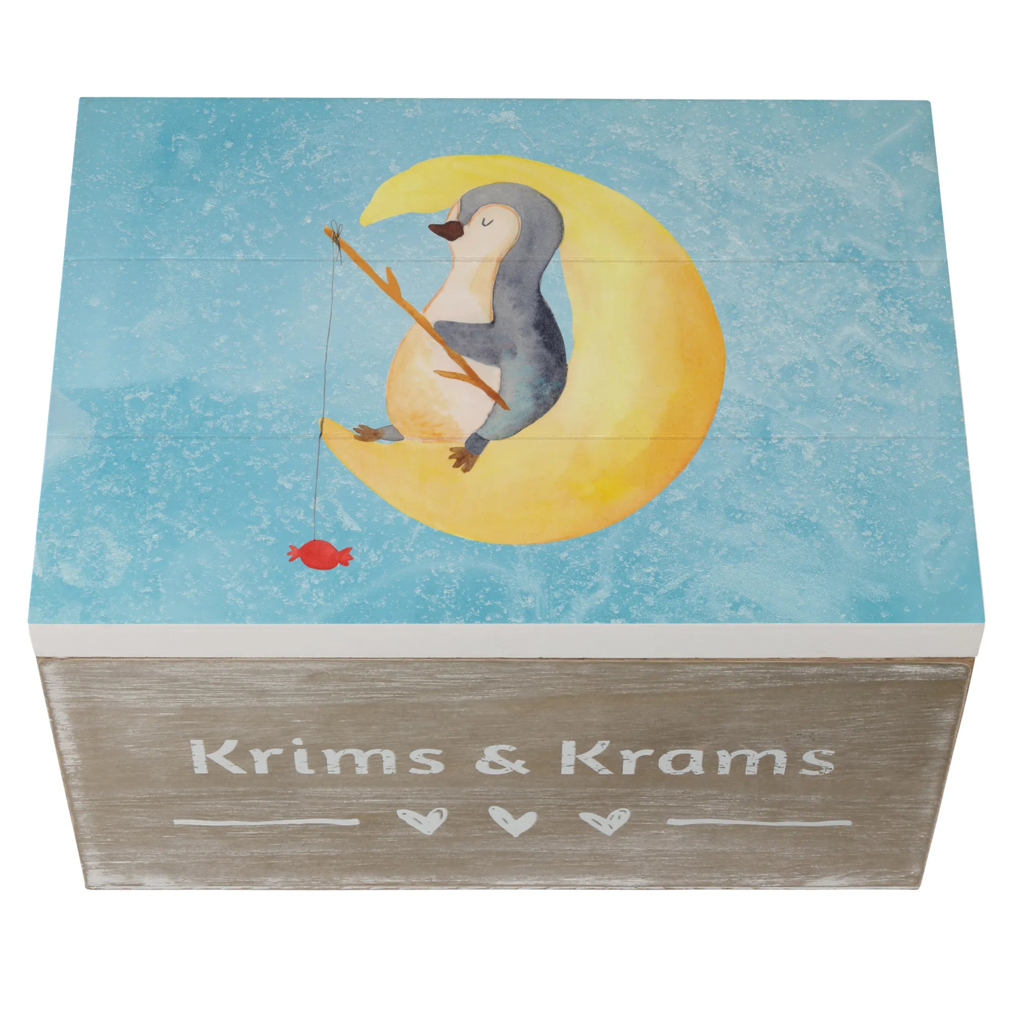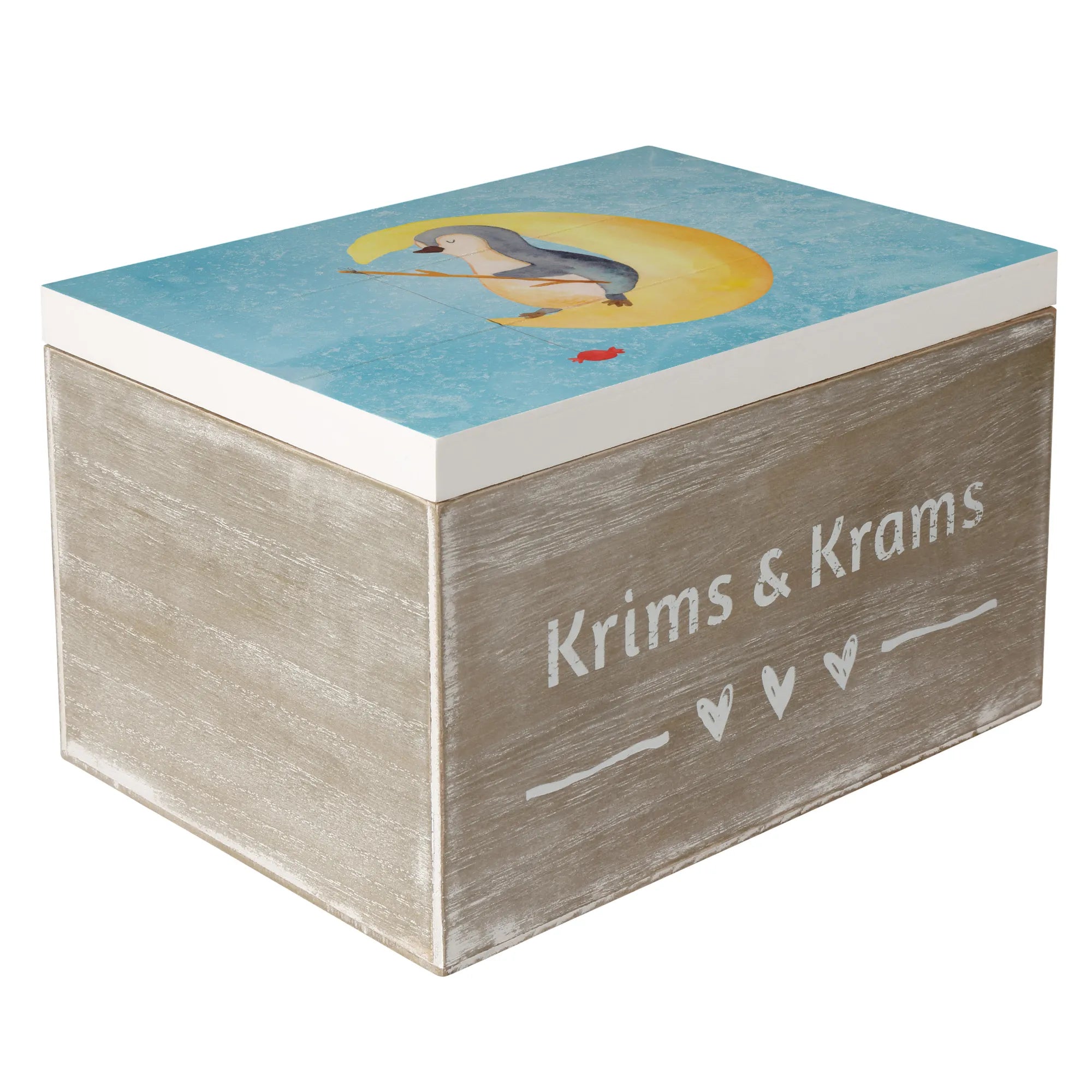 Skrzynia drewniana pingwin księżyc - 22 x 15 cm - z napisem - biały