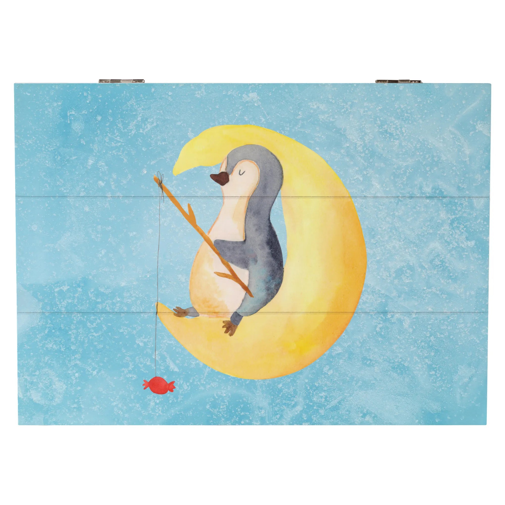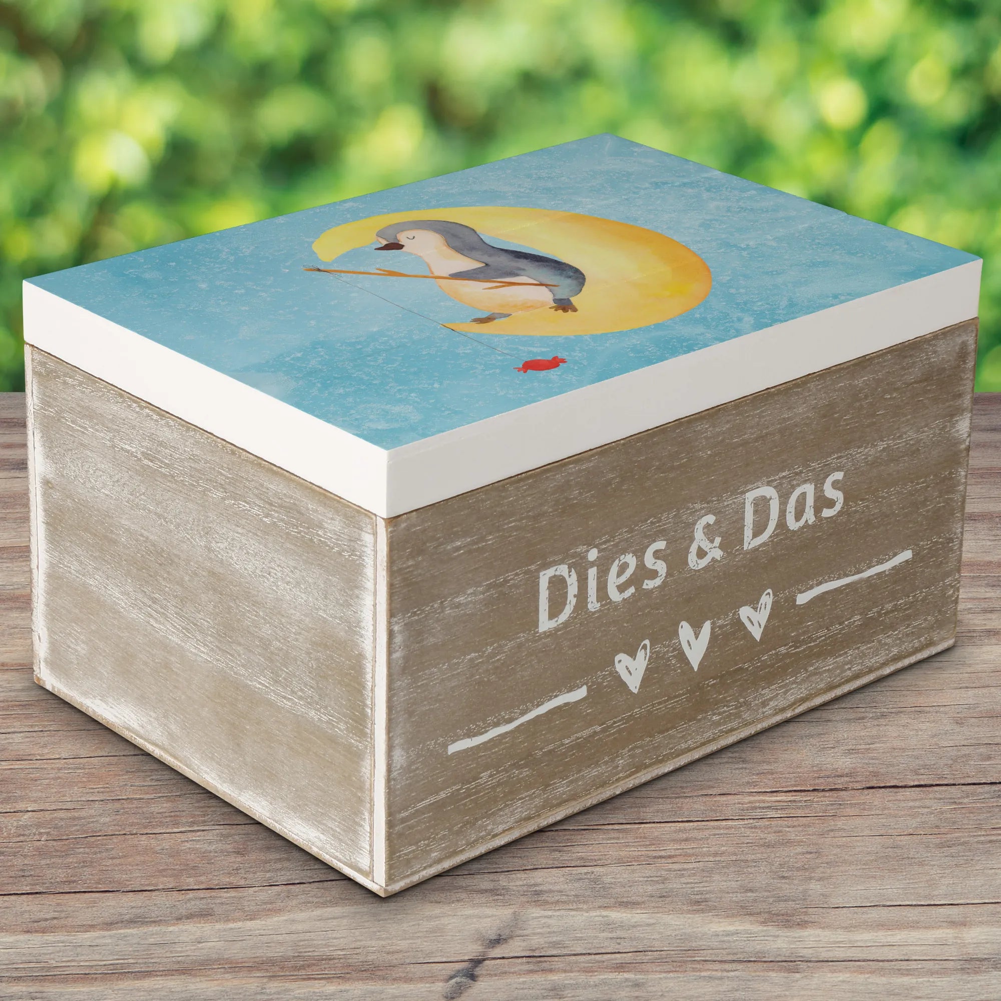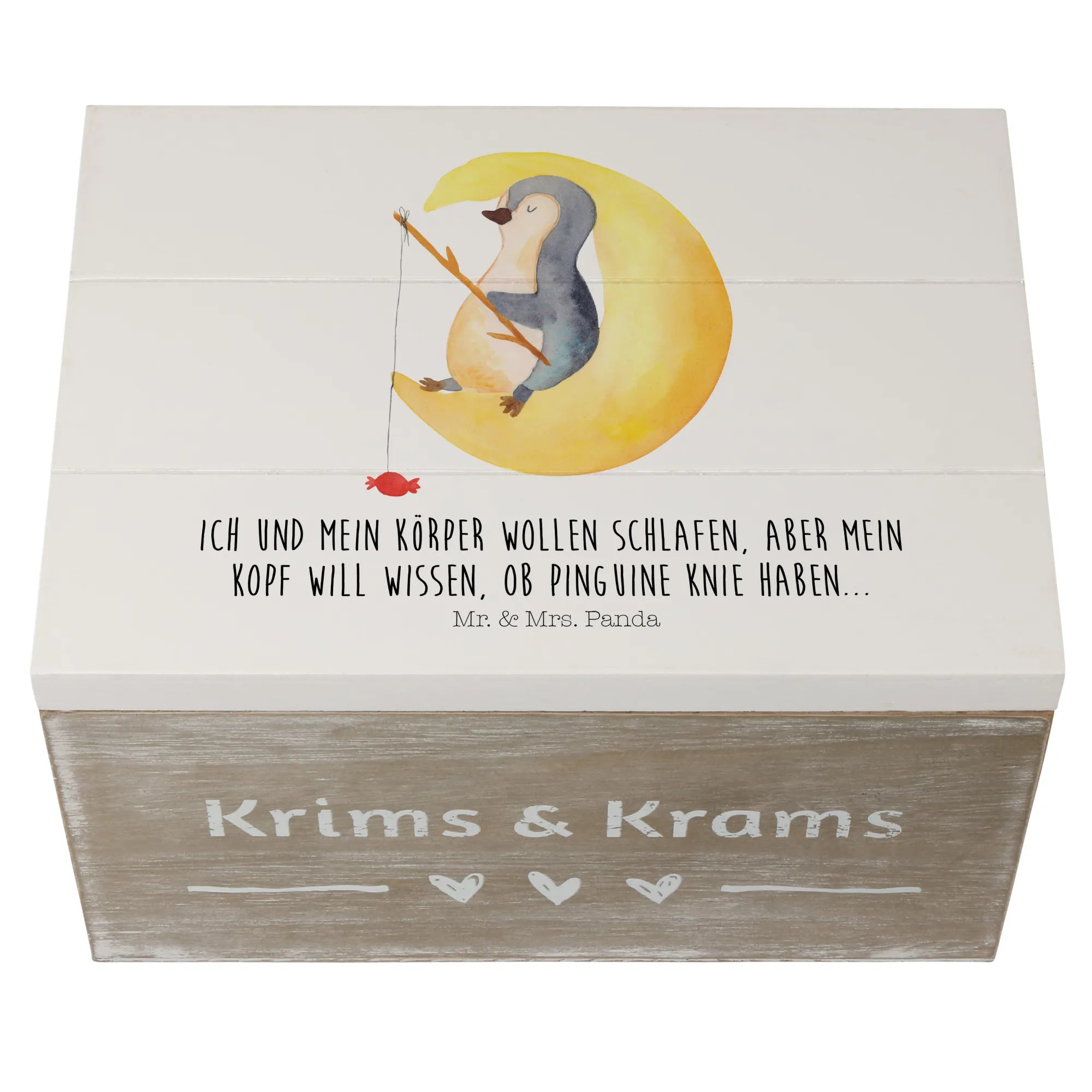 Skrzynia drewniana pingwin księżyc - 22 x 15 cm - z napisem - biały