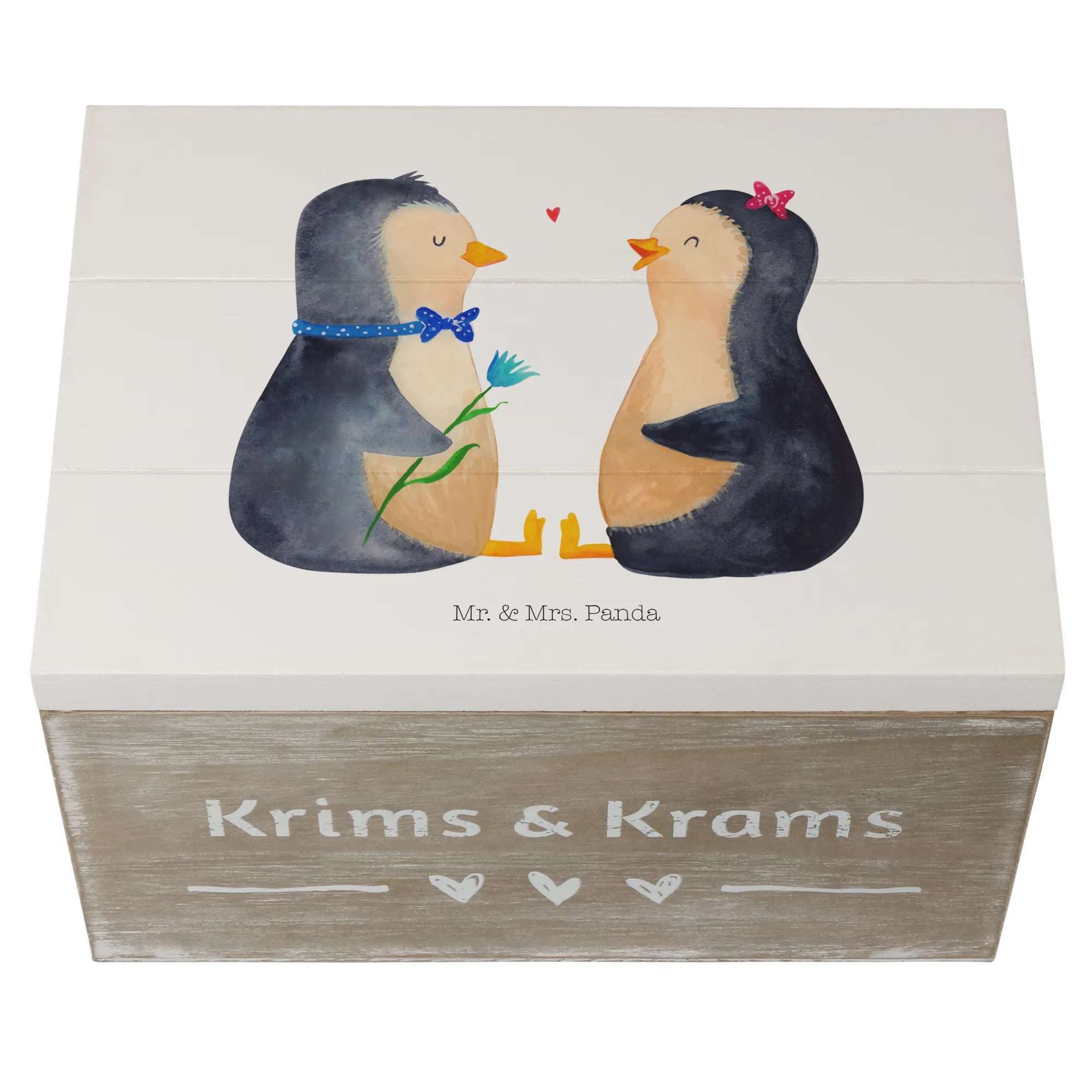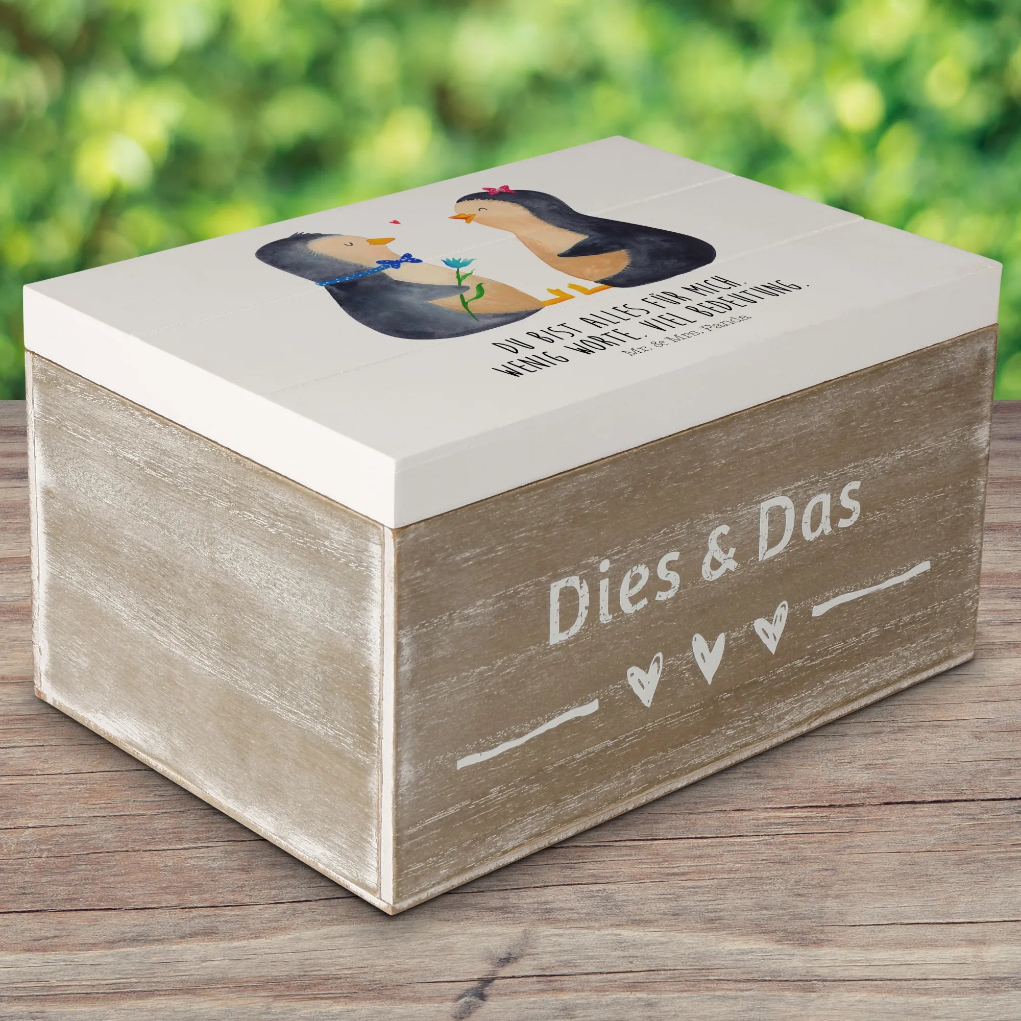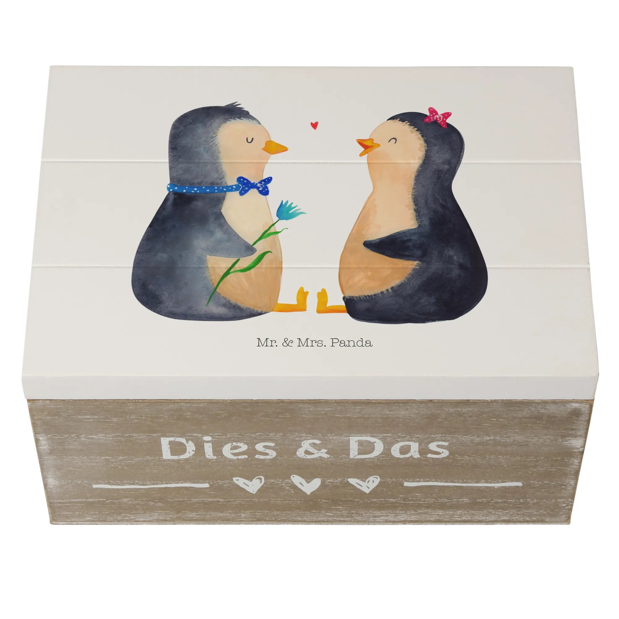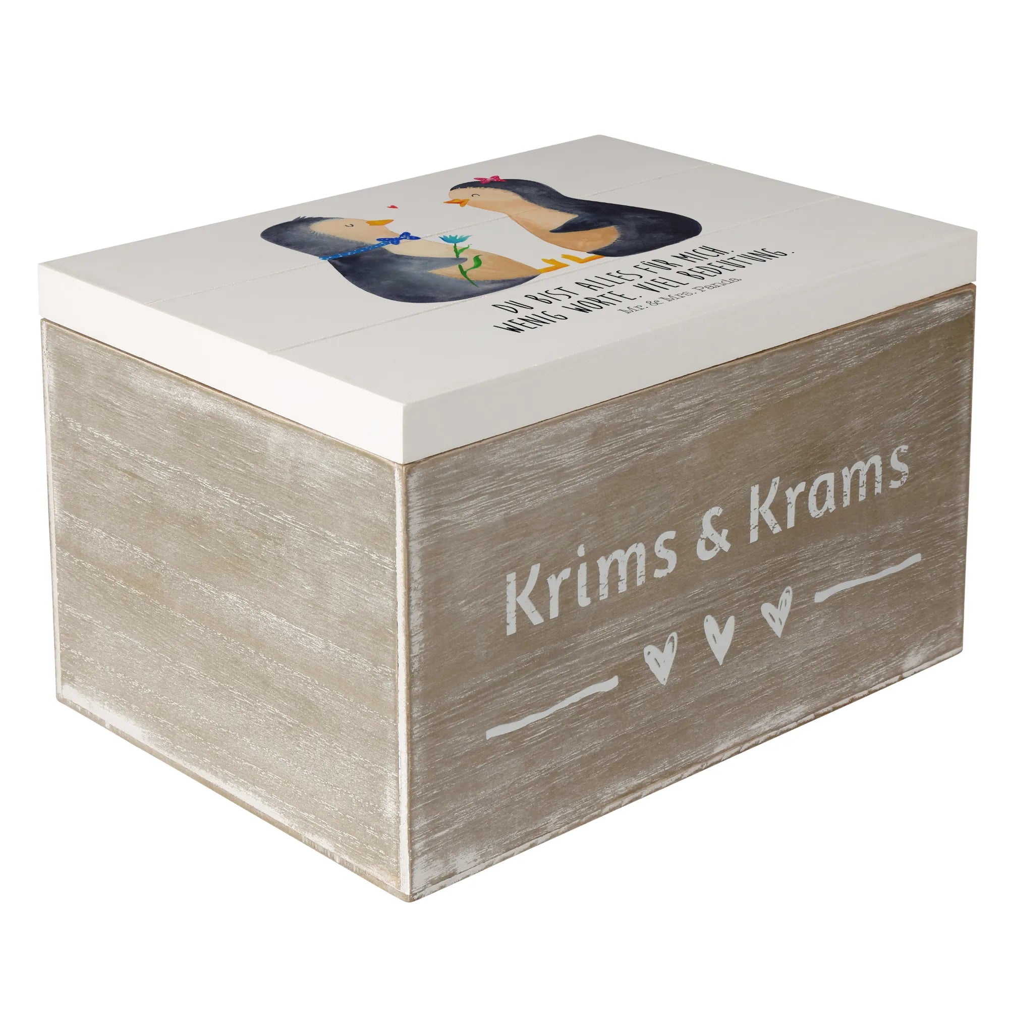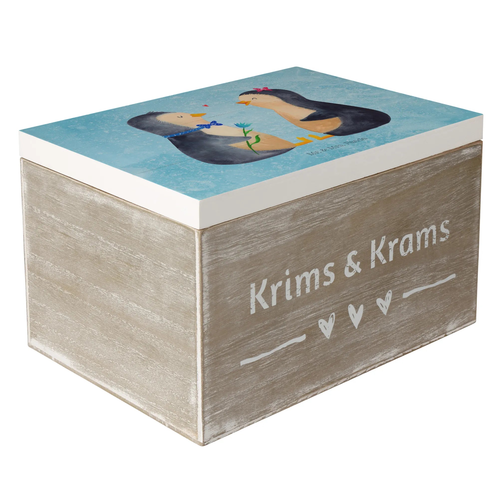 Skrzynia drewniana Pingwin para - 22 x 15 cm - z napisem - biały