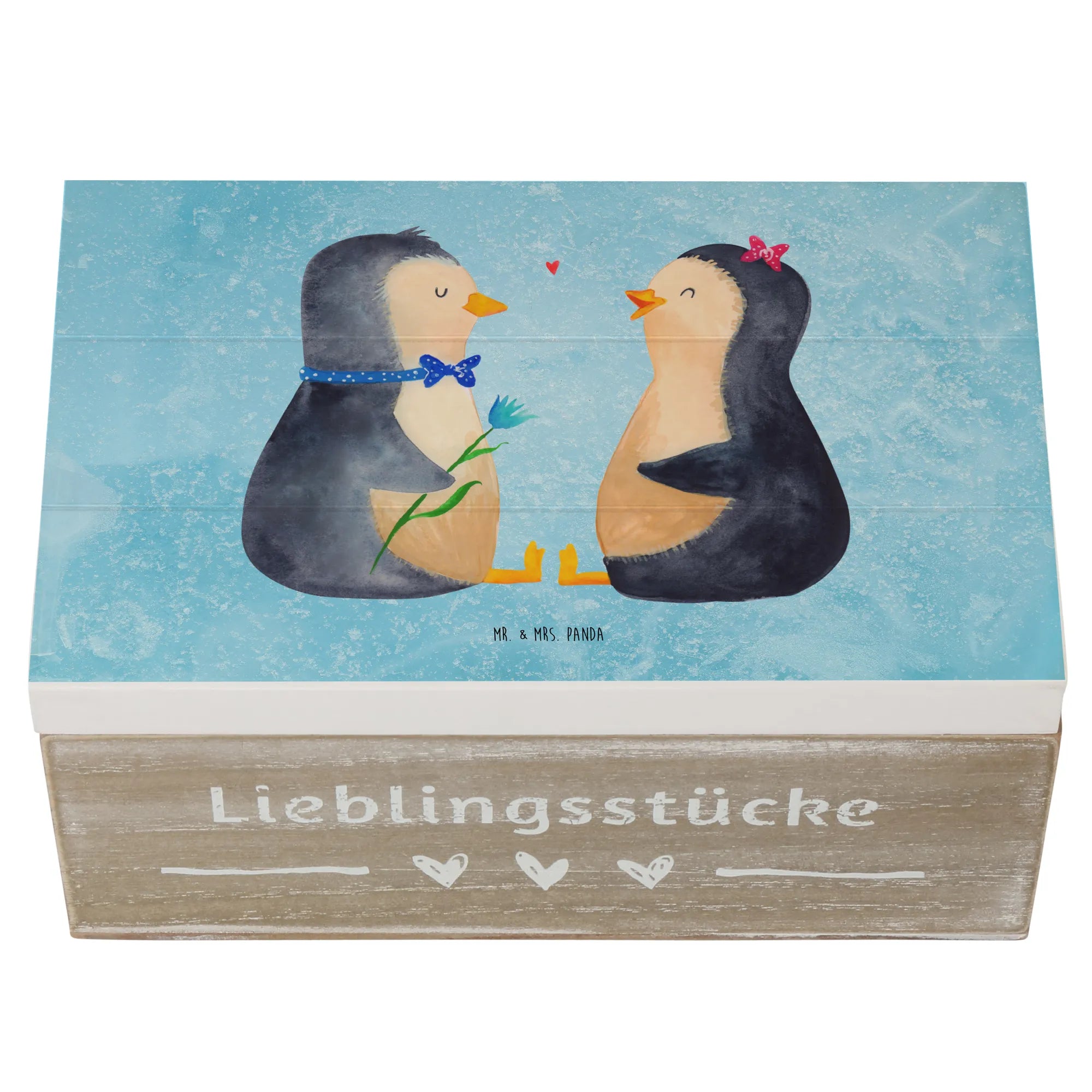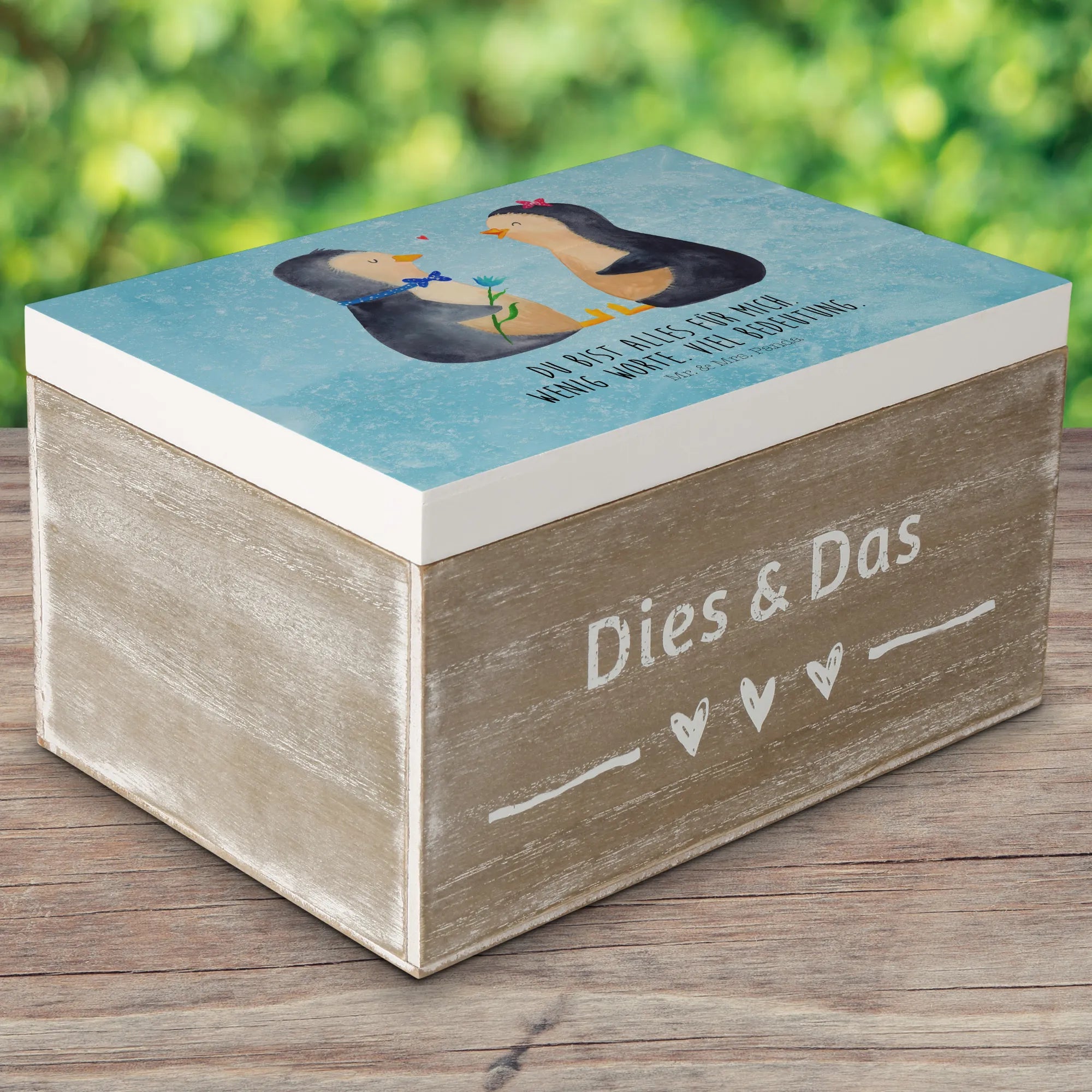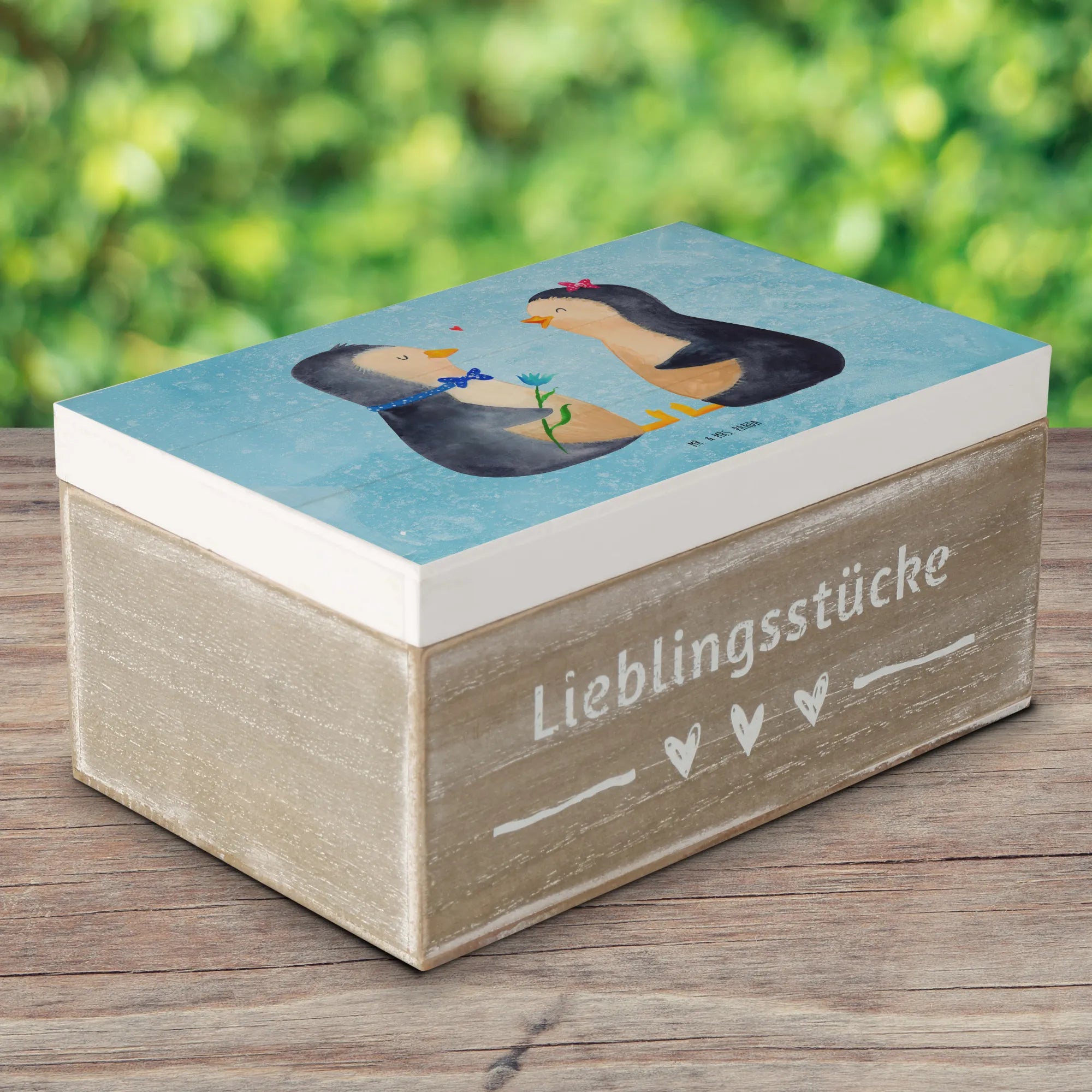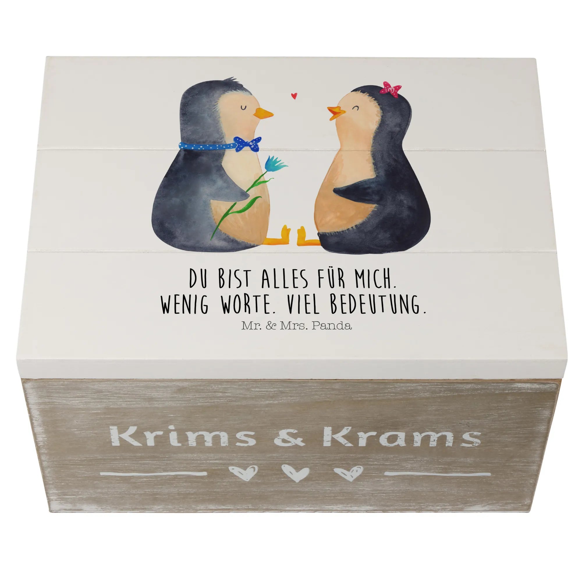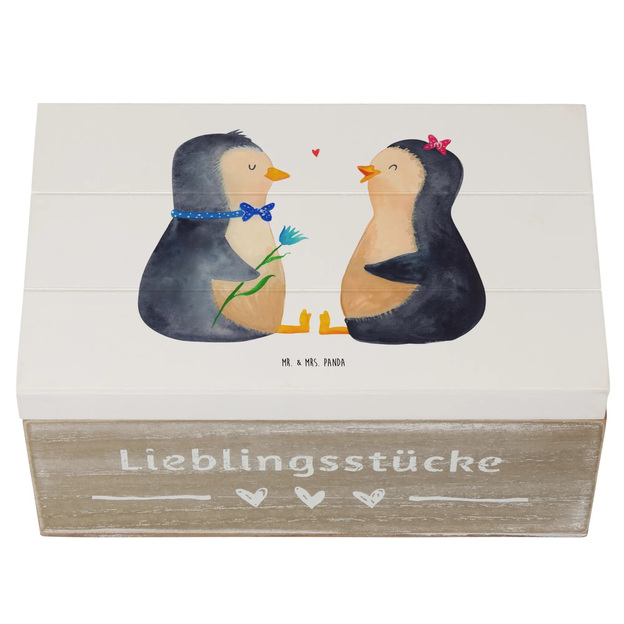 Skrzynia drewniana Pingwin para - 22 x 15 cm - z napisem - biały
