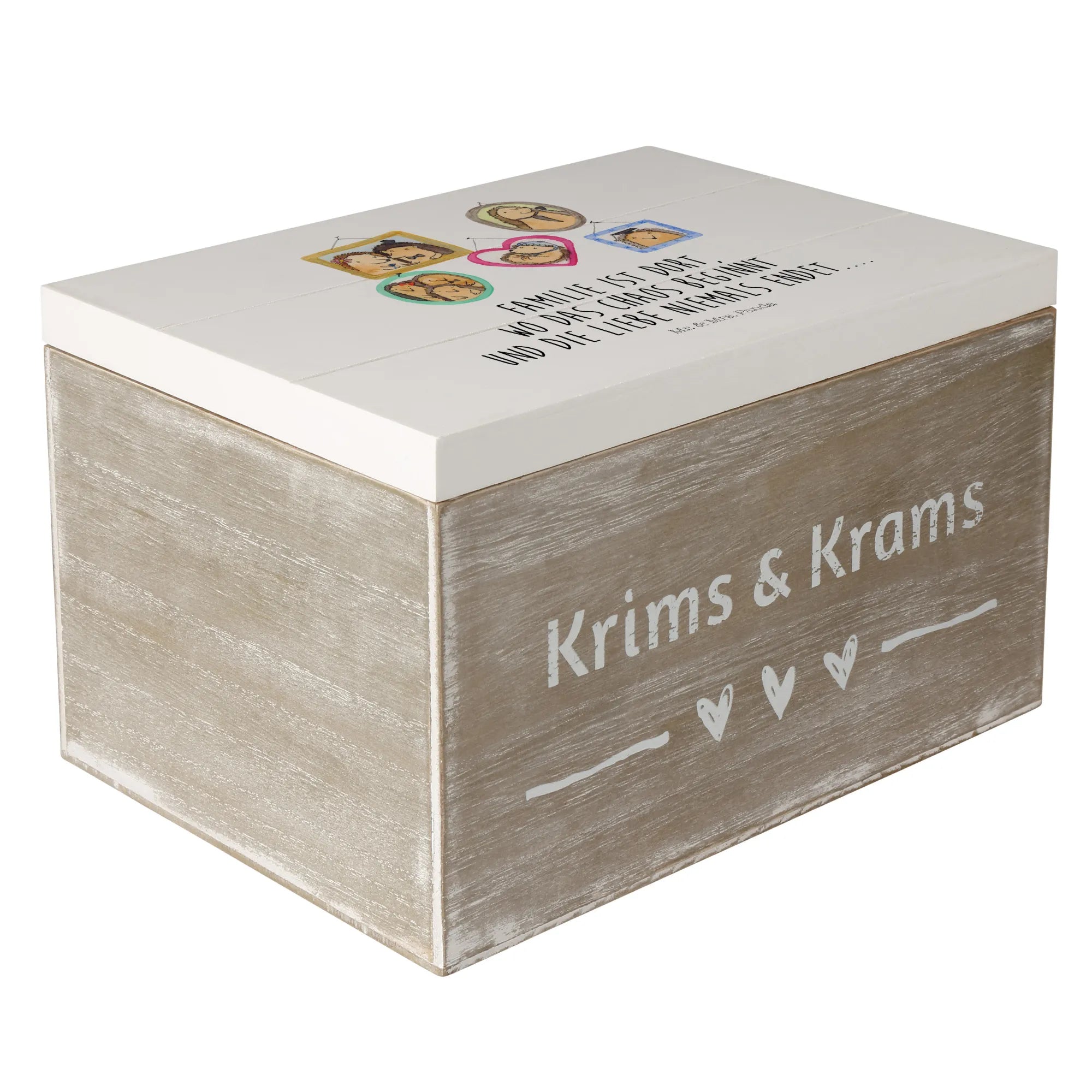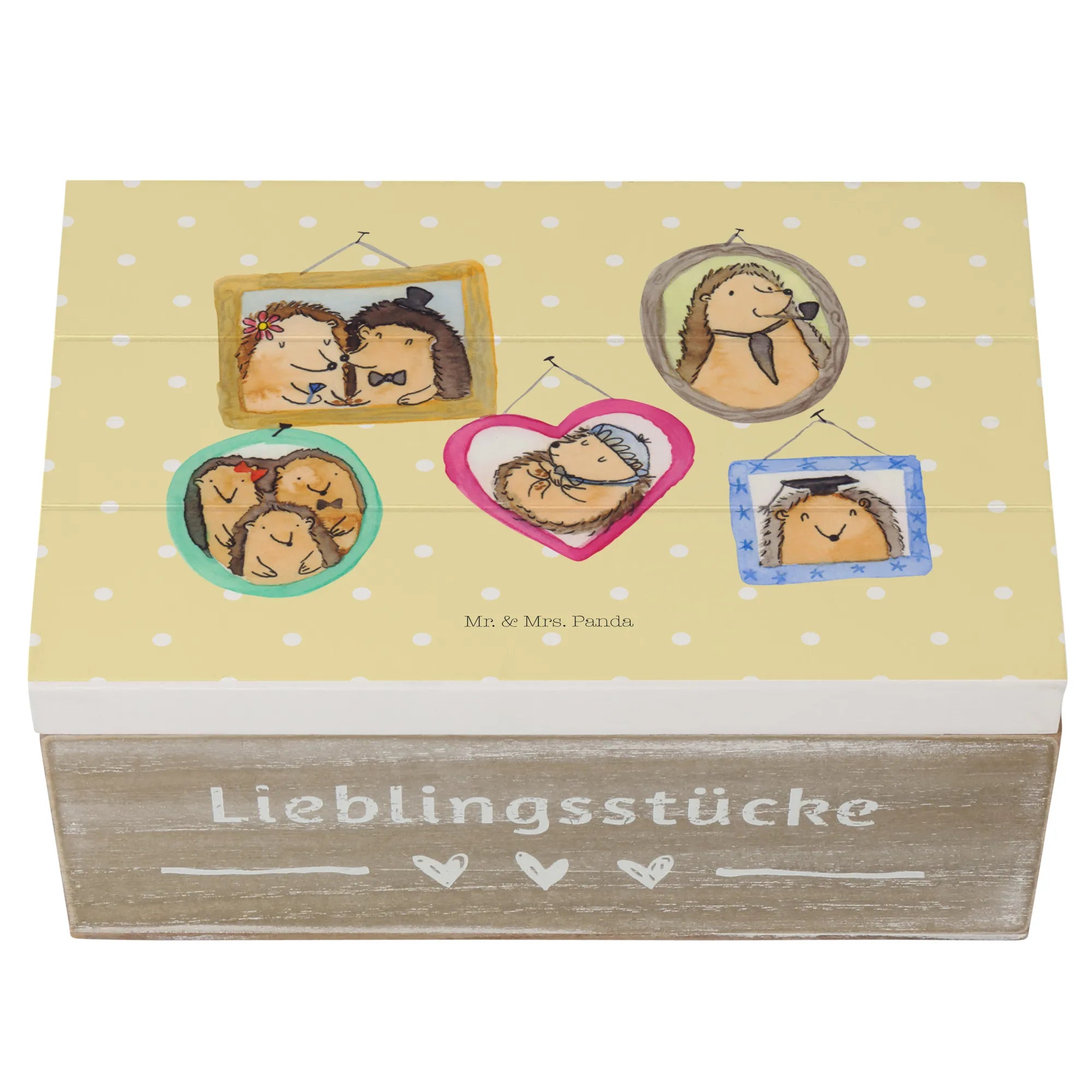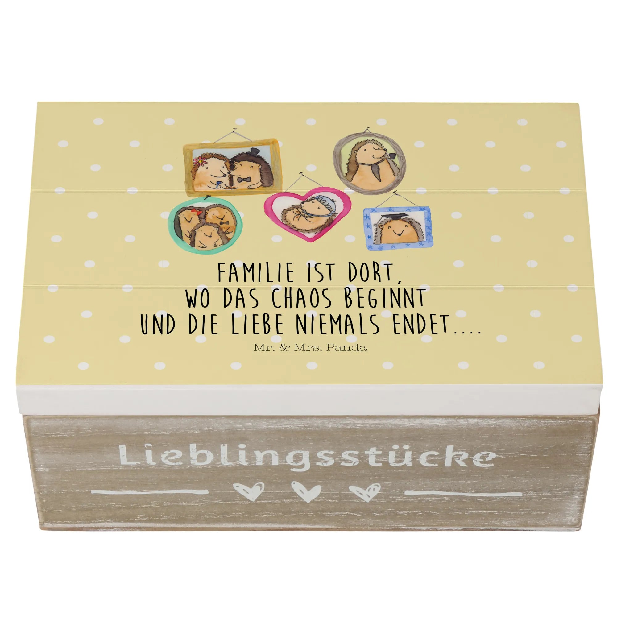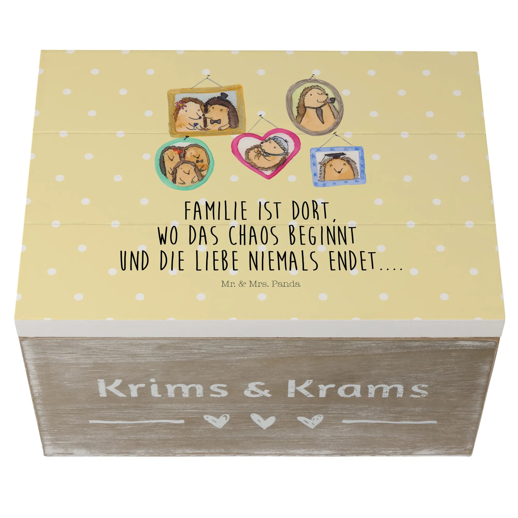 Skrzynia drewniana Rodzina jeży - 22 x 15 cm - z napisem - biały