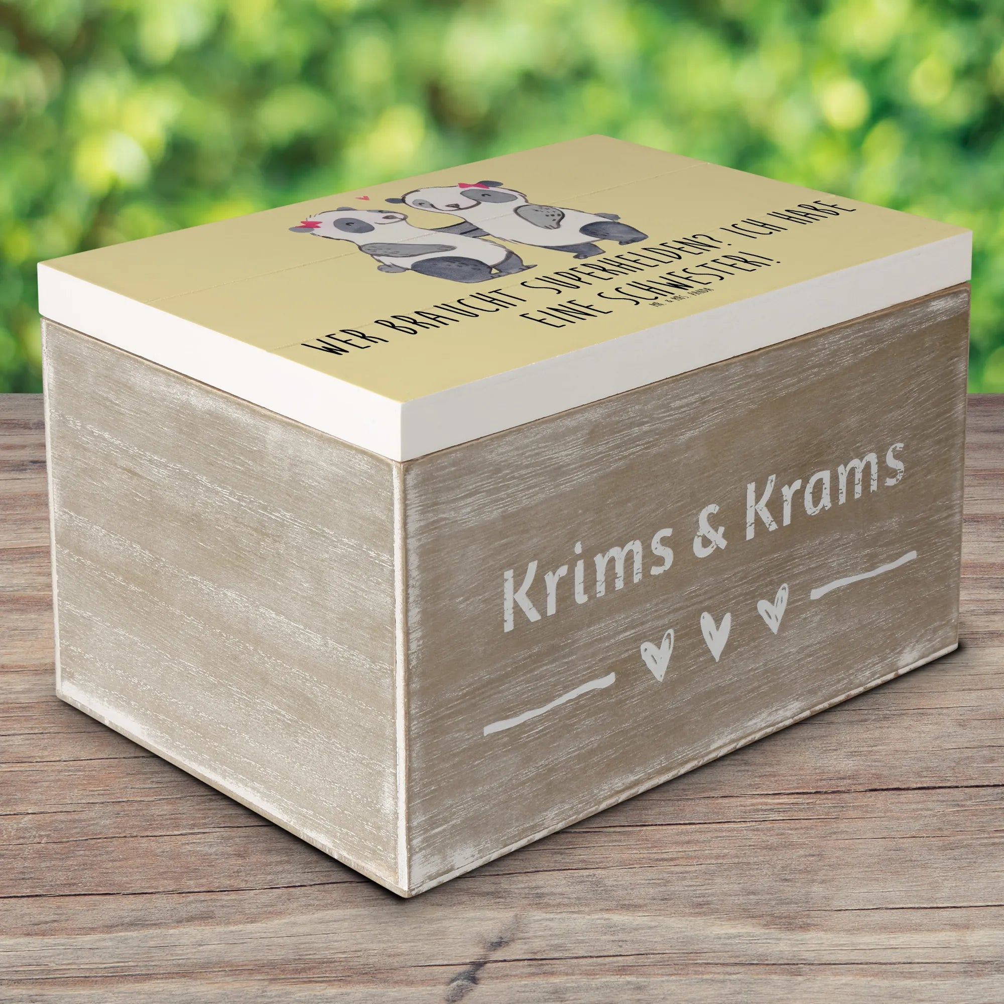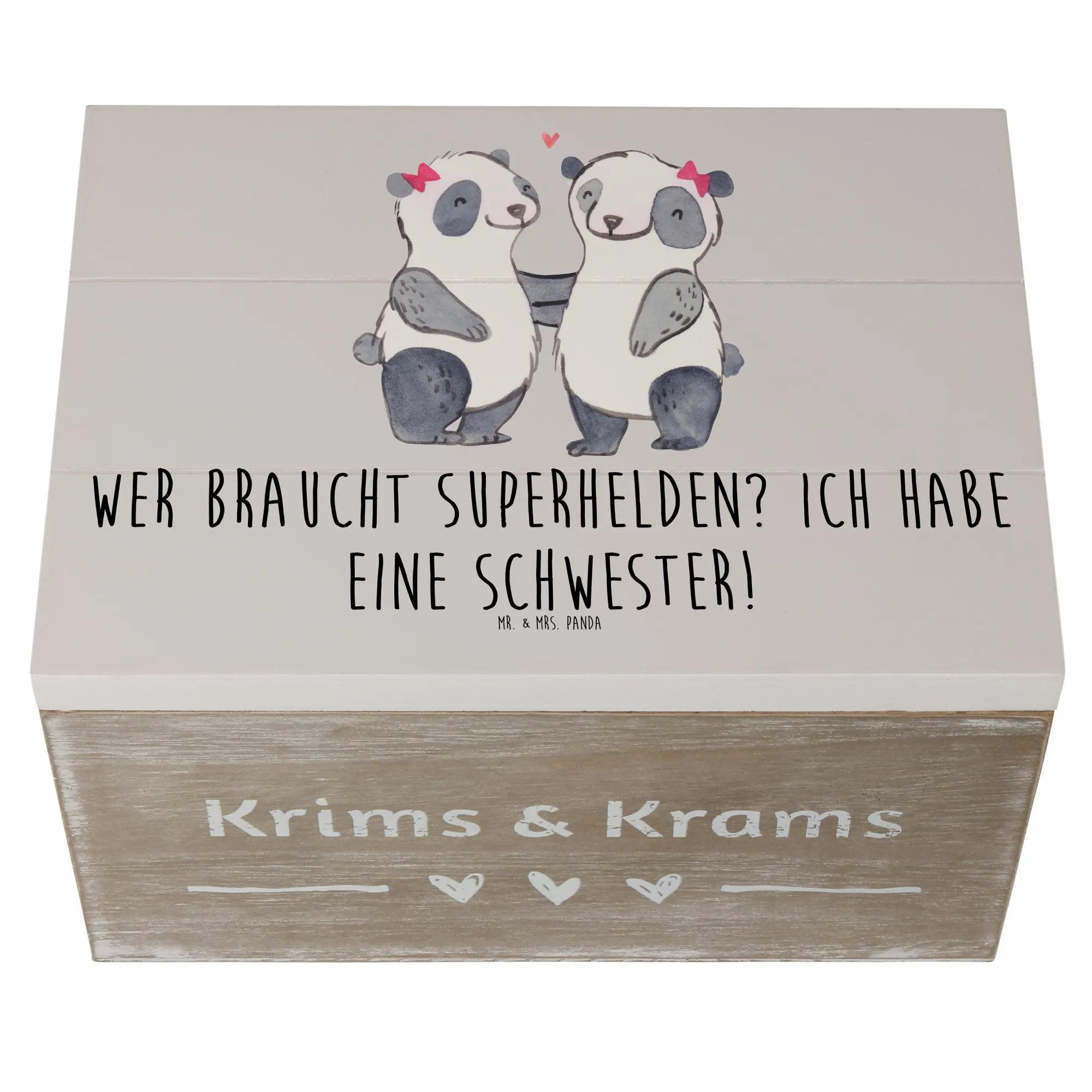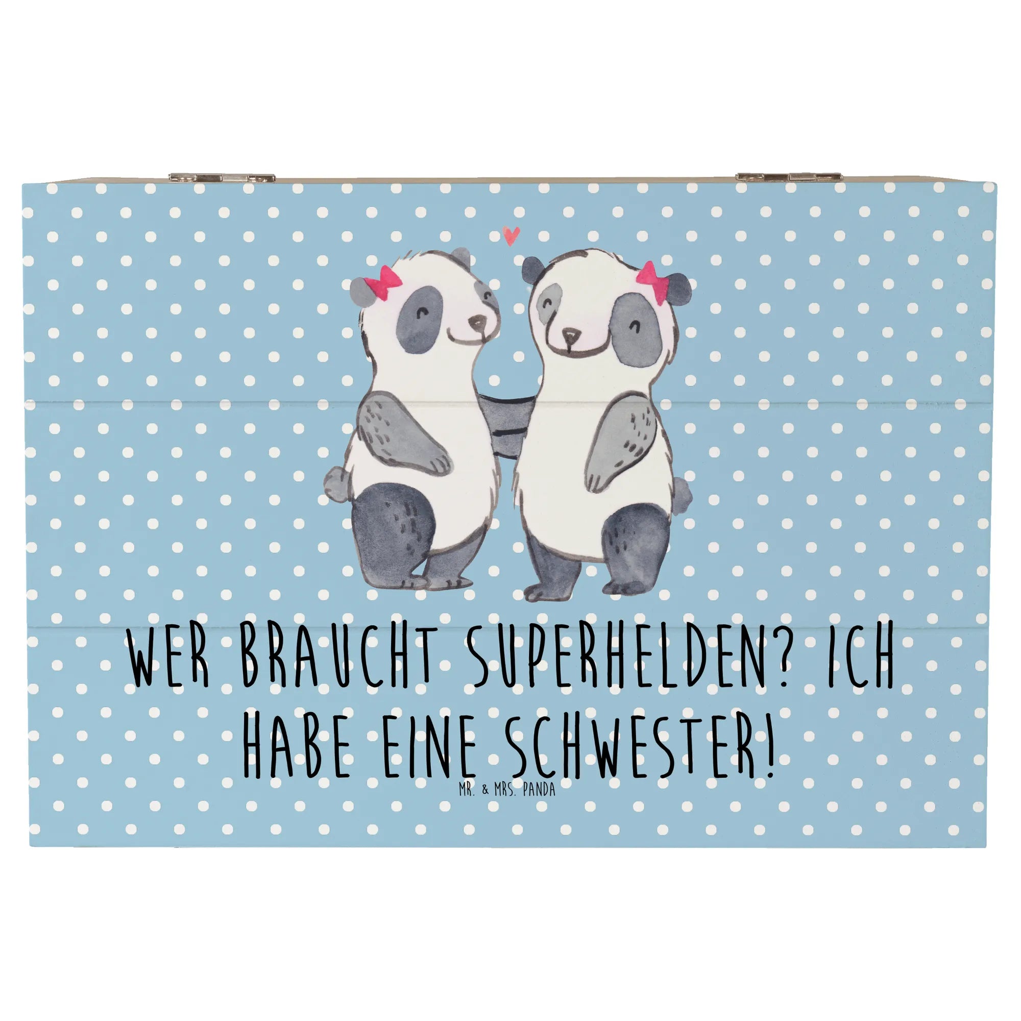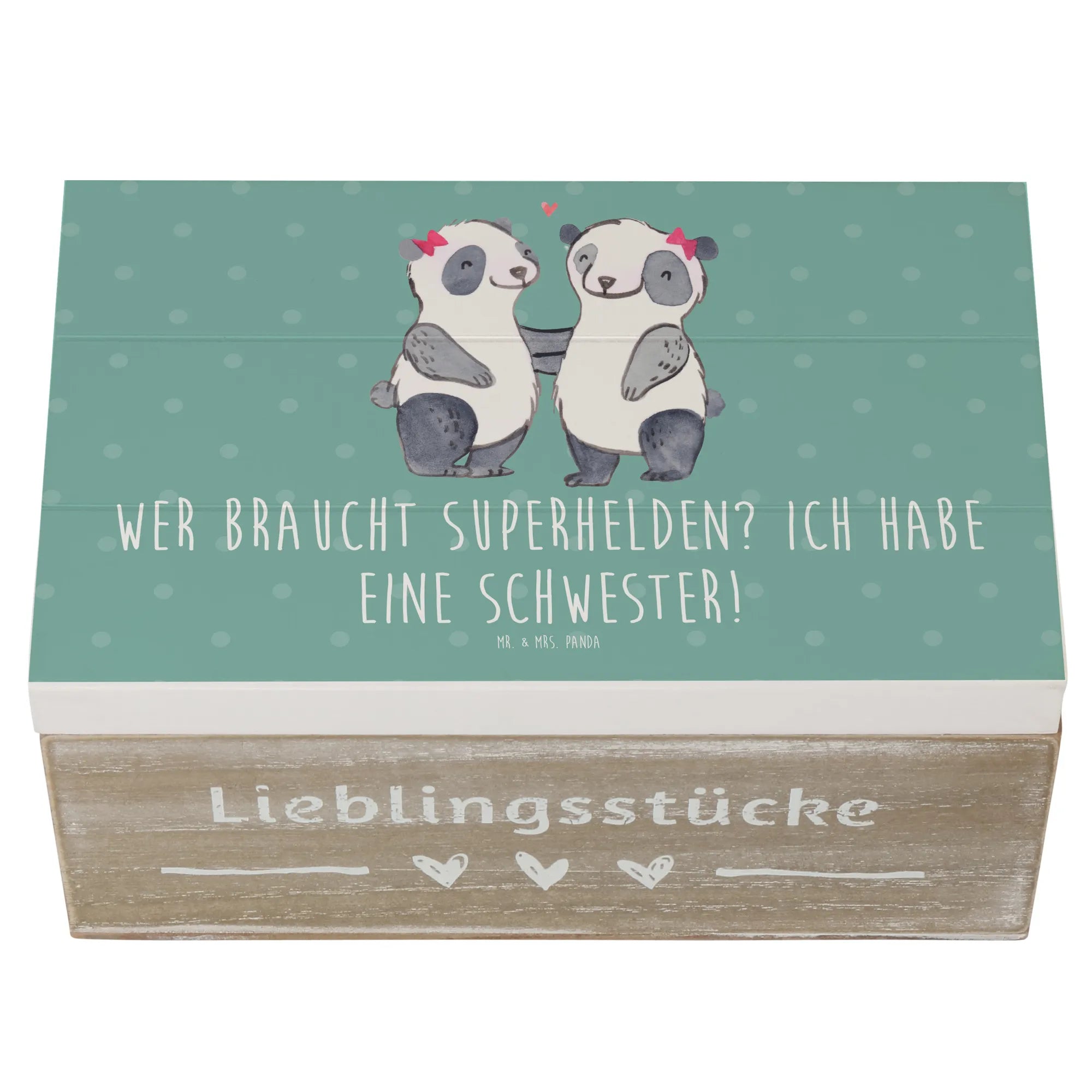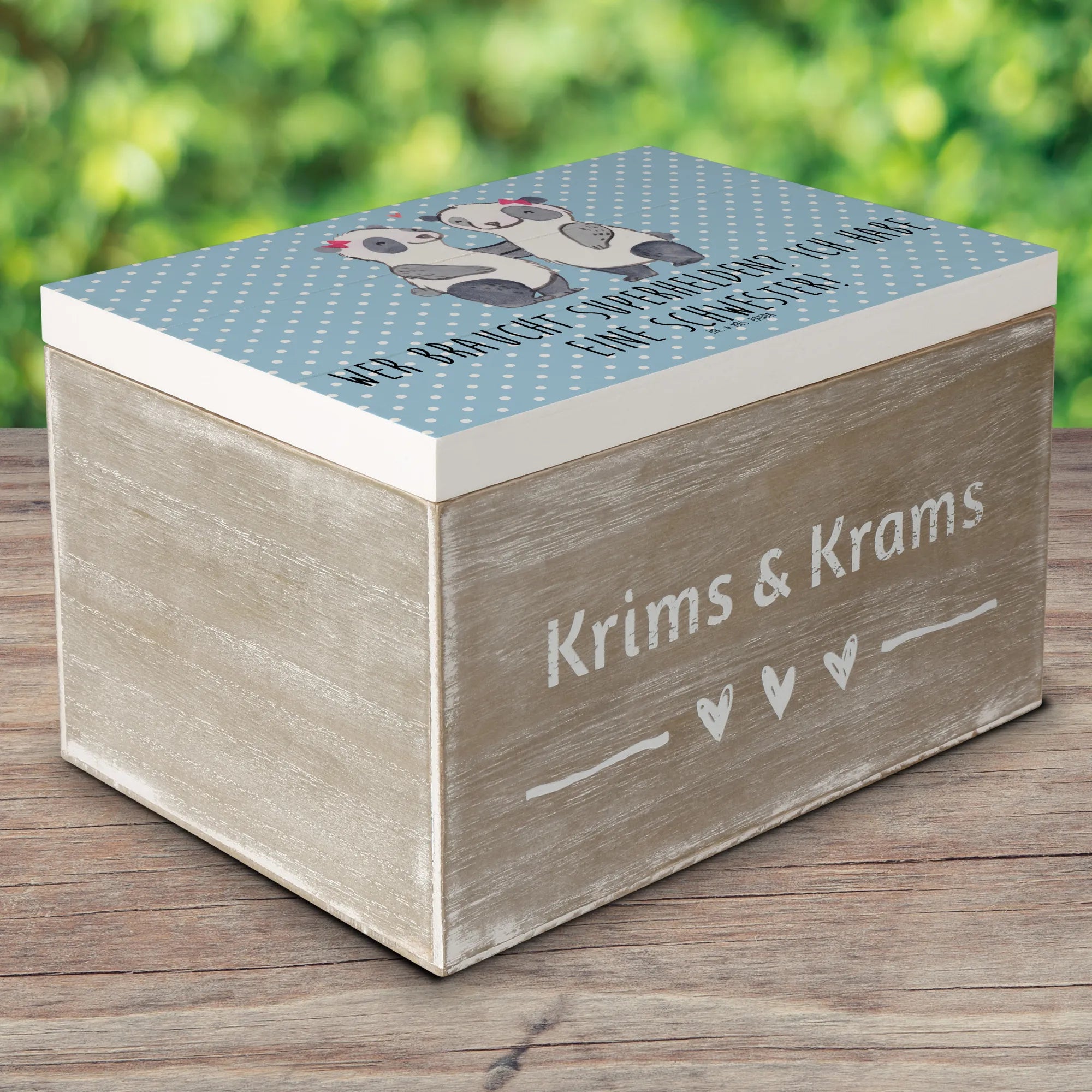 Skrzynia drewniana Wer braucht Superhelden? Ich habe eine Schwester! - 22 x 15 cm - Pastelowy niebieski
