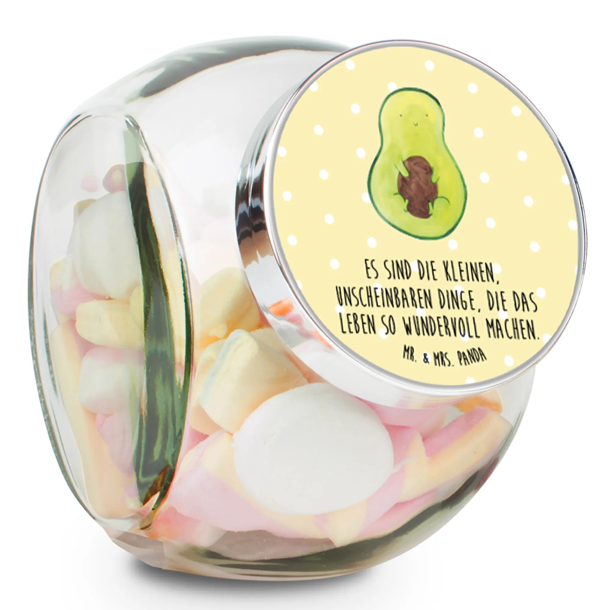 Die niedliche Avocado, handgezeichnet von Mrs. Panda, strahlt Optimismus und Positivität aus. Der dazugehörige Spruch "Es sind die kleinen, unscheinbaren Dinge, die das Leben so wundervoll machen" spricht viele an und macht dieses Bonbonglas zum perfekten Geschenk für deine Liebsten oder für dich selbst.