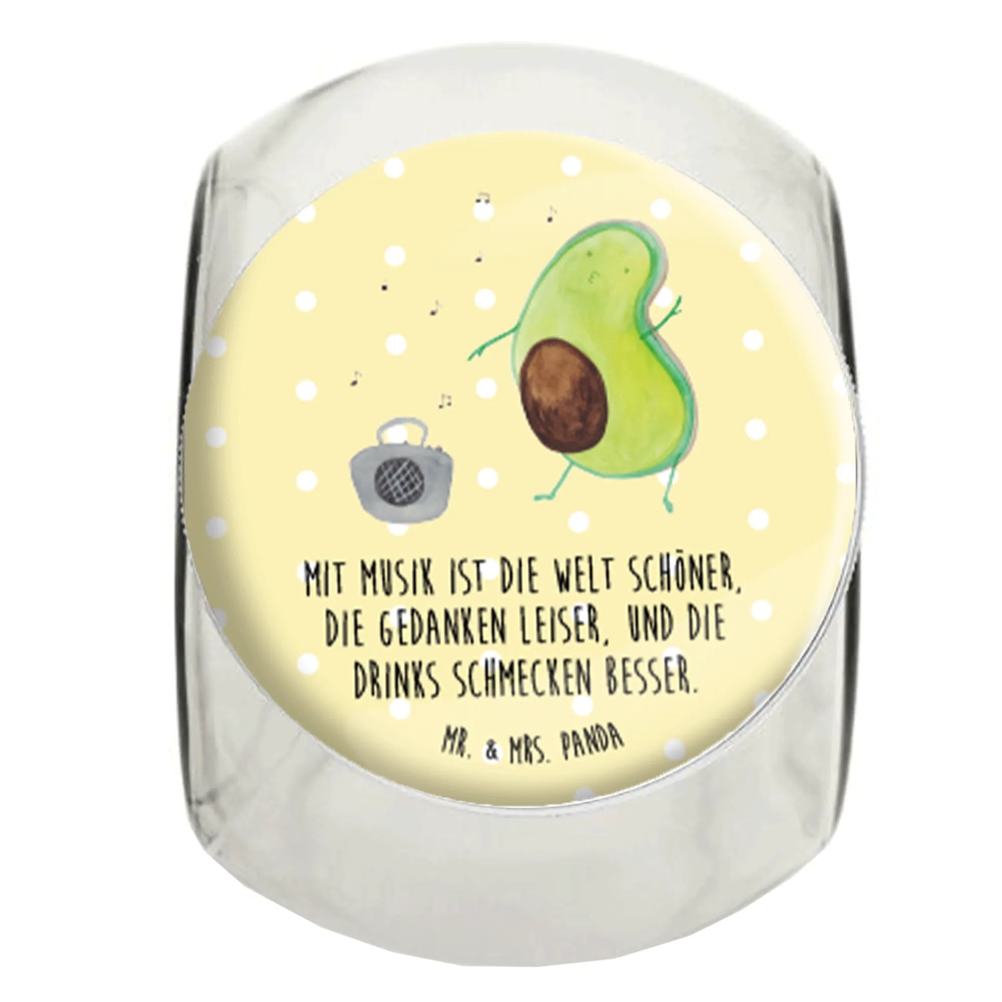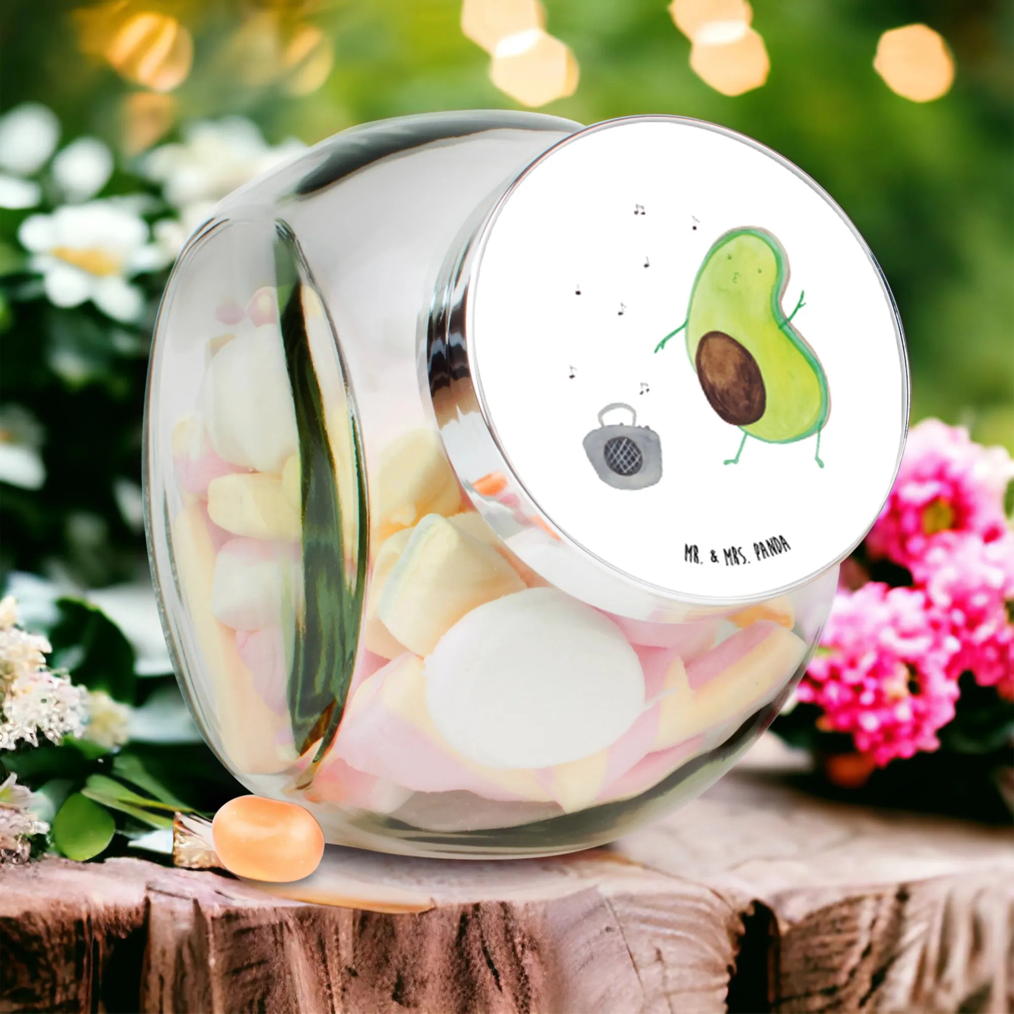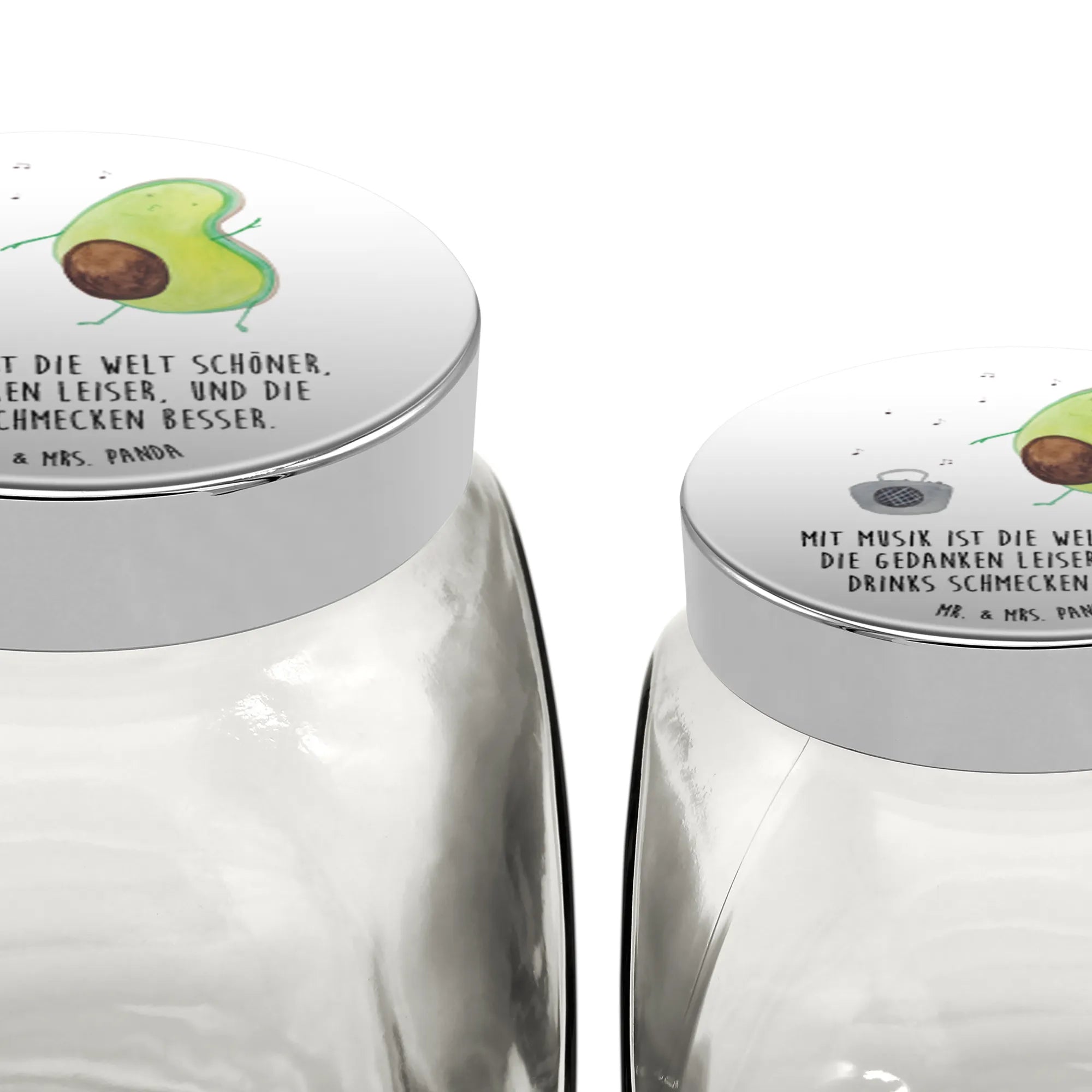 Das Bonbonglas mit dem süßen Motiv "Avocado tanzt" aus der Avocado Kollektion von Mr. & Mrs. Panda ist das perfekte Accessoire für deine Küche oder das ideale Geschenk für Veganer und Avocado-Liebhaber. Die niedliche Avocado, die fröhlich vor einem Ghettoblaster tanzt, bringt ein Lächeln auf jedes Gesicht und verleiht deiner Aufbewahrung einen besonderen Charme.