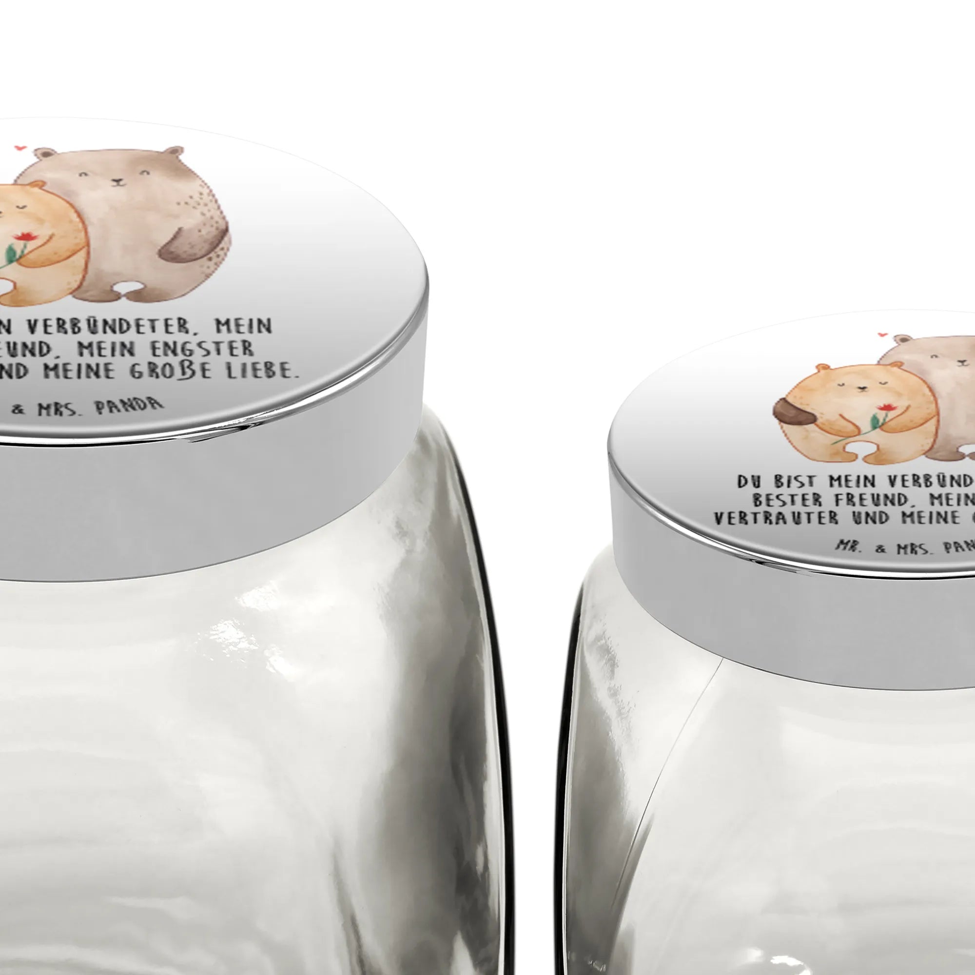 Entdecke das wunderschöne Bonbonglas von Mr. & Mrs. Panda mit dem zauberhaften Motiv "Bären Liebe". Dieses hochwertige Vorratsglas begeistert nicht nur mit seiner ästhetischen Anziehungskraft, sondern auch mit seiner Funktionalität. Ob Du es mit deinen liebsten Süßigkeiten, Keksen, aromatischen Tees oder einem bunten Müsli füllst, das Bonbonglas sorgt dafür, dass alles frisch bleibt. Die beiden Bären, die ein Herz bilden, symbolisieren die innige Verbundenheit zwischen Dir und Deinen Liebsten. Der linke Bär hält dabei zärtlich eine Blume, was die Botschaft von Liebe und Freundschaft perfekt unterstreicht. Das Motiv ist mit dem liebevollen Slogan "Du bist mein Verbündeter, Mein bester Freund, mein engster Vertrauter und meine große Liebe." versehen, was es zu einem unfassbar persönlichen Geschenk macht.