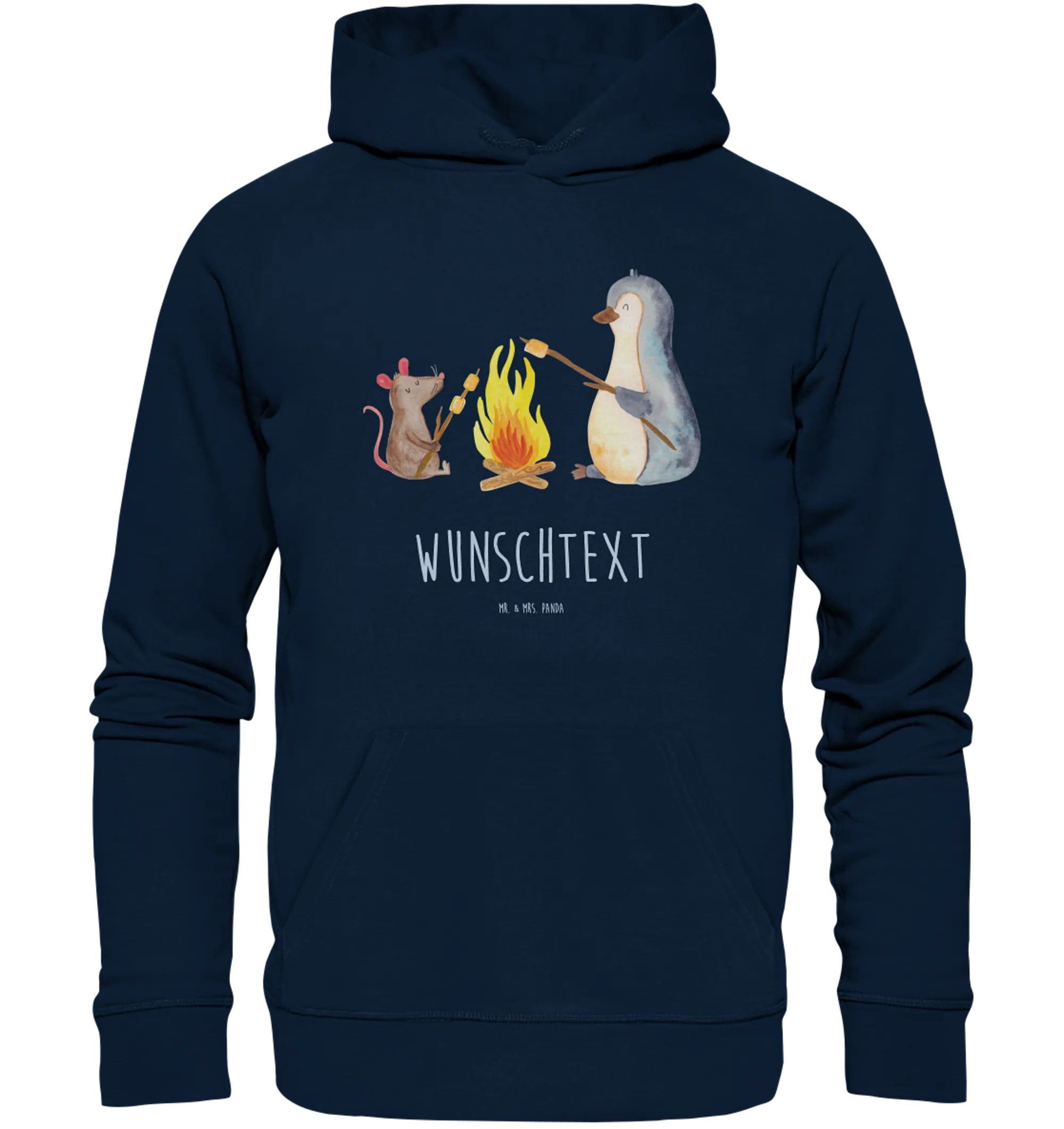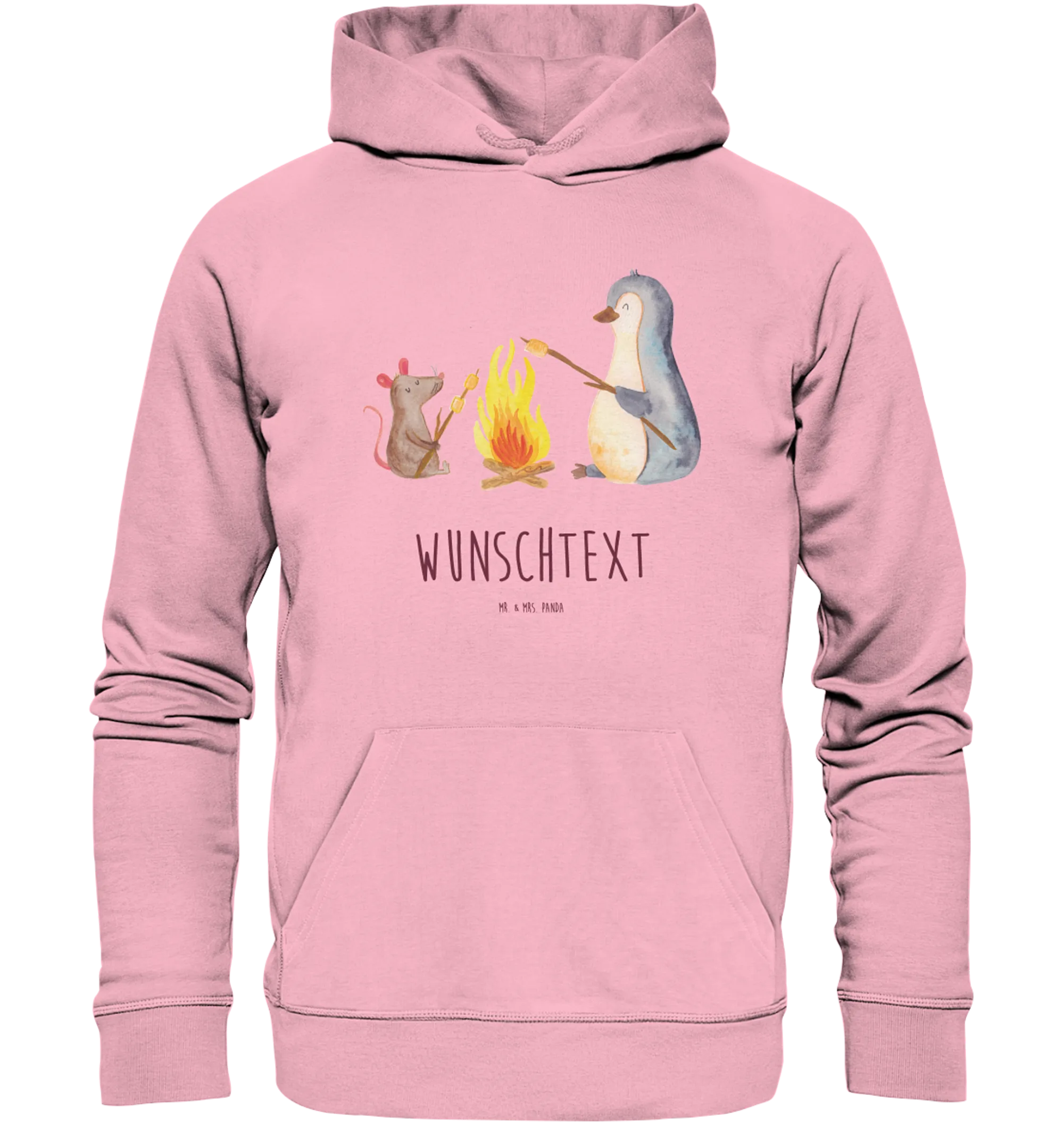 Das einzigartige Design mit einem süßen Pinguin und einer fröhlichen Maus, die am Lagerfeuer sitzen und köstliche Marshmallows rösten, macht diesen Hoodie zu einem echten Blickfang. Und das Beste? Du kannst den Hoodie personalisieren – füge deinen Wunschtext oder Namen hinzu!