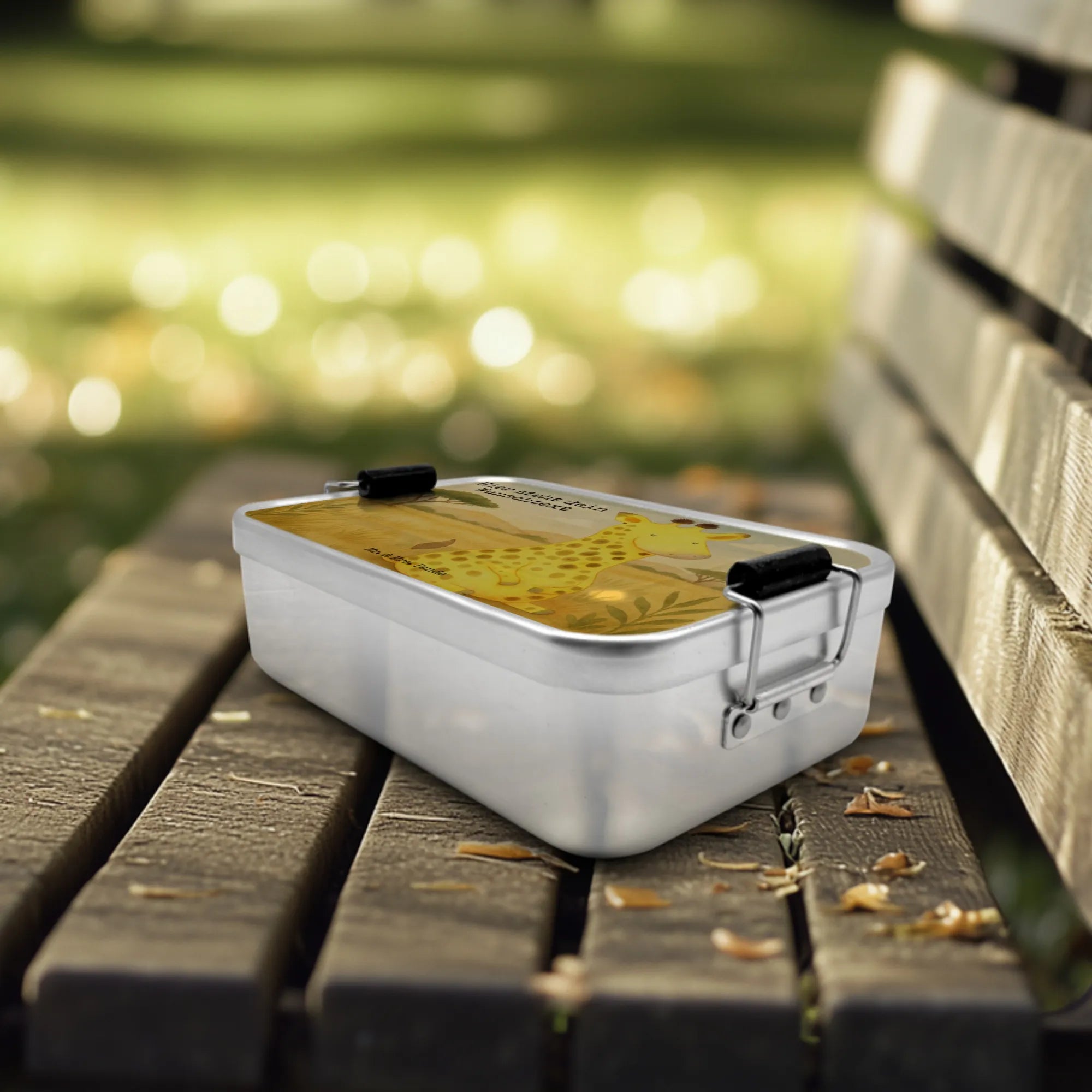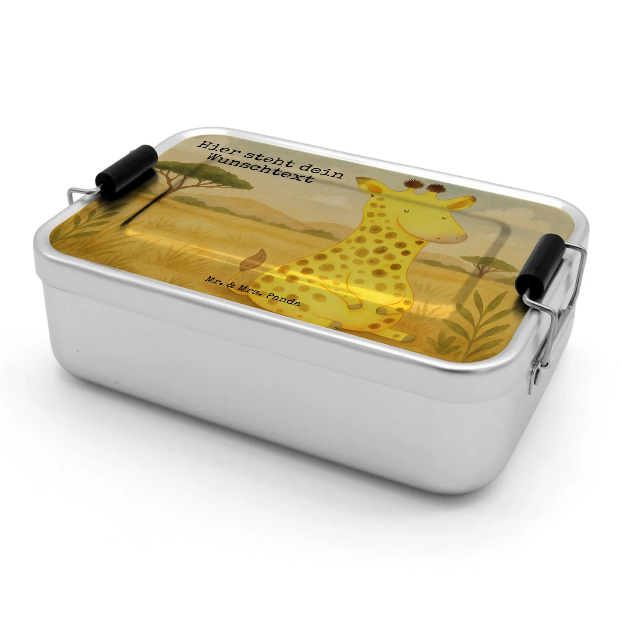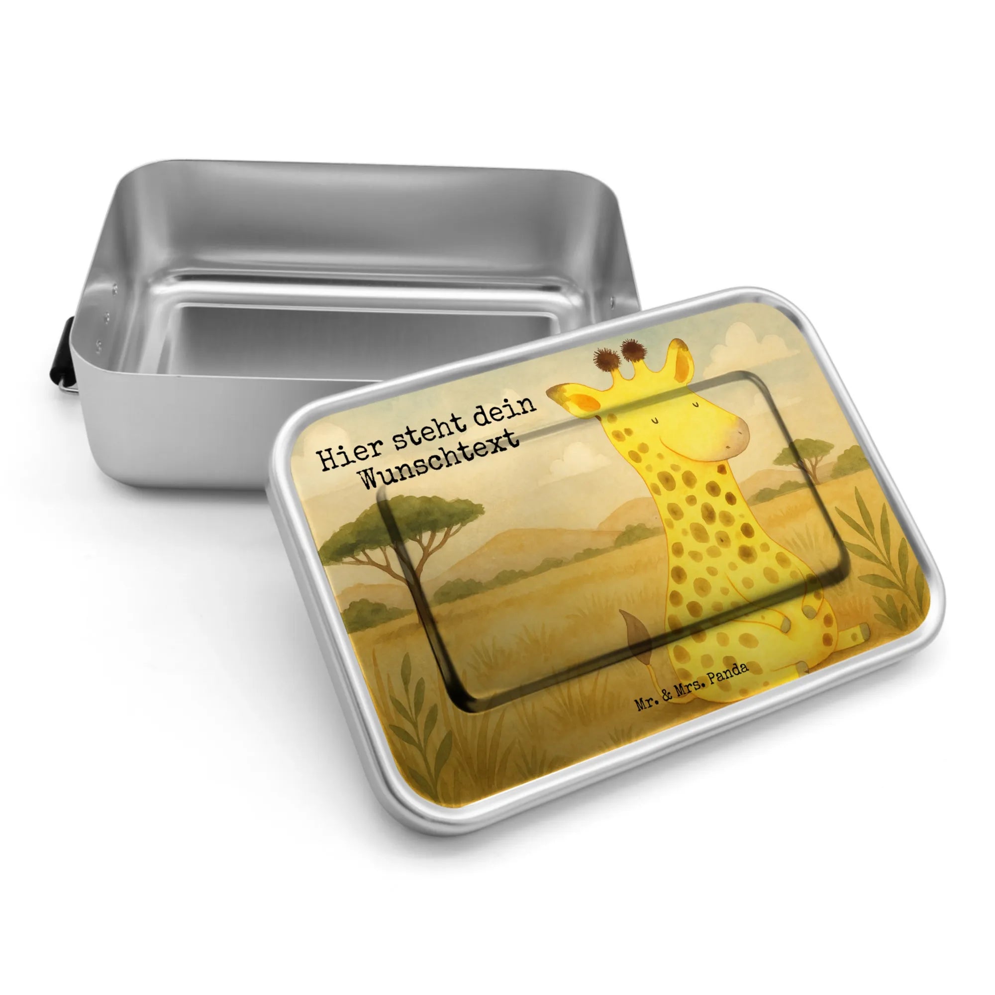 Personalisierte Metall Brotdose „Giraffe Zufrieden“ – ein liebevolles Geschenk von Mr. & Mrs. Panda aus der Afrika Kollektion. Diese Brotbox mit Namen vereint praktischen Alltagsschutz mit einem zarten, handgezeichneten Motiv: Eine zufriedene Giraffe, die Ruhe, Glück und Abenteuerlust ausstrahlt. Ideal als Brotdose für Schule, Kindergarten, Uni oder für unterwegs.