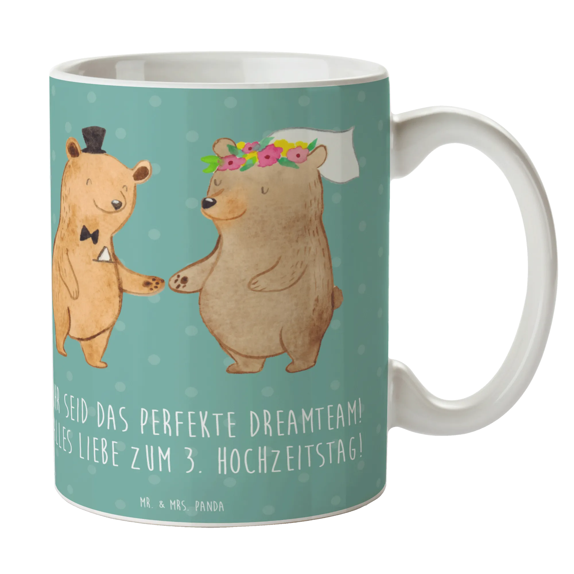 Die wunderschöne Tasse zum 3. Hochzeitstag von Mr. & Mrs. Panda ist das perfekte Geschenk für alle, die die Liebe zelebrieren möchten! Diese spülmaschinenfeste Keramiktasse begeistert mit einem tollen Motiv, das zum Feiern einlädt.