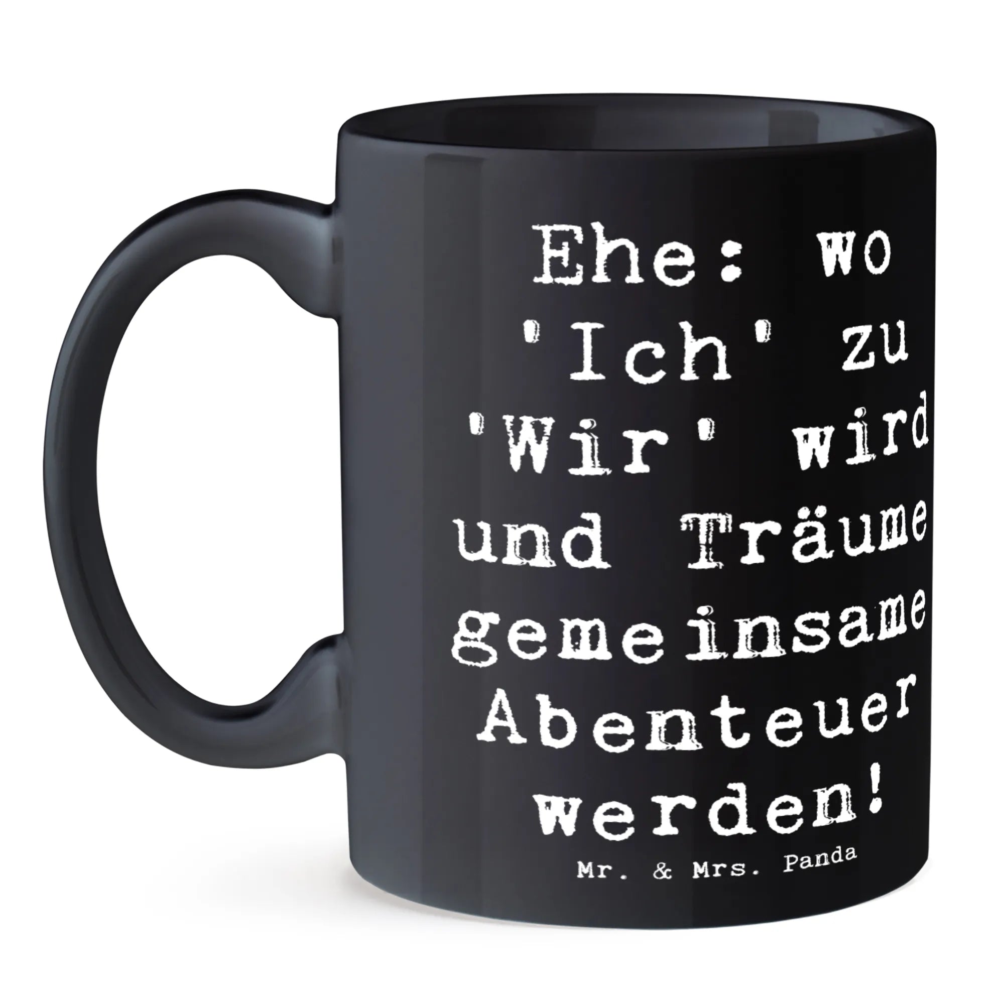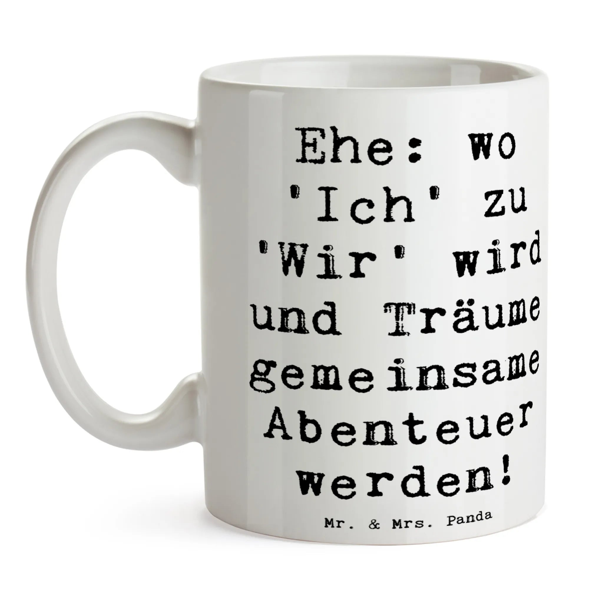 Eine wunderschöne spülmaschinenfeste Keramiktasse von Mr. & Mrs. Panda ist das perfekte Geschenk für jedes frisch vermählte Paar oder als liebevolle Geste zur Hochzeit. Mit dem liebevollen Spruch "Ehe: wo 'Ich' zu 'Wir' wird und Träume gemeinsame Abenteuer werden!" wird diese Tasse schnell zum täglichen Begleiter im Büro oder Zuhause. Ob für das gemütliche Frühstück zu zweit oder ein romantisches Teestündchen, diese Tasse zaubert jedem ein Lächeln ins Gesicht.