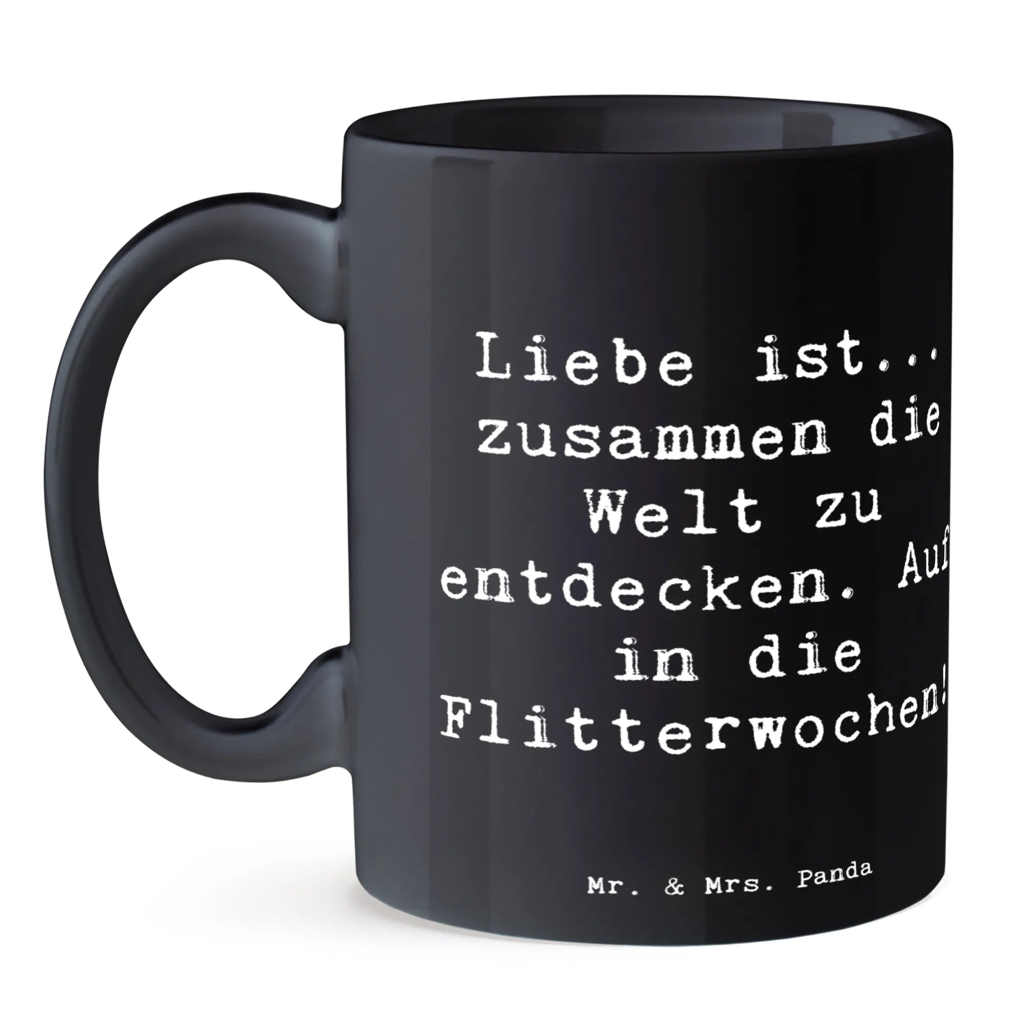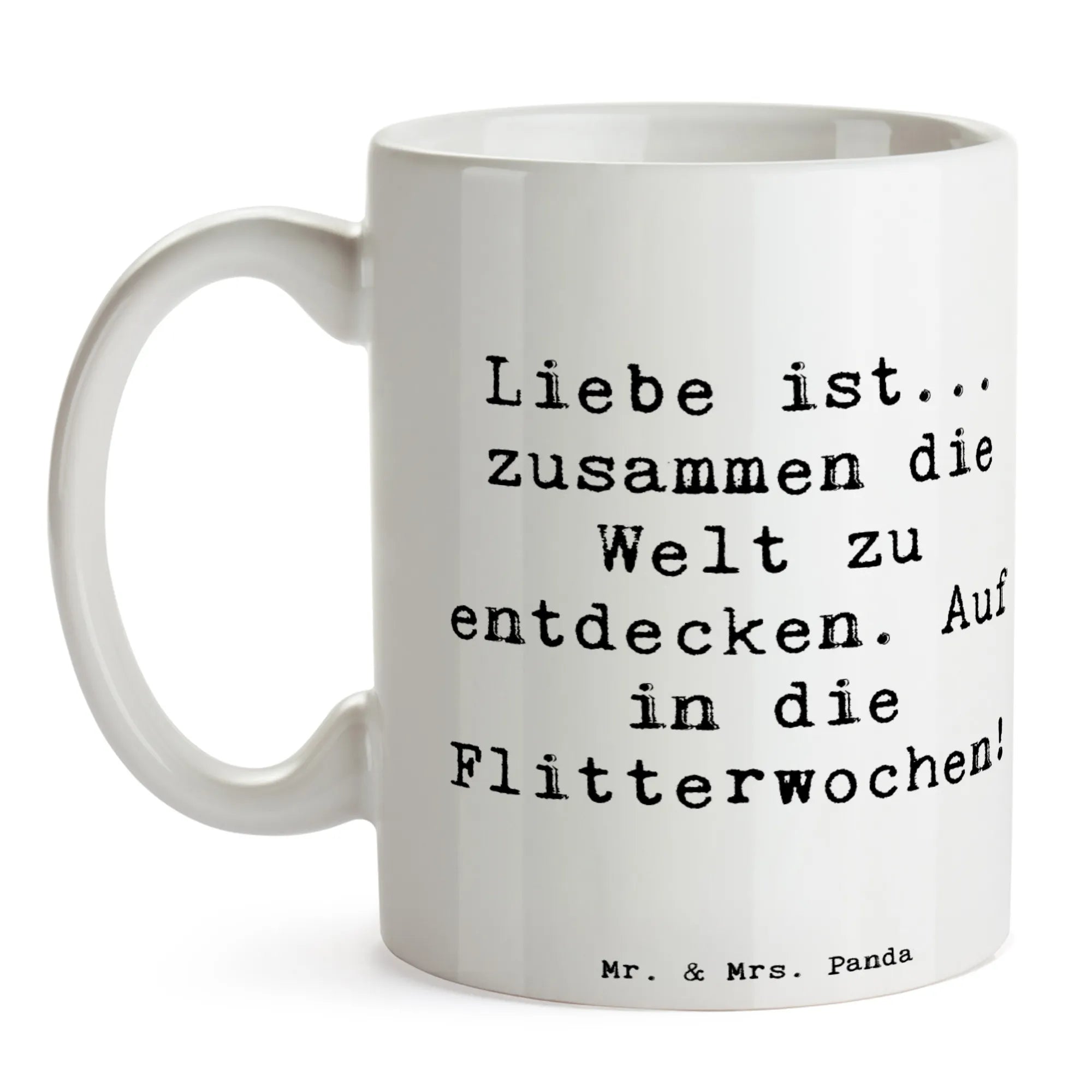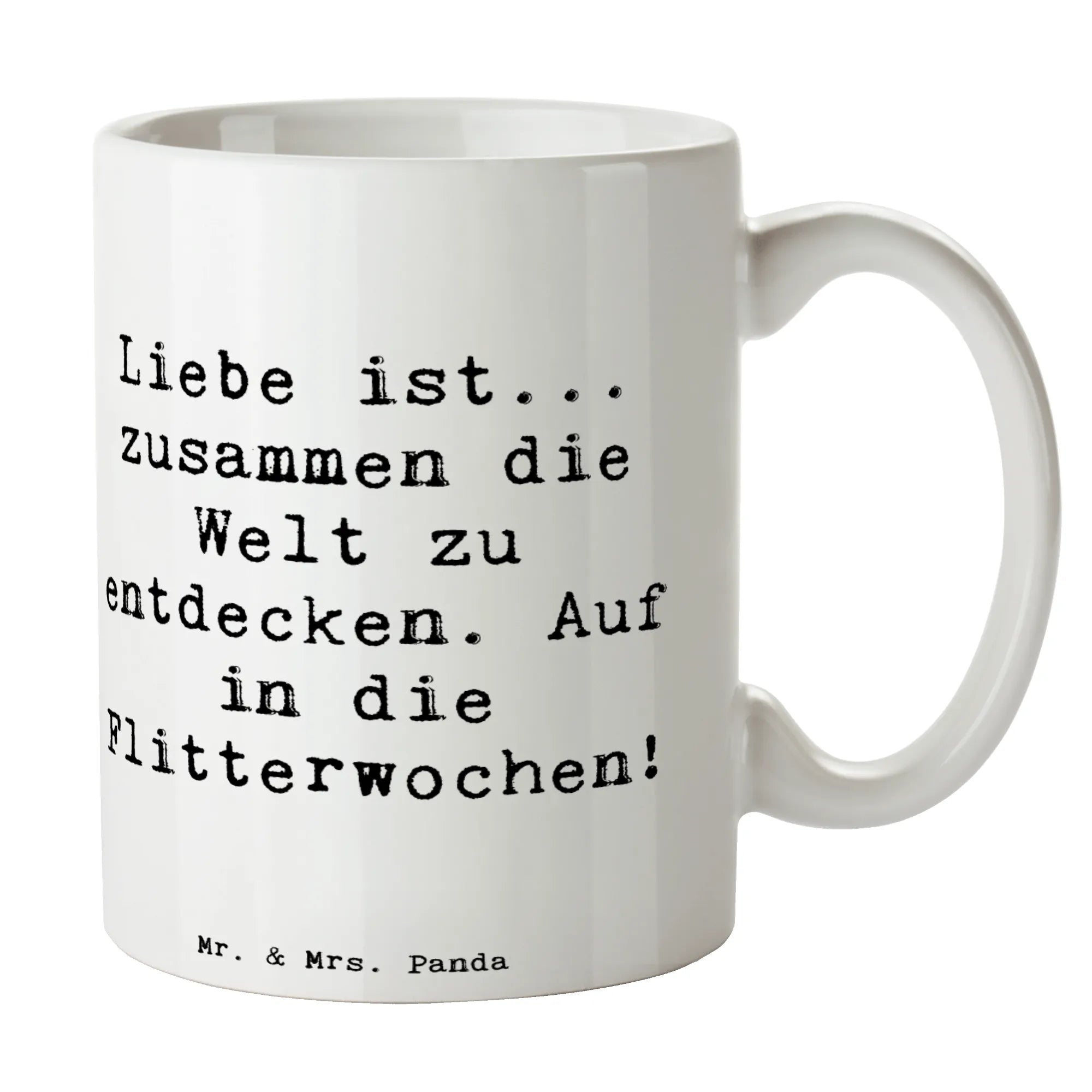 Die wunderschöne Tasse "Flitterwochen" aus der Hochzeit-Kollektion von Mr. & Mrs. Panda ist das perfekte Geschenk für frisch verheiratete Paare, die ihre Liebe feiern möchten. Diese spülmaschinenfeste Keramiktasse mit dem bezaubernden Slogan "Liebe ist... zusammen die Welt zu entdecken. Auf in die Flitterwochen!" erinnert jeden Tag an die besonderen Momente der gemeinsamen Zeit und ist ideal für den gemeinsamen Kaffee oder Tee am Morgen.