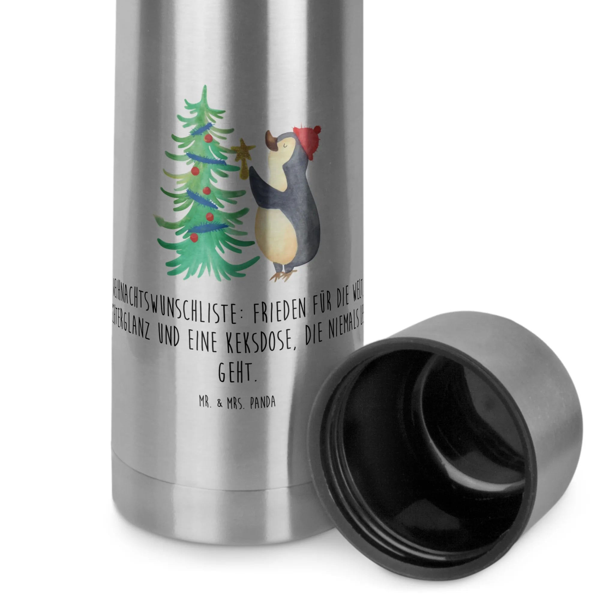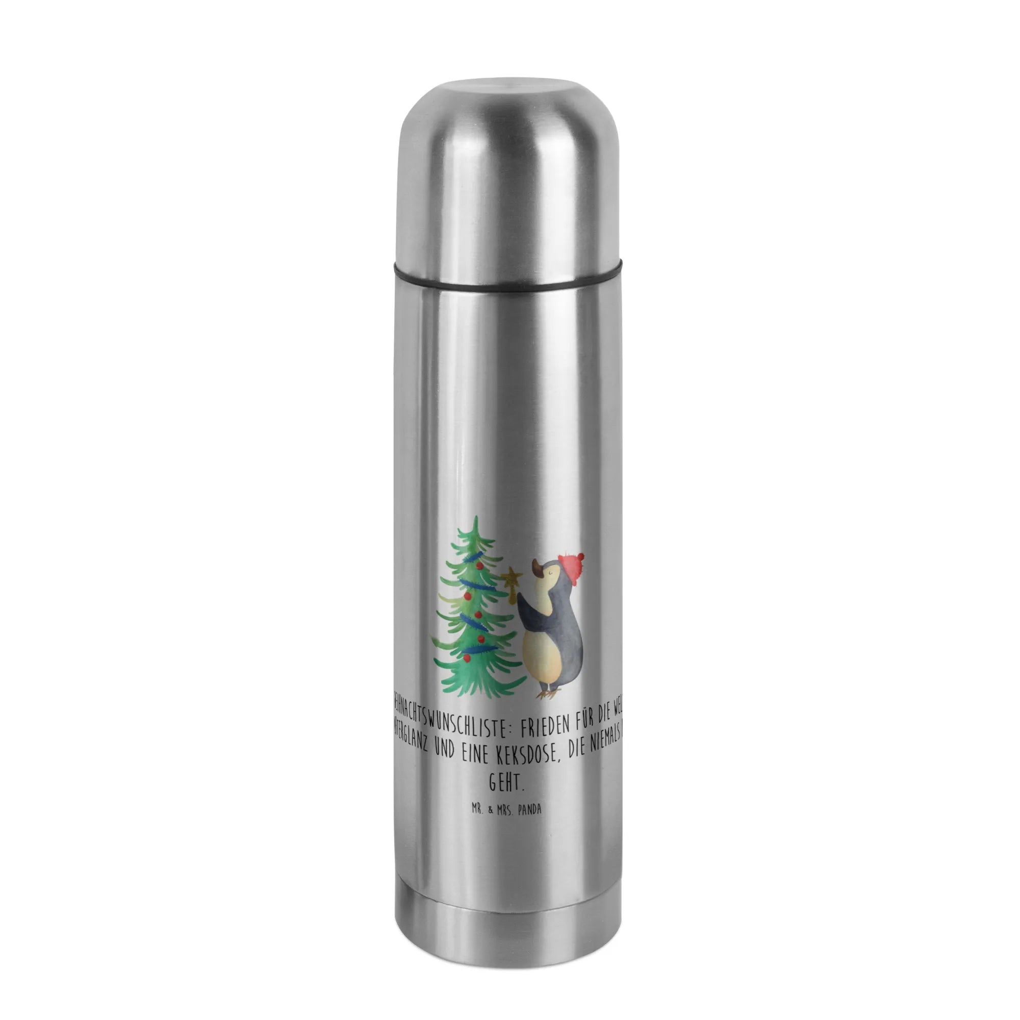 Entdecke die zauberhafte Thermoskanne mit dem niedlichen Pinguin Weihnachtsbaummotiv aus der Winter Kollektion von Mr. & Mrs. Panda! Diese wunderschöne Thermoskanne ist nicht nur ein echter Blickfang, sondern auch der perfekte Begleiter für die kalte Jahreszeit. Sie besteht aus robustem Edelstahl und bietet eine brillante Druckqualität, die das süße Motiv toll zur Geltung bringt. Mit ihrem charmanten Design, das einen freudigen Pinguin zeigt, der einen Weihnachtsbaum schmückt, bist du bestens für die festliche Zeit gerüstet. Der Slogan "Weihnachtswunschliste: Frieden für die Welt, Lichterglanz und eine Keksdose, die niemals leer geht." ergänzt das Design auf eine liebevolle Art und Weise.
