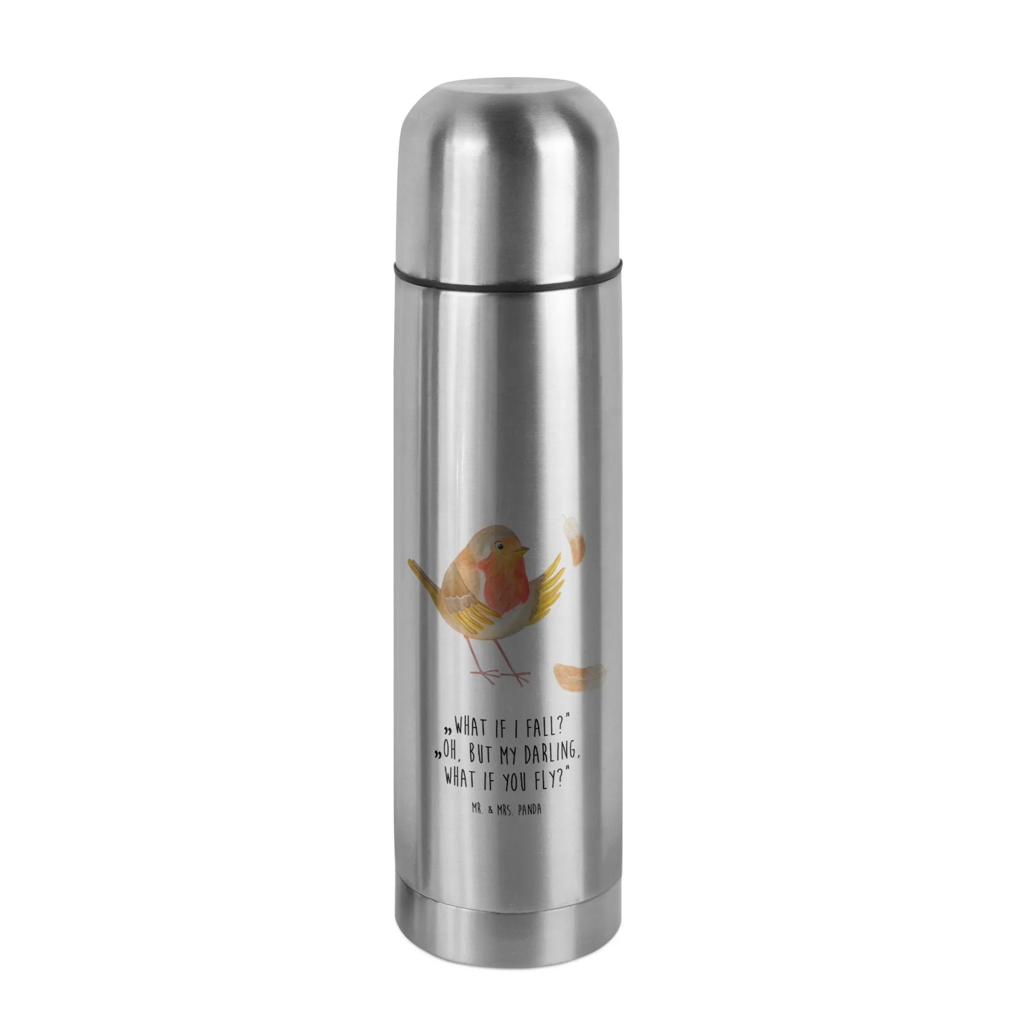 Mit ihrem süßen Motiv eines niedlichen Rotkehlchens, das von bunten Federn umgeben ist, strahlt diese Thermoskanne eine friedliche Ruhe aus, die uns daran erinnert, wie schön es ist, im Moment zu leben. Der Spruch „What if I fall? Oh, but my darling, what if you fly?“ lädt dazu ein, mutig zu sein und neue Höhen zu erreichen.