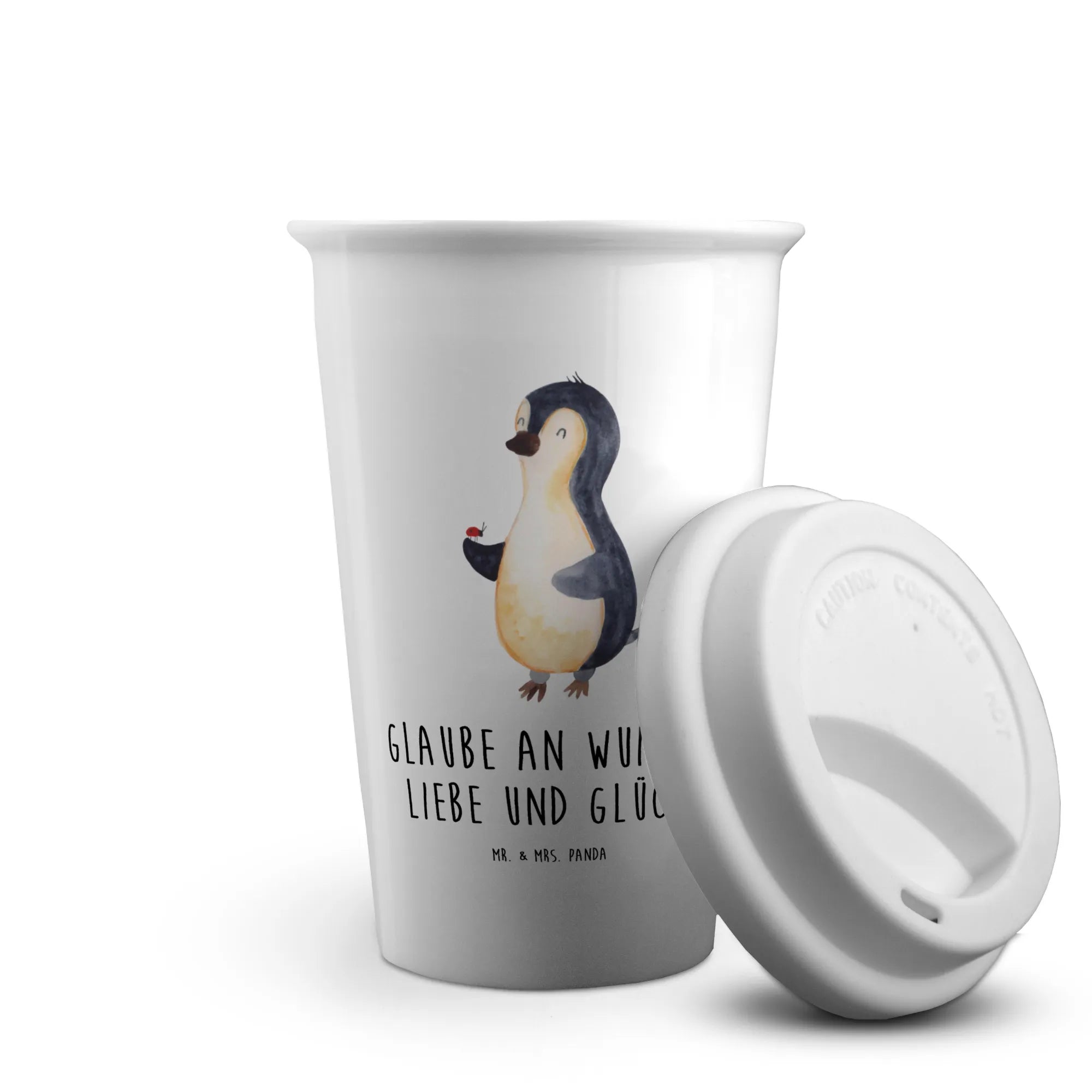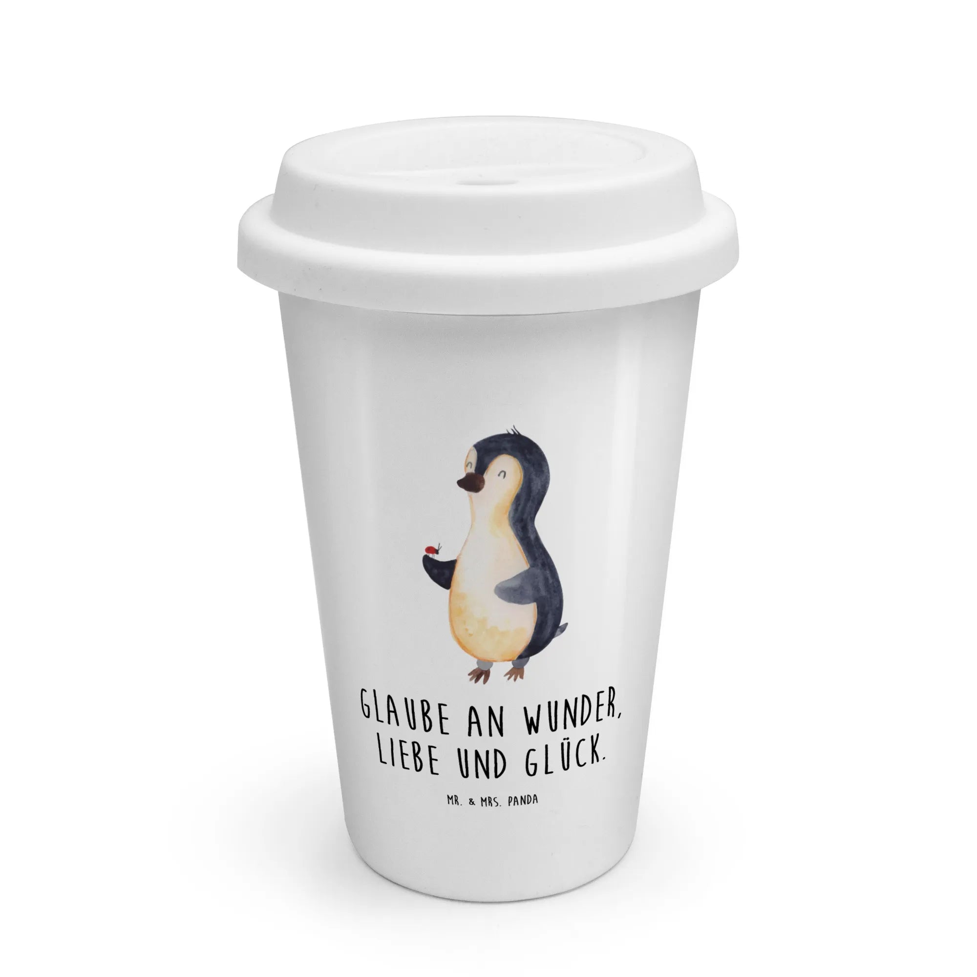 Mr. & Mrs. Panda To Go Becher „Pinguin Marienkäfer“ – Dein neuer Liebling für unterwegs. Der niedliche Pinguin mit dem fröhlichen Marienkäfer auf der Flosse und der warme Spruch „Glaube an Wunder, Liebe und Glück.“ bringen gute Laune in Deinen Alltag. 🌟