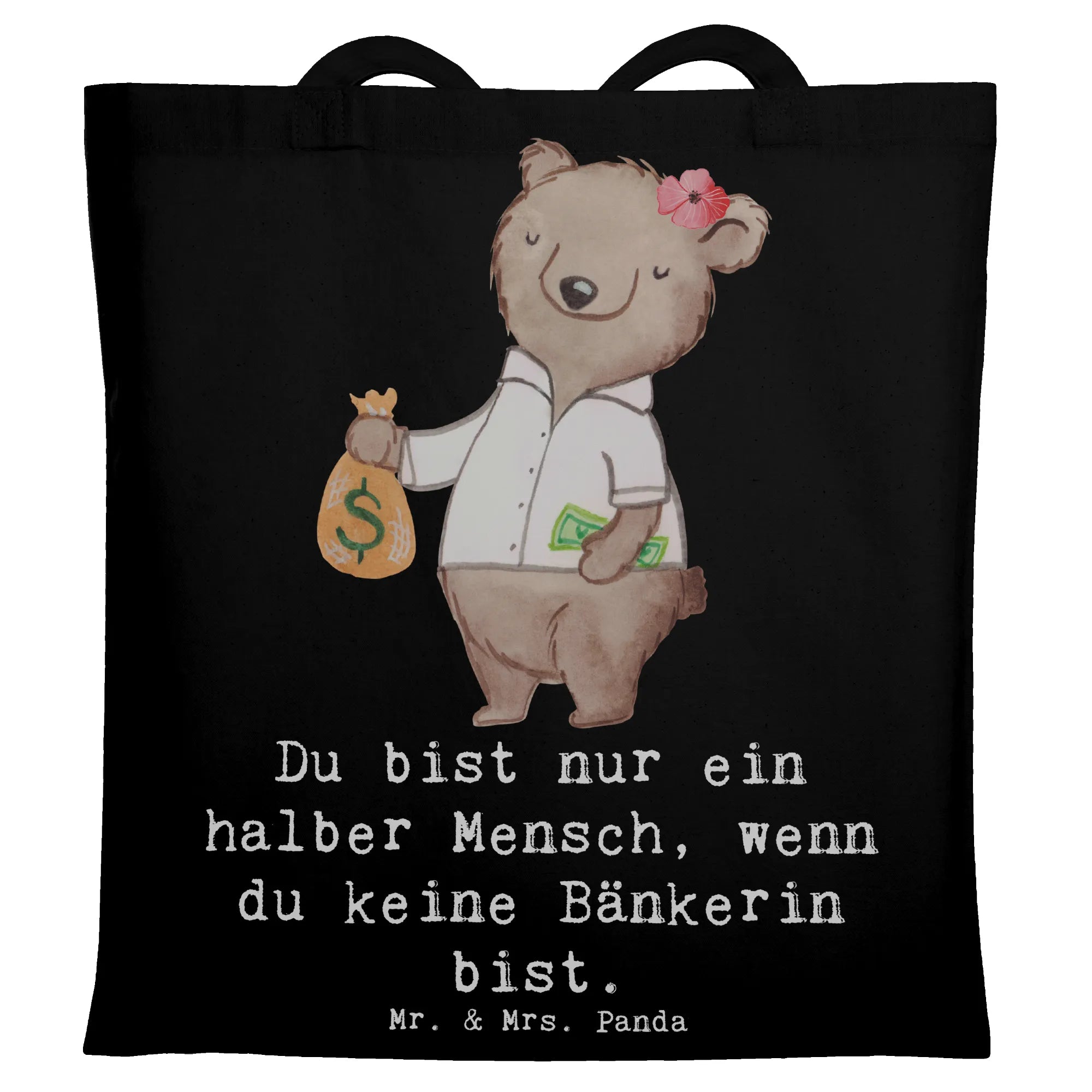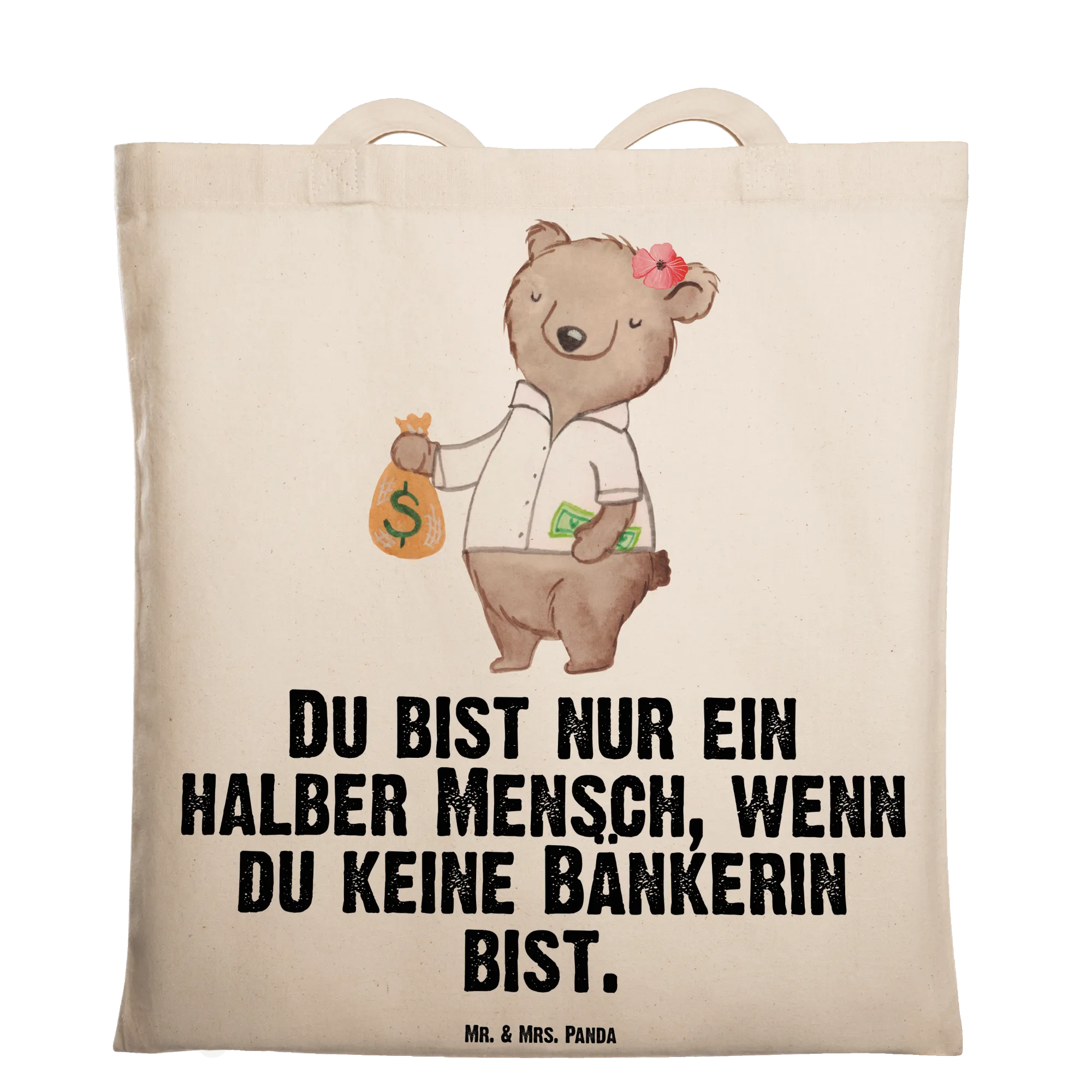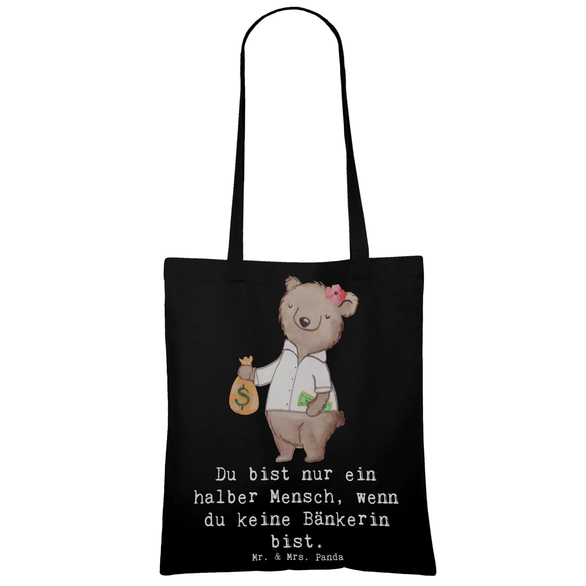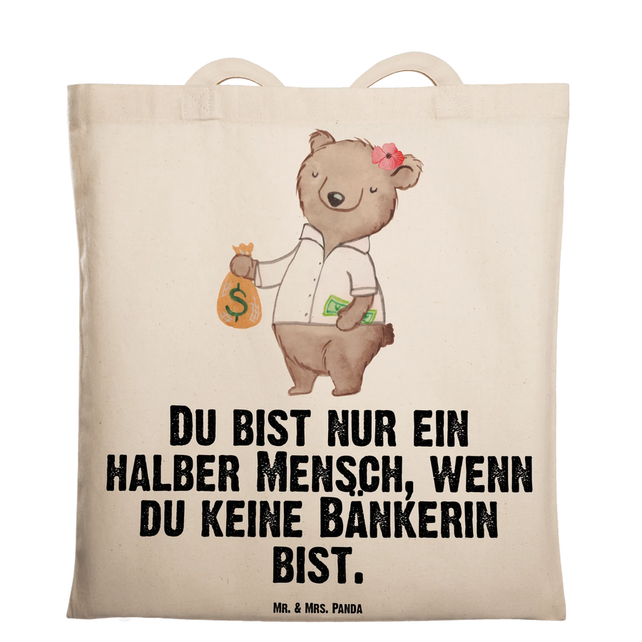 Eine wunderschöne Tragetasche von Mr. & Mrs. Panda – perfekt für alle Bänkerinnen mit Herz. Das Motiv „Bänkerin mit Herz" zeigt unsere süße Bärendame mit Geldsack und trägt den frechen Spruch: „Du bist nur ein halber Mensch, wenn du keine Bänkerin bist." Eine liebevolle Hommage an alle Bankfachfrauen, Bankangestellten und Bankberaterinnen.