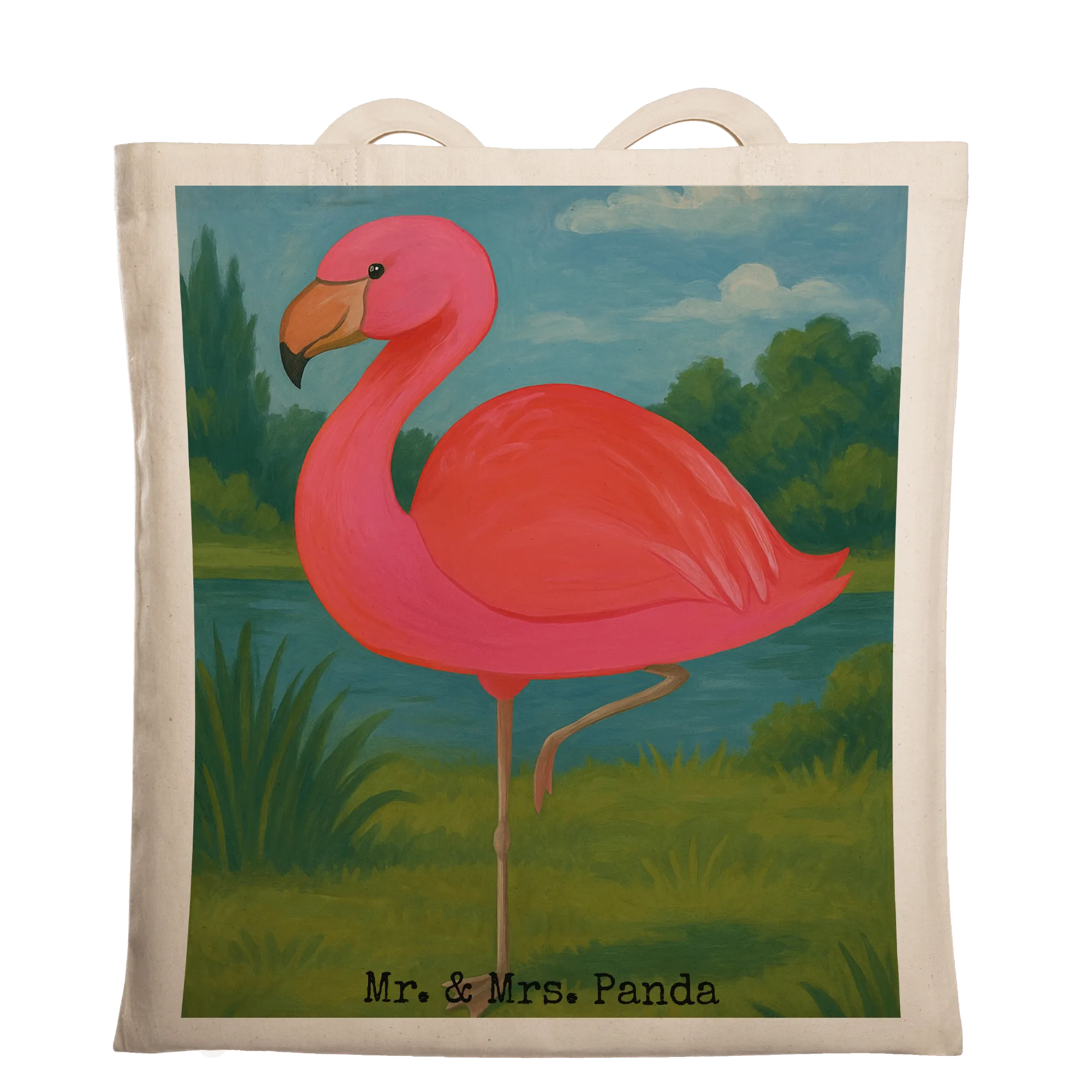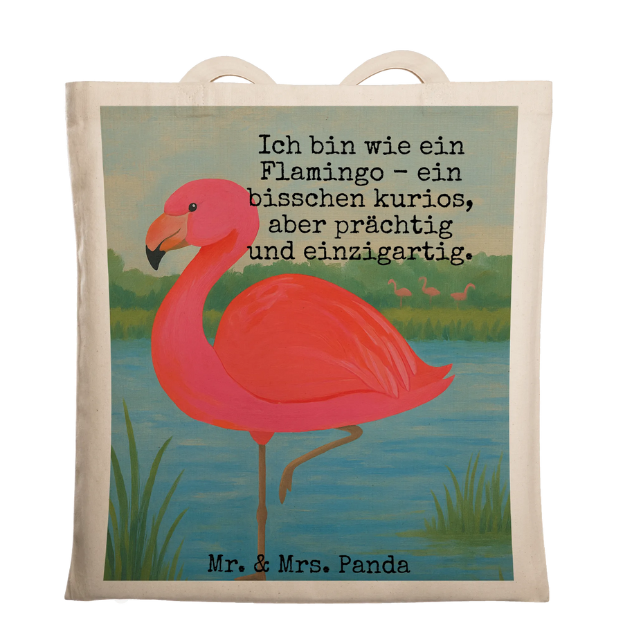 Mr. & Mrs. Panda Tragetasche Flamingo classic – die perfekte Kombination aus Alltagstauglichkeit und fröhlichem Design. Der von Mrs. Panda handgezeichnete Flamingo in warmen Rosa- und Pinktönen und der liebevolle Spruch "Ich bin wie ein Flamingo - ein bisschen kurios, aber prächtig und einzigartig." machen diese Stofftasche zu einem besonderen Hingucker.