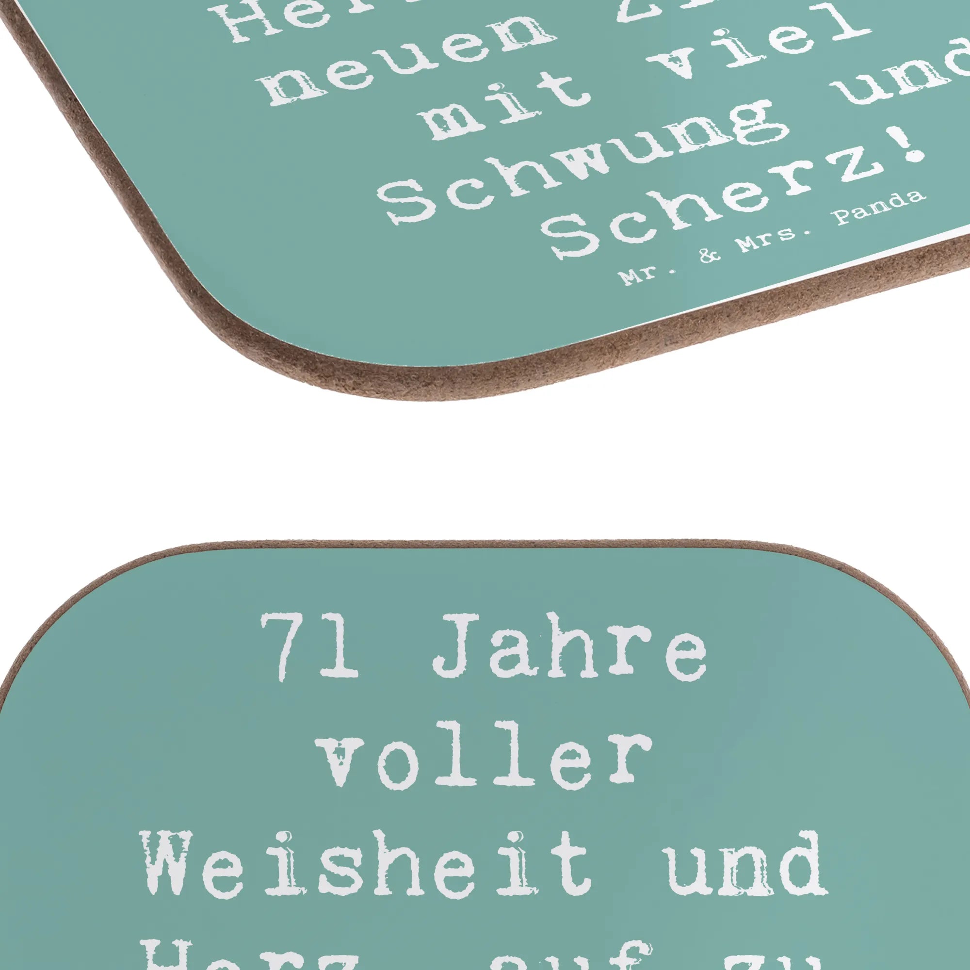Der perfekte Untersetzer zum 71. Geburtstag für all die besonderen Momente! Mit einem charmanten Spruch, der direkt ins Herz geht: "71 Jahre voller Weisheit und Herz, auf zu neuen Zielen mit viel Schwung und Scherz!" Dieser wunderschöne quadratische Untersetzer von Mr. & Mrs. Panda ist mehr als nur ein praktisches Accessoire – er ist ein liebevolles Geschenk, das Deinen Tisch schmückt und die Stimmung bei jeder Feier hebt.