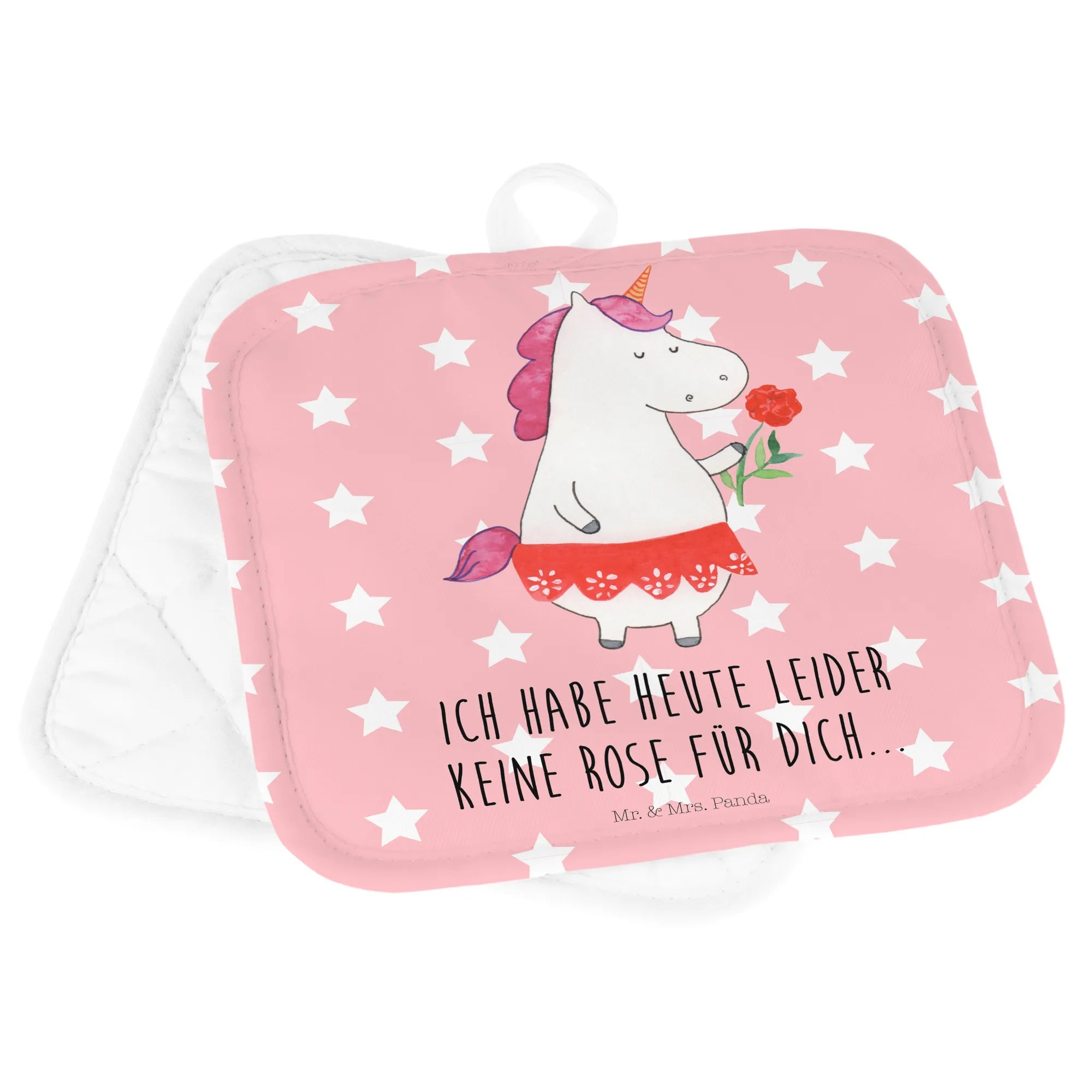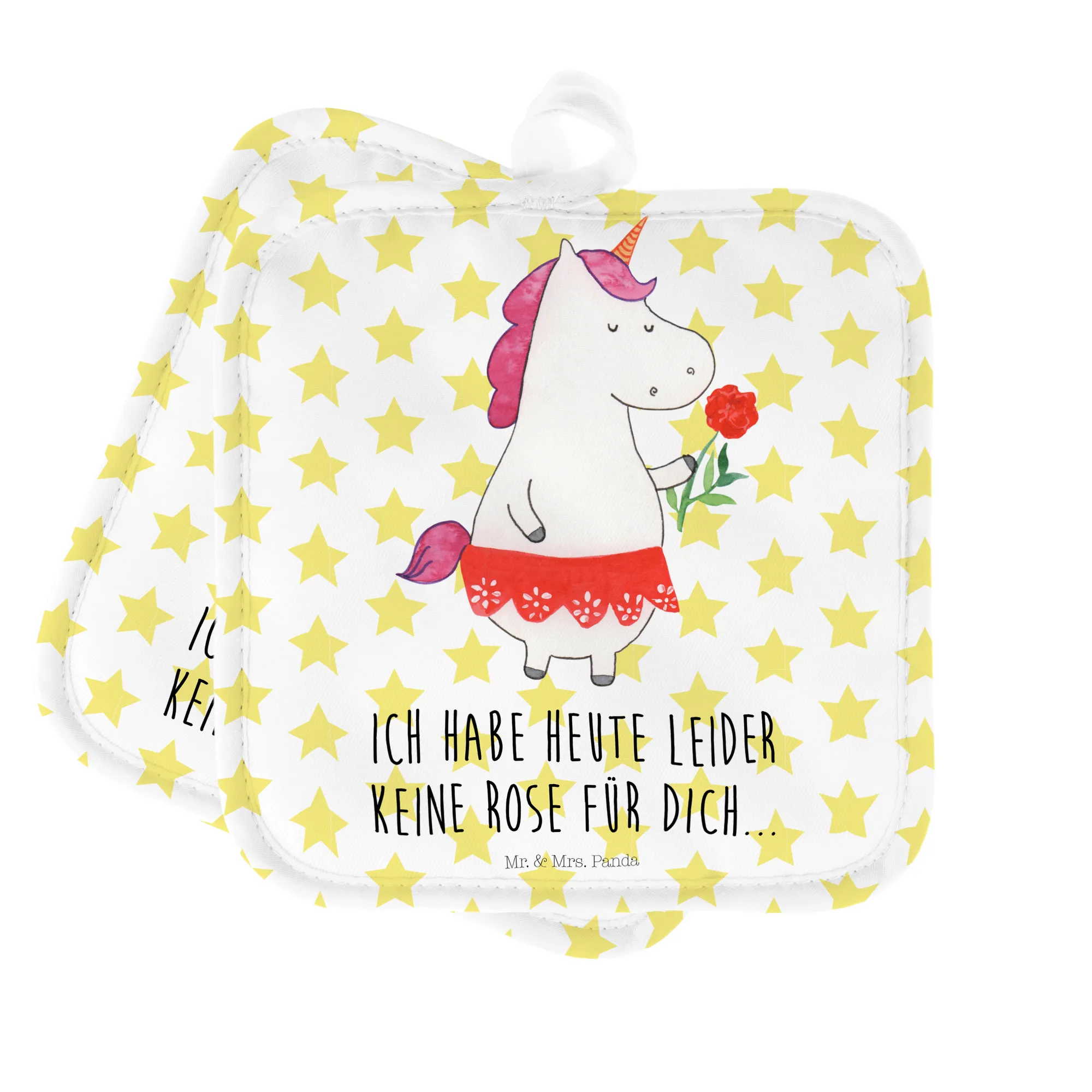 Entdecke das 2er Set Topflappen Einhorn Dame von Mr. & Mrs. Panda - der perfekte Begleiter für jede feine Dame in deiner Küche! Diese wunderschönen Topflappen bringen nicht nur Farbe, sondern auch eine Portion Magie in dein Kocherlebnis. Mit liebevoll handgezeichneten Einhorn-Motiven und dem charmanten Spruch "Ich habe heute leider keine Rose für dich" werden sie schnell zum Lieblingsaccessoire jeder Hobbyköchin.