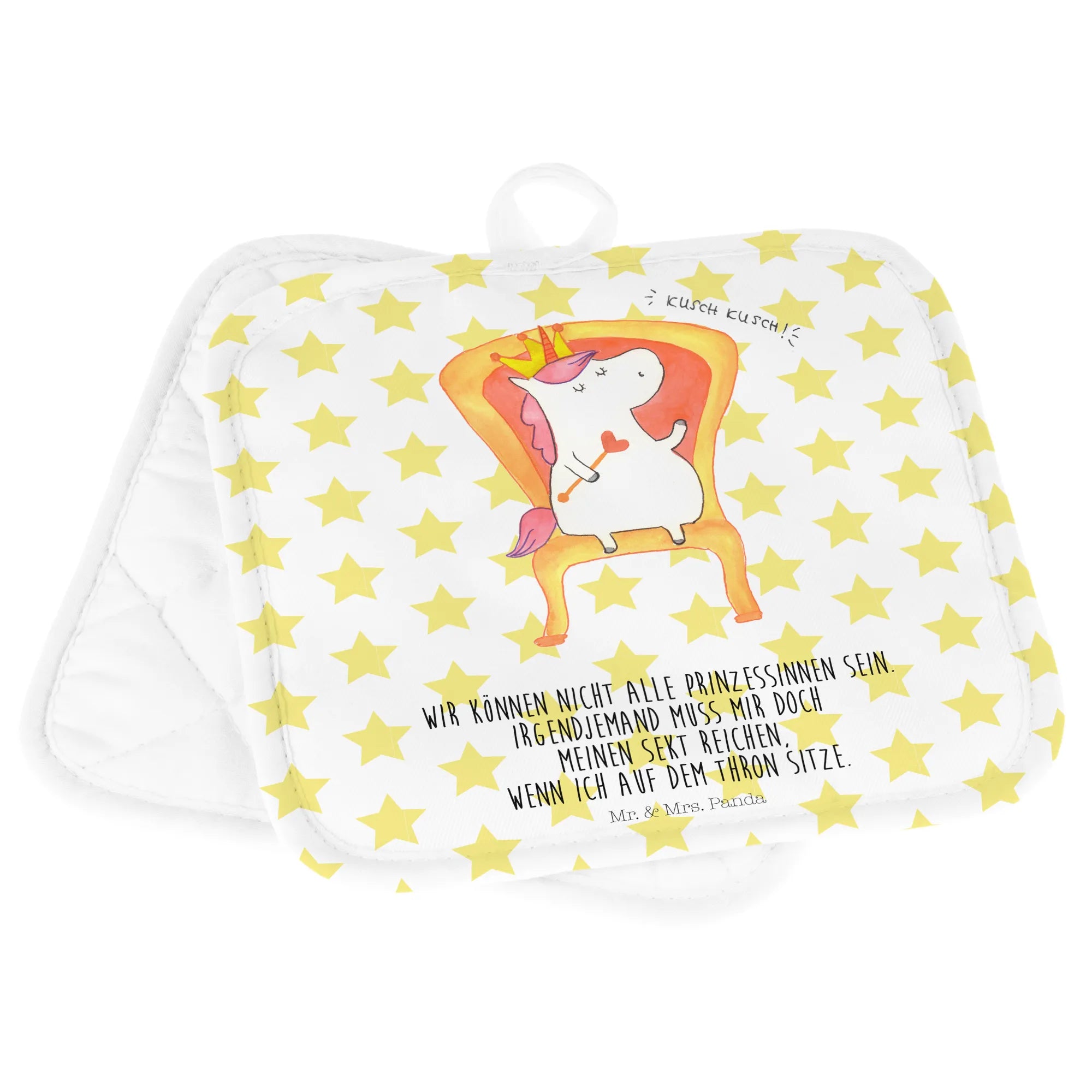 Willkommen in der Welt von Mr. & Mrs. Panda, wo Design auf Funktionalität trifft. Unsere 2er Set Topflappen mit einer Größe von 170 mm x 170 mm und einer Dicke von 5 mm sind deine perfekten Begleiter beim Umgang mit heißen Speisen. Aus 100% Polyester gefertigt, überzeugen sie mit außergewöhnlicher Hitzebeständigkeit und sind bei 30°C leicht zu reinigen. Die einseitigen Druckmotive und Sprüche bringen nicht nur Farbe in deine Küche, sondern zaubern auch ein Lächeln auf dein Gesicht. Dank der praktischen Aufhängeschlaufen sind sie stets griffbereit. Egal ob als schicker Topfuntersetzer oder handlicher Ofenhandschuh, mit diesen Topflappen von Mr. & Mrs. Panda machst du jede Mahlzeit zum Vergnügen.