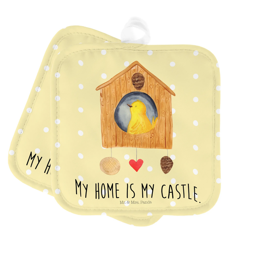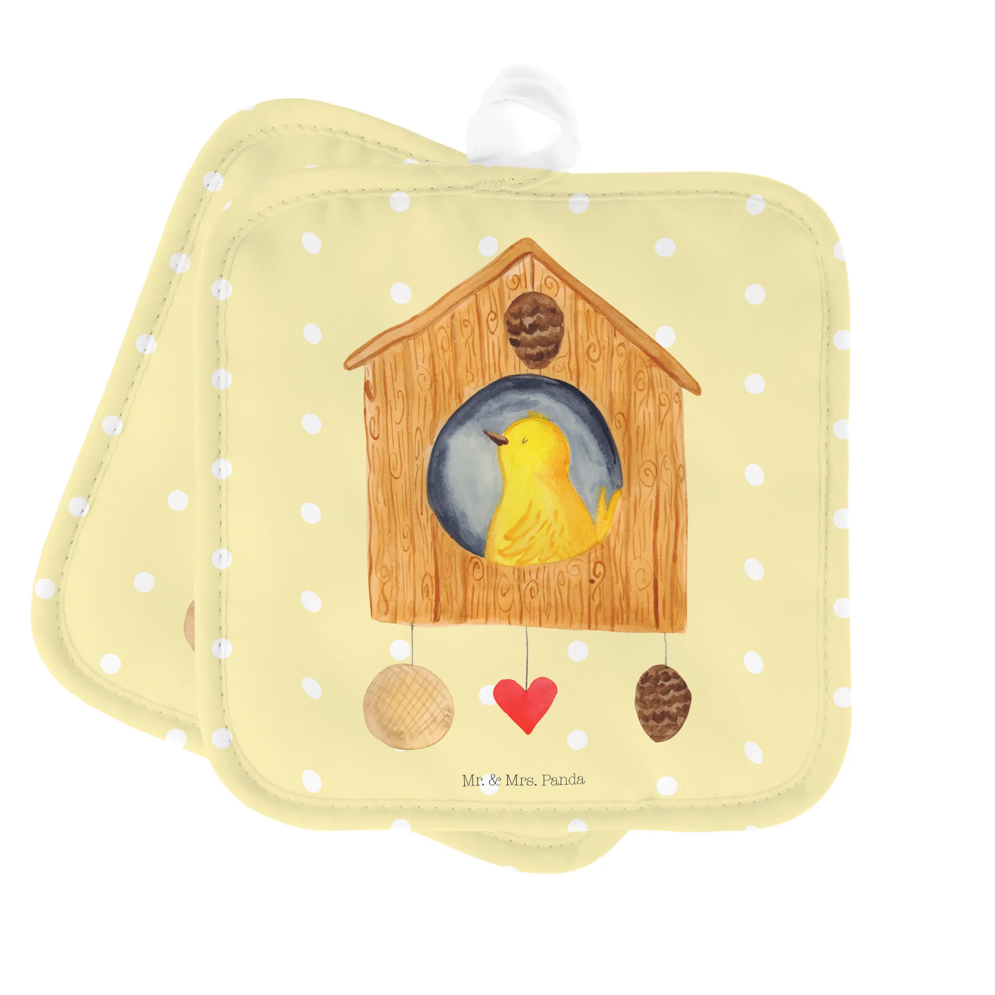 2er Set Topflappen Vogel Haus - mit Spruch - Gelb Pastell