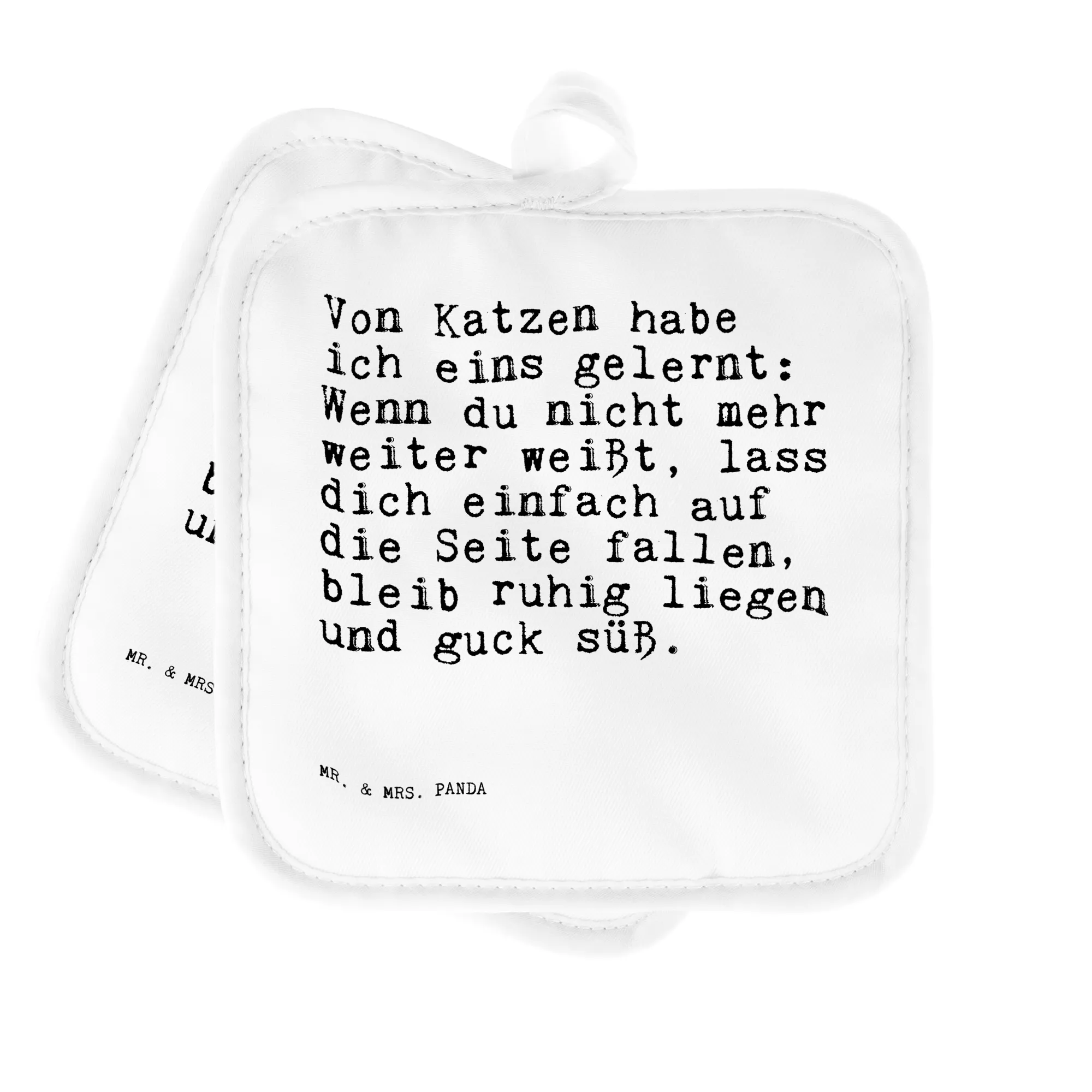 Die zwei wunderschönen Topflappen von Mr. & Mrs. Panda sind nicht nur praktische Küchenhelfer, sondern auch der perfekte Eye-Catcher in jeder Küche! Mit dem liebevollen Spruch "Von Katzen habe ich eins gelernt: Wenn du nicht mehr weiter weißt, lass dich einfach auf die Seite fallen, bleib ruhig liegen und guck süß" bringen sie einen Hauch von Humor und Charme in deinen Kochalltag.