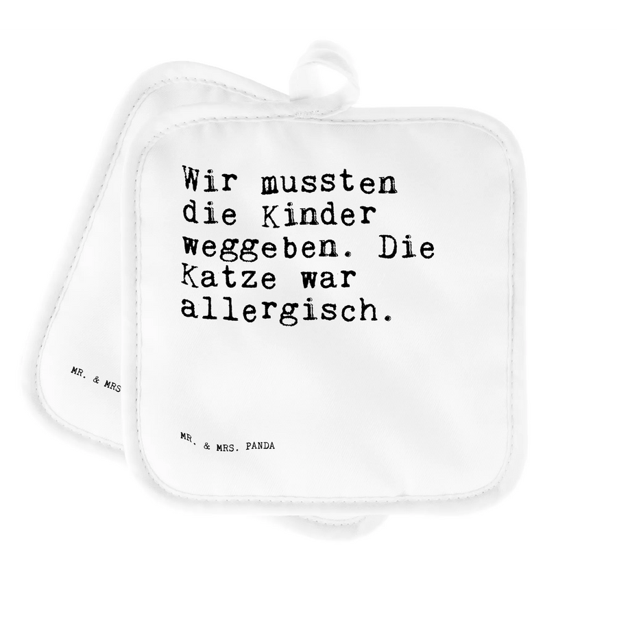 Entdecke die wunderbaren 2er Set Topflappen von Mr. & Mrs. Panda mit dem lustigen Spruch "Wir mussten die Kinder weggeben. Die Katze war allergisch." Dieses Set ist nicht nur praktisch, sondern bringt auch eine Portion Humor in Deine Küche!