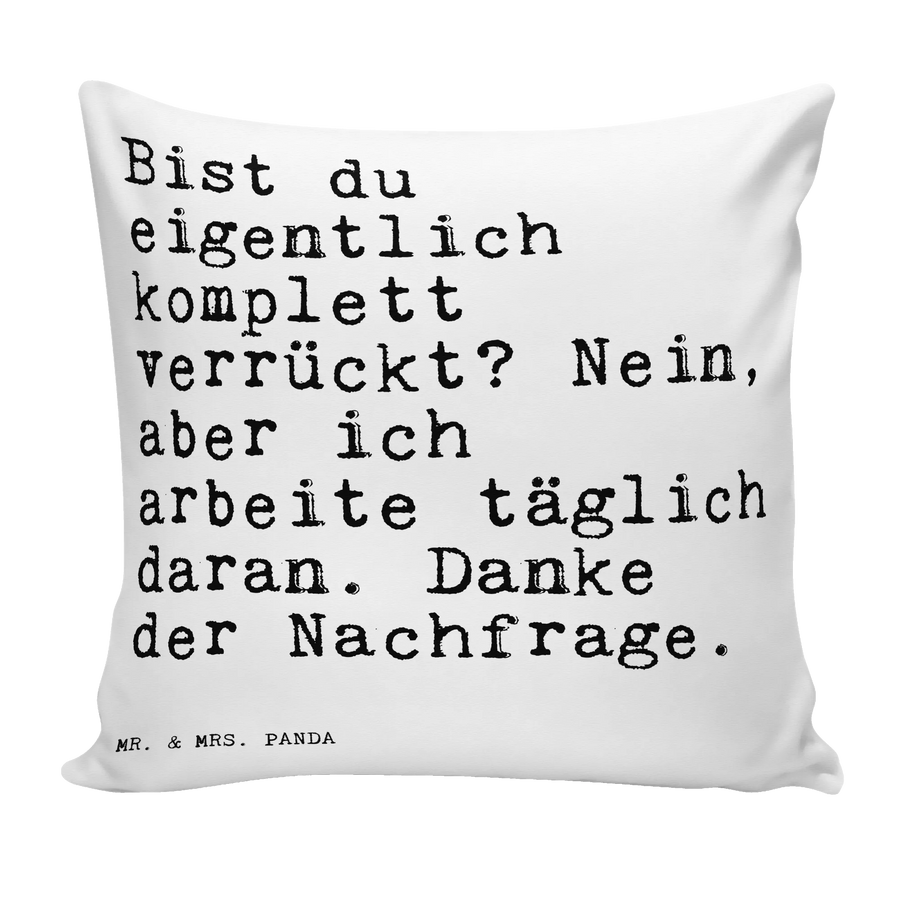 Entdecke das perfekte Kissen für alle, die sich selbst nicht zu ernst nehmen und gerne lachen! Das 40x40 Kissen von Mr. & Mrs. Panda mit dem witzigen Spruch "Bist du eigentlich komplett verrückt? Nein, aber ich arbeite täglich daran. Danke der Nachfrage." ist ein absolutes Must-Have für jeden Selbstdarsteller und Spaßvogel. Egal ob als Dekokissen auf deiner Couch, als Sofakissen im Wohnzimmer oder als gemütliches Kopfkissen im Schlafzimmer, dieses Kissen bringt frischen Wind in dein Zuhause und sorgt für ein Lächeln auf jedem Gesicht.
