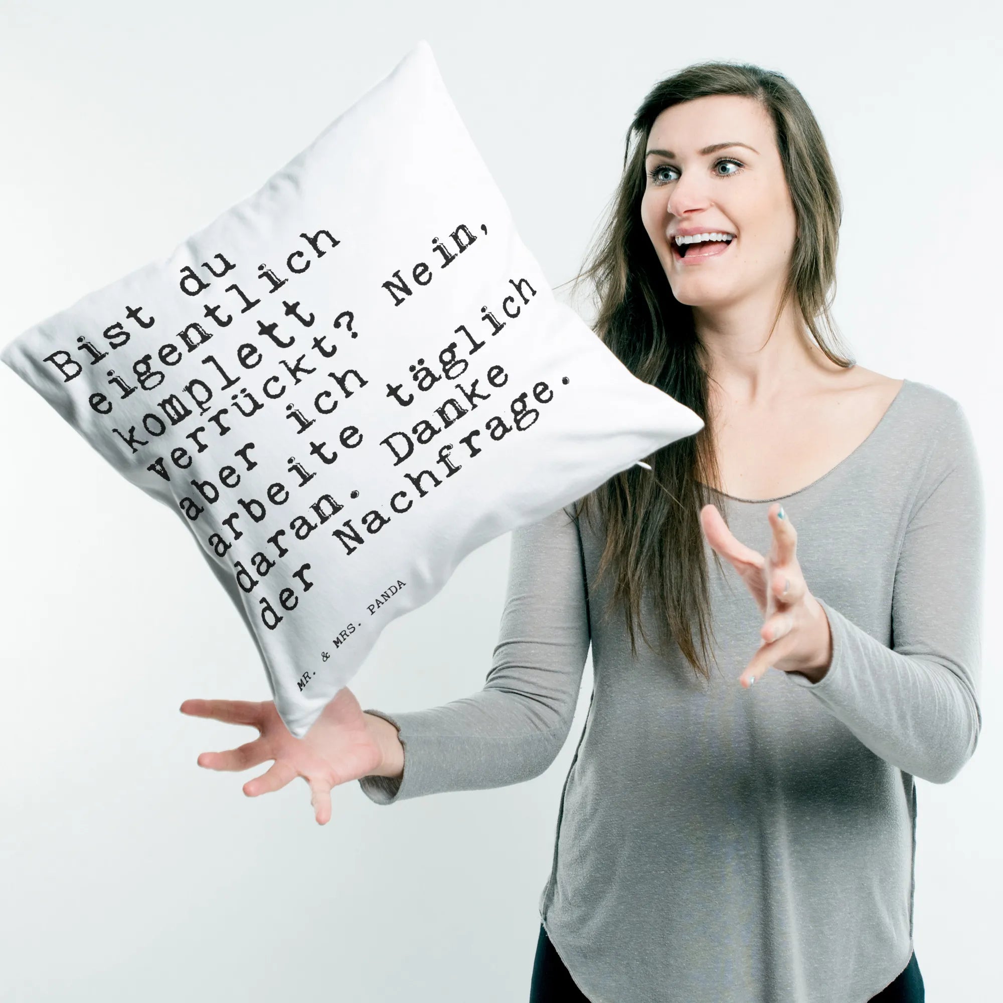 Dieses Kissen eignet sich ideal für diejenigen, die eine Vorliebe für Humor und kreative Sprüche haben. Ob für deine verrückte Freundin, deinen besten Freund im Büro oder die Ehefrau, die für jeden Spaß zu haben ist – dieser Kissenbezug mit dem Spruch ist die beste Wahl! Außerdem ist die Spruchreihe von Mr. & Mrs. Panda liebevoll gestaltet und zeigt, dass kleine Worte großen Einfluss haben können. Lass dein Zuhause mit diesem Kissen strahlen und ziehe alle Blicke auf dich. Schenke Freude und ein Lächeln – mit dem Kissen von Mr. & Mrs. Panda wird es ganz leicht!