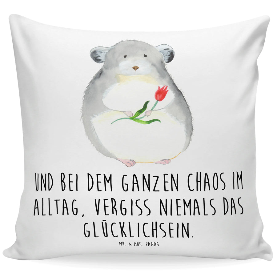 Ein kleines Glück für jeden Tag: Dieses 40x40 Kissen aus der Small World Kollektion von Mr. & Mrs. Panda bringt Dir mit dem Motiv „Chinchilla mit Blume“ ein Lächeln in Alltag und Büro. Das flauschige Chinchilla hält einen Blumenstrauß in der Hand und blickt Dich mit großen Augen an. Der integrierte Spruch „Und bei dem ganzen Chaos im Alltag, vergiss niemals das Glücklichsein.“ erinnert Dich liebevoll daran, das Positive nicht zu vergessen. 🌸