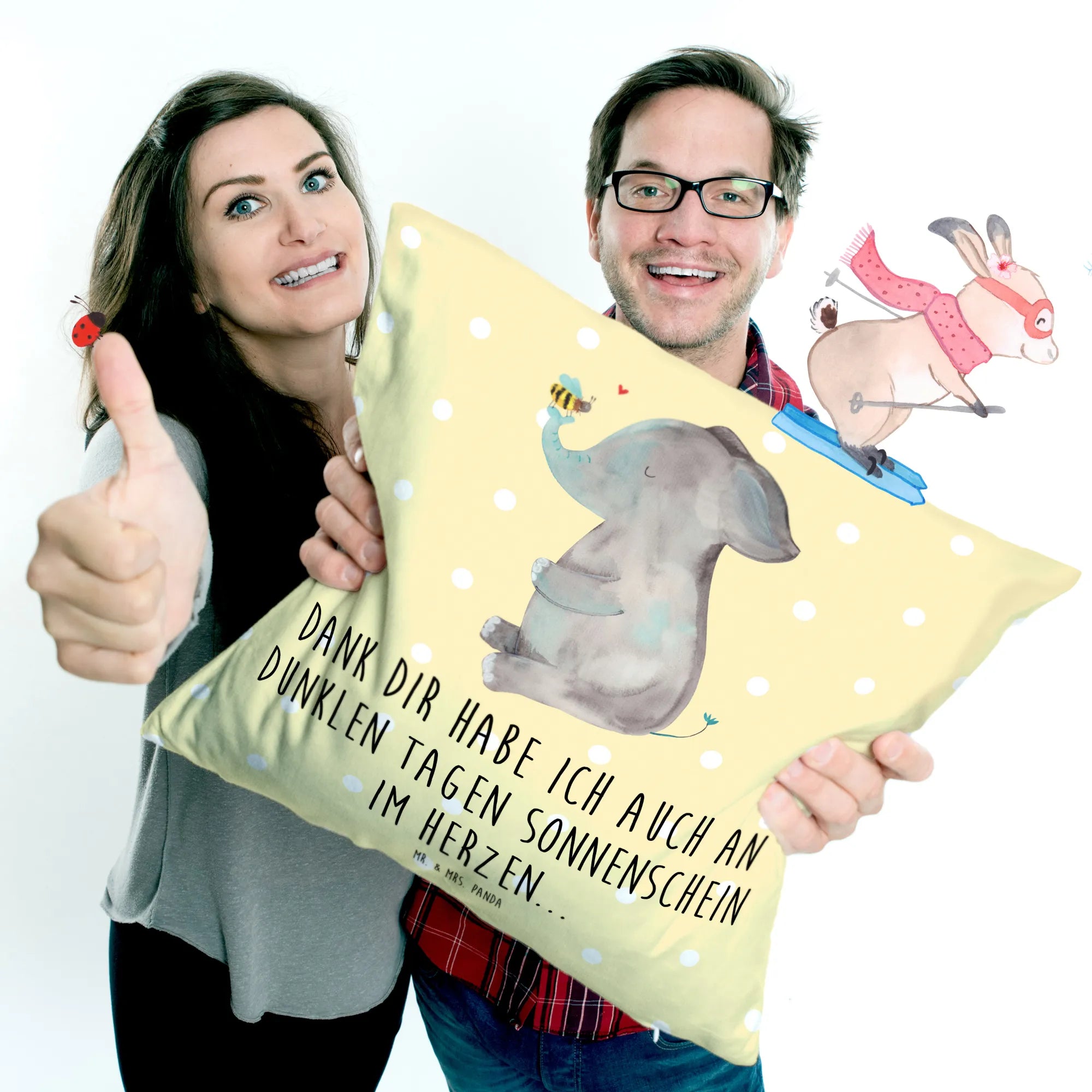 Der Elefant steht für Stärke und Schutz, während die Biene für Fleiß und Kreativität steht. Mit dem Slogan „Dank dir habe ich auch an dunklen Tagen Sonnenschein im Herzen...“ zaubert dieses Kissen jedem ein Lächeln ins Gesicht und erinnert daran, dass auch kleine Gesten große Bedeutungen haben können.