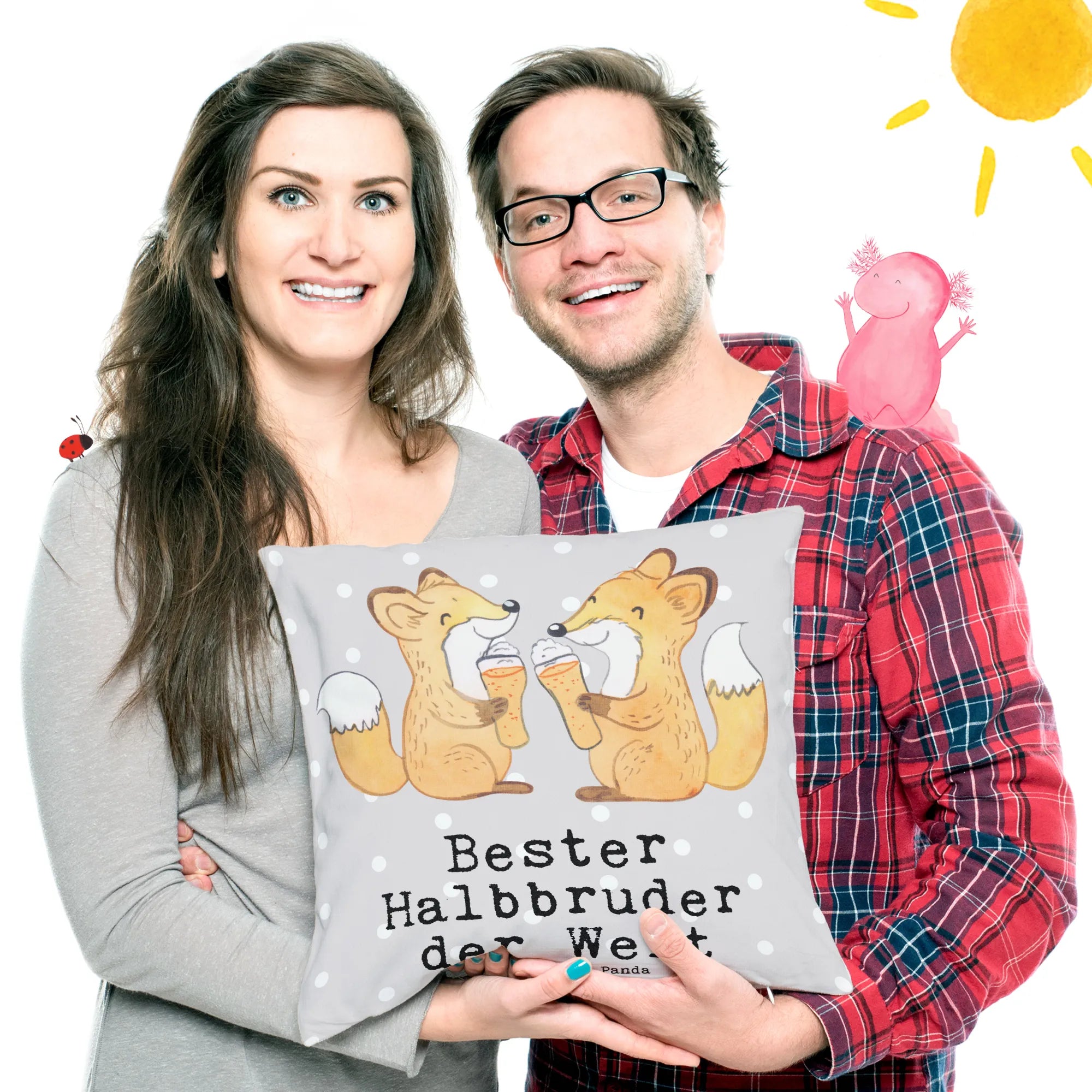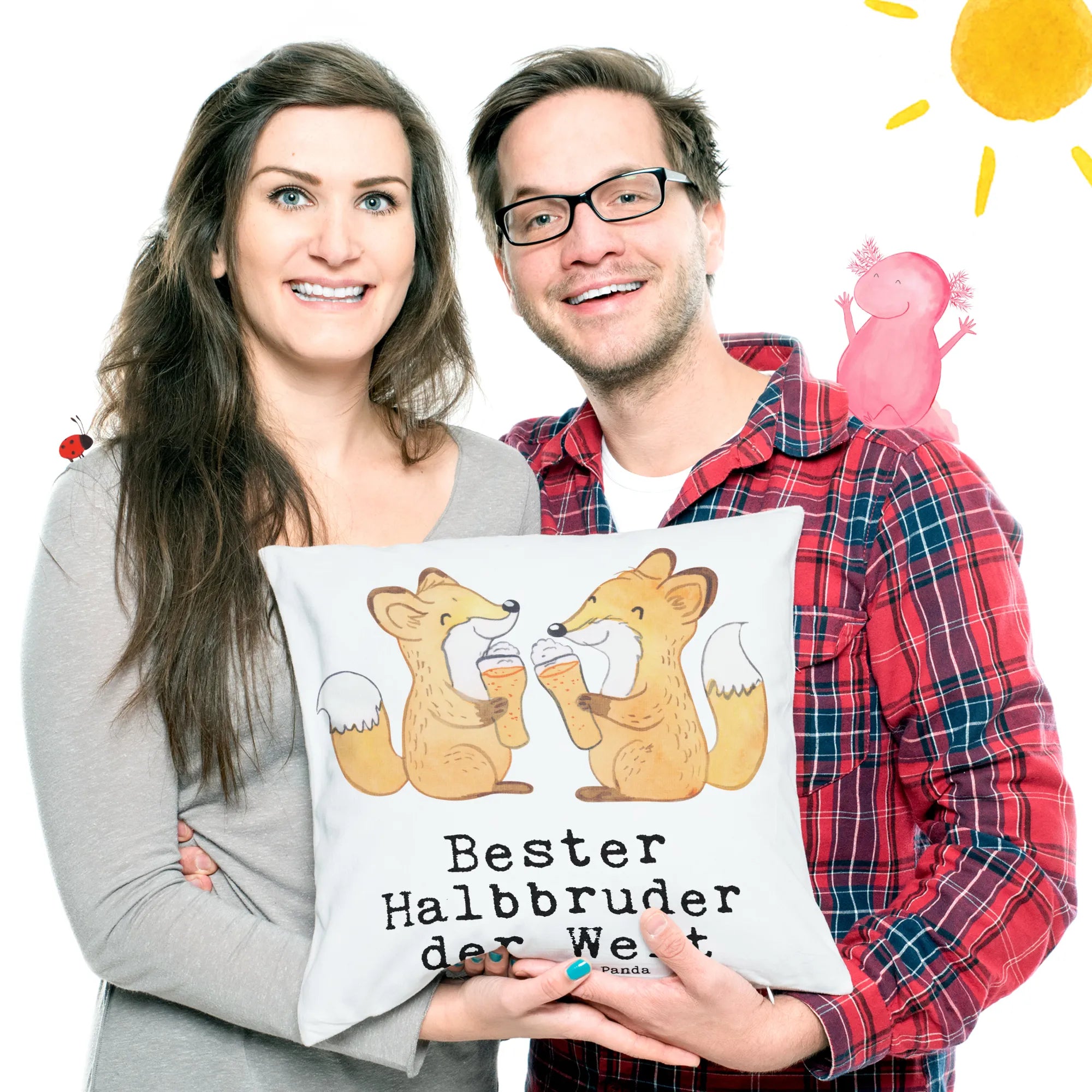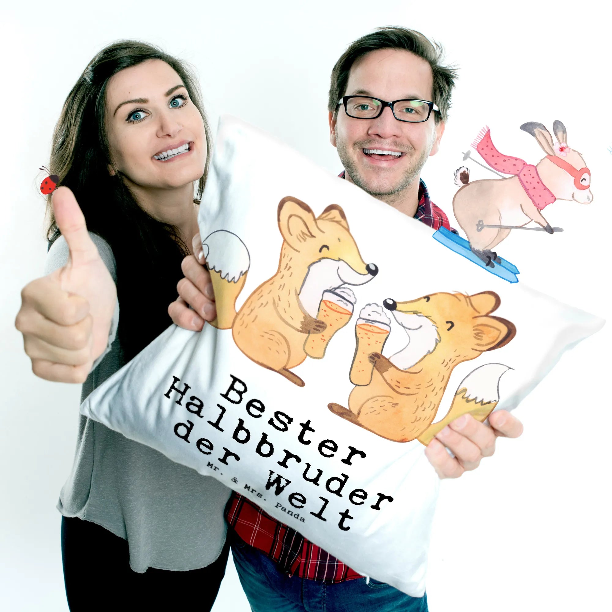 Das liebevoll gestaltete Motiv zeigt zwei süße Füchse, die sich fröhlich gegenübersitzen und mit einem Bier anstoßen - ein wirklich herzlicher Ausdruck der Geschwisterliebe. Die Kissenhülle ist mit dem Spruch "Bester Halbbruder der Welt" verziert, was es zu einem idealen Geschenk für besondere Anlässe macht. Egal, ob zum Geburtstag, zu Dankeschöns oder einfach nur so, um deinem Halbbruder eine Freude zu machen - dieses Kissen ist immer eine gute Wahl.