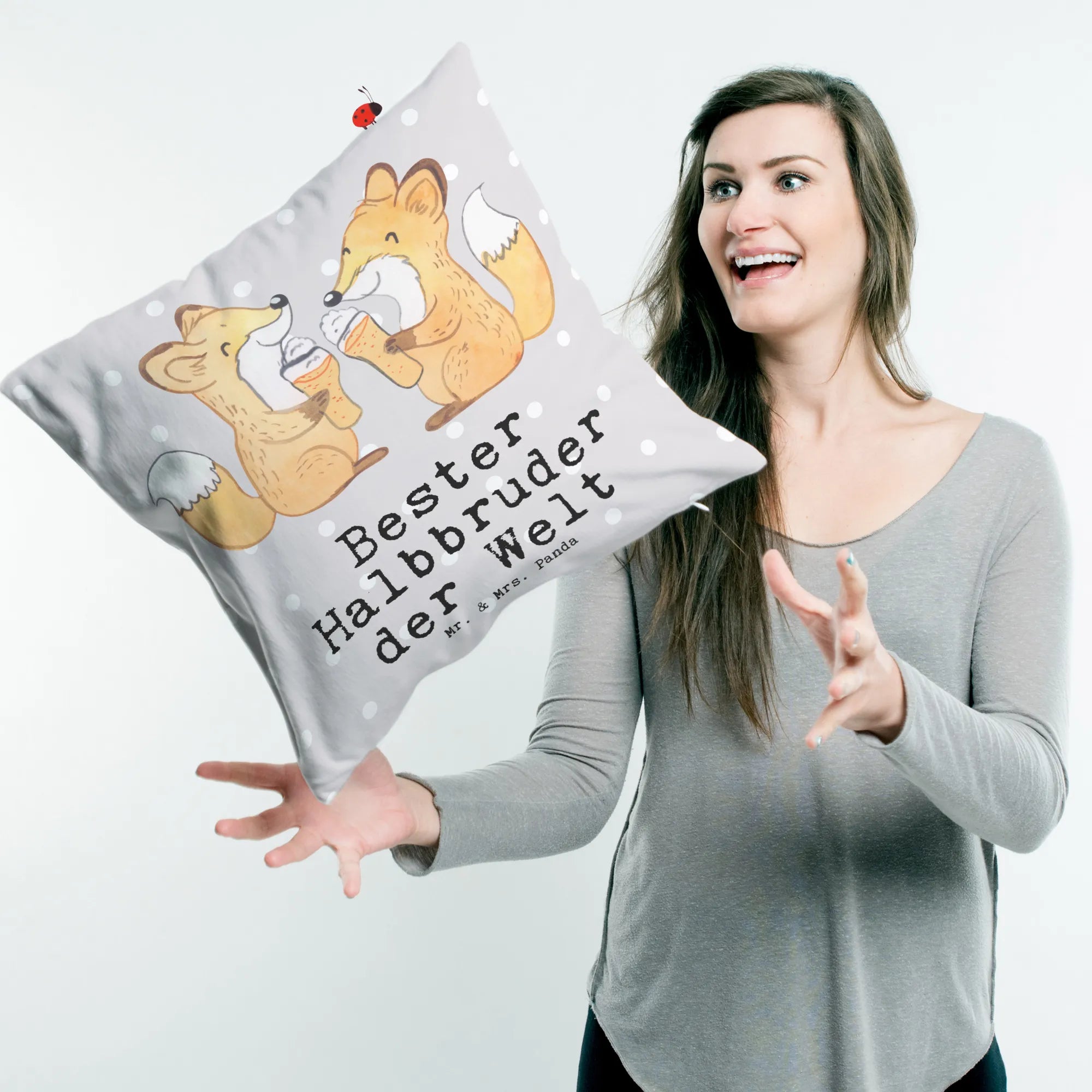 Mit einem praktischen Reißverschluss ausgestattet, kannst du die Füllung leicht entnehmen und die Kissenhülle bei bis zu 30°C waschen, um die Farben strahlend frisch zu halten. Jedes Mal, wenn dein Halbbruder auf dieses Kissen sieht, wird er an die besonderen Momente und die enge Bindung zwischen euch erinnert. Es ist perfekt als Sofakissen oder Dekokissen geeignet und verleiht jedem Raum einen persönlichen Touch. Wenn du also nach einem einzigartigen Geschenk für deinen Bruder, Stiefbruder oder Halbbruder suchst, ist das Kissen "Fuchs Bester Halbbruder der Welt" von Mr. & Mrs. Panda die ideale Wahl!