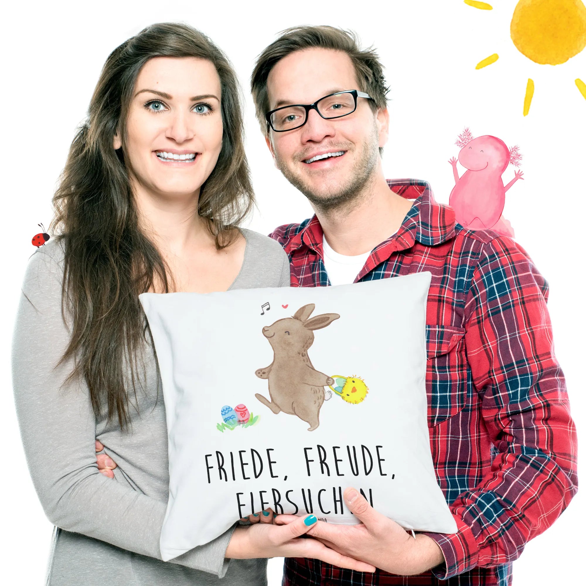 Die Ostern - Kollektion von Mr. & Mrs. Panda umfasst liebevoll gestaltete Motive und Sprüche, die alle mit viel Herz und Aquarell-Handzeichnung von Mrs. Panda entworfen wurden. Das Kissen besteht aus superflauschiger Mikrofaser, die nicht nur angenehm weich ist, sondern auch pflegeleicht. Dank des Reißverschlusses kannst du die Füllung leicht entnehmen und den Kissenbezug bei maximal 30°C waschen – so bleibt dein Kissen immer strahlend schön!