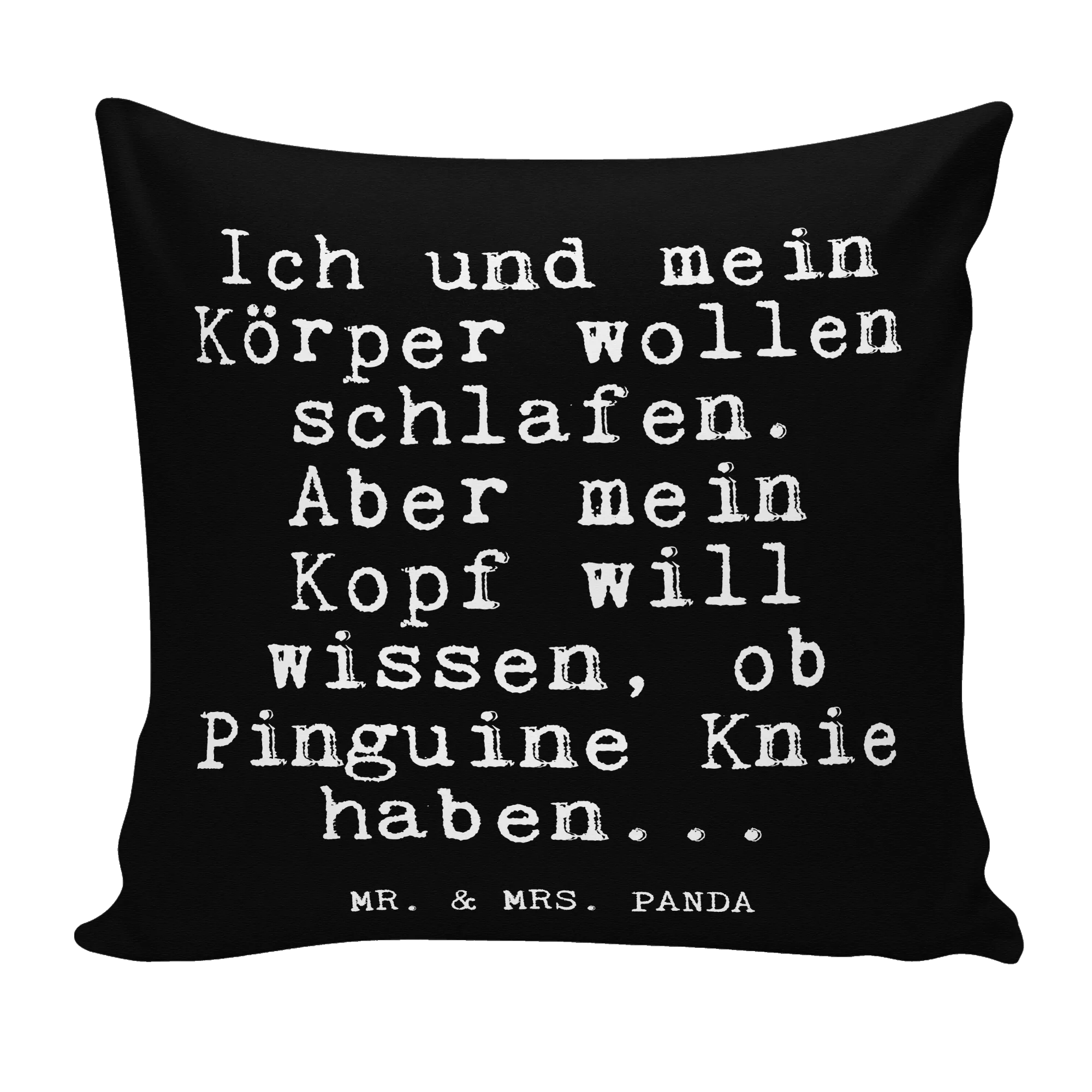 Entdecke das perfekte Kuschelkissen von Mr. & Mrs. Panda! Diese 40x40 Kissenhülle ist nicht nur ein gemütlicher Begleiter für dein Sofa, sondern überzeugt auch mit einem humorvollen Spruch: "Ich und mein Körper wollen schlafen. Aber mein Kopf will wissen, ob Pinguine Knie haben...". Ob als Dekokissen für dein Wohnzimmer, als Schlafkissen auf deinem Bett oder als lustiges Präsent für Freunde – dieses Kissen ist vielseitig einsetzbar.