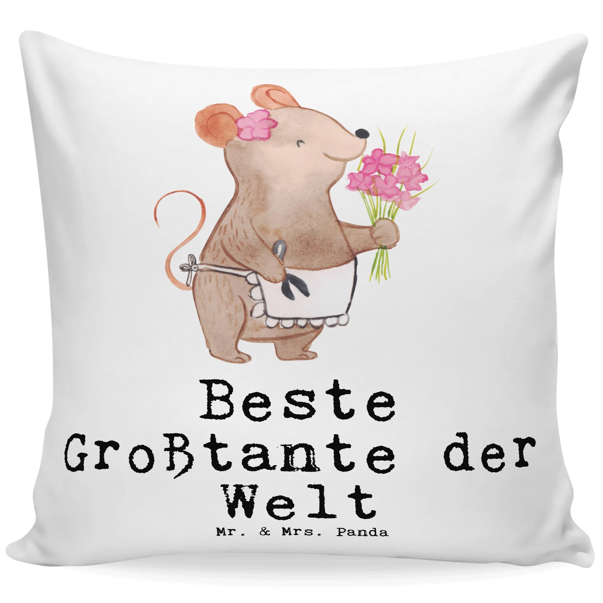 Das Kissen mit dem Motiv "Beste Großtante der Welt" ist ein absolutes Must-Have für alle, die ihrer geliebten Tante eine ganz besondere Freude machen wollen! Als Teil der wunderschönen Kollektion Beziehungen von Mr. & Mrs. Panda, wurde dieses 40x40 Kissen aus superfluffiger Mikrofaser gefertigt, die besonders weich und kuschelig ist. Das liebevoll gestaltete Motiv zeigt eine süße Maus mit einer Schürze und einer Gartenschere in der Hand, stolz ihre Blumen präsentierend.