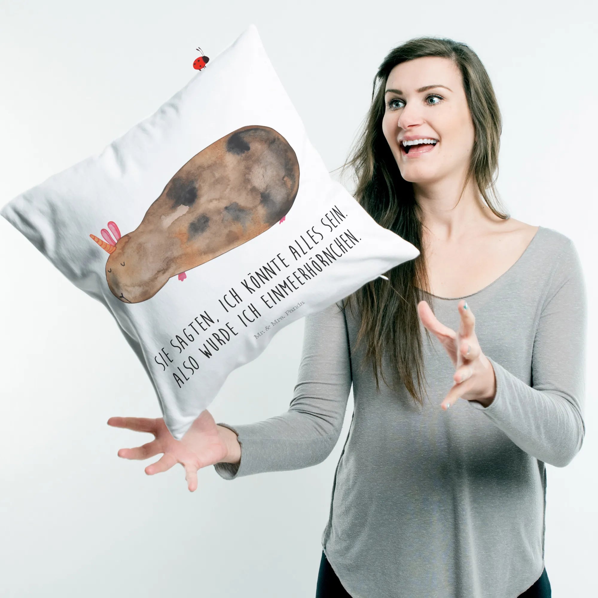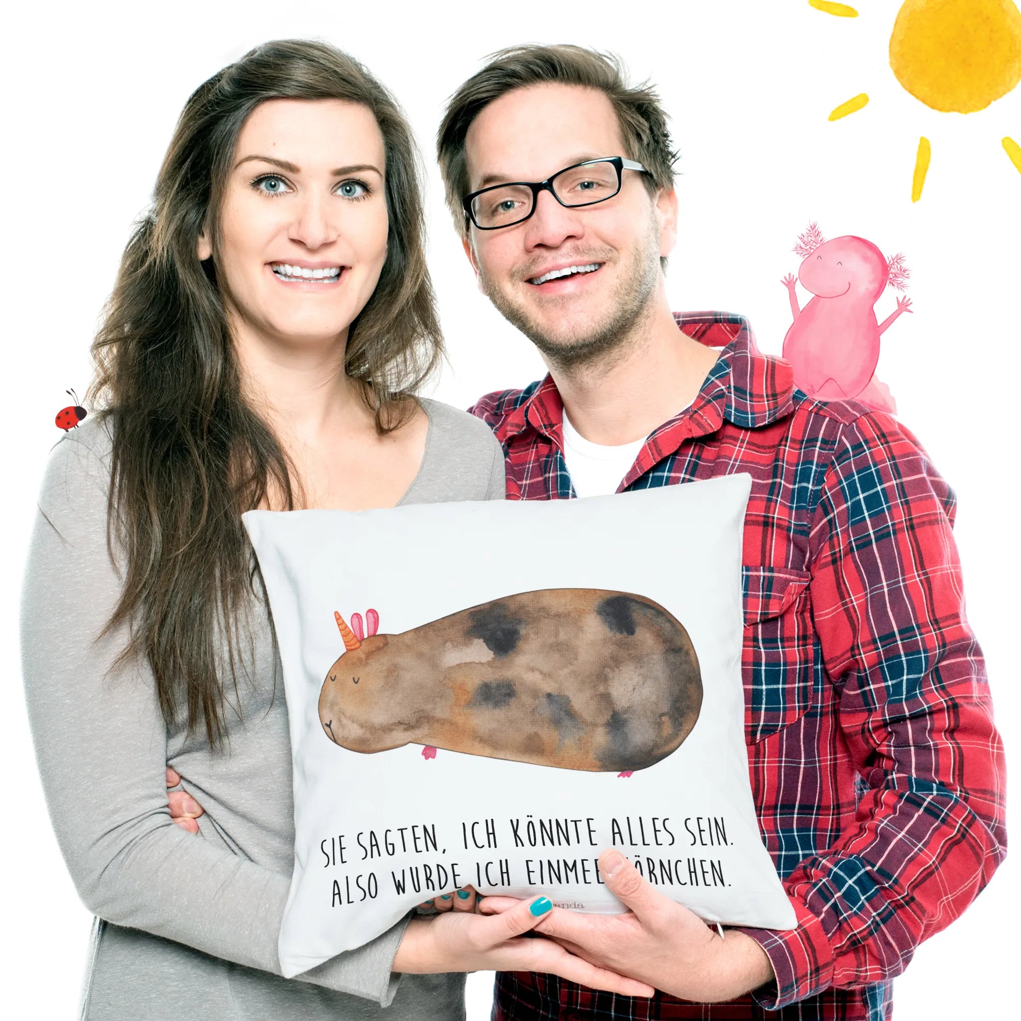 Das besondere Design zeigt ein süßes Meerhörnchen, das ein Lächeln auf dein Gesicht zaubern wird. Dieses handgezeichnete Motiv bringt die magische Welt der Einhörner direkt zu dir nach Hause und ist perfekt für alle, die bunte Akzente setzen möchten. Das Meerhörnchen, das auf dem Kissen zu sehen ist, trägt das Zitat: "Sie sagten, ich könnte alles sein. Also wurde ich ein Meerhörnchen." Ein echter Hingucker und Gesprächsstoff für deine Gäste!